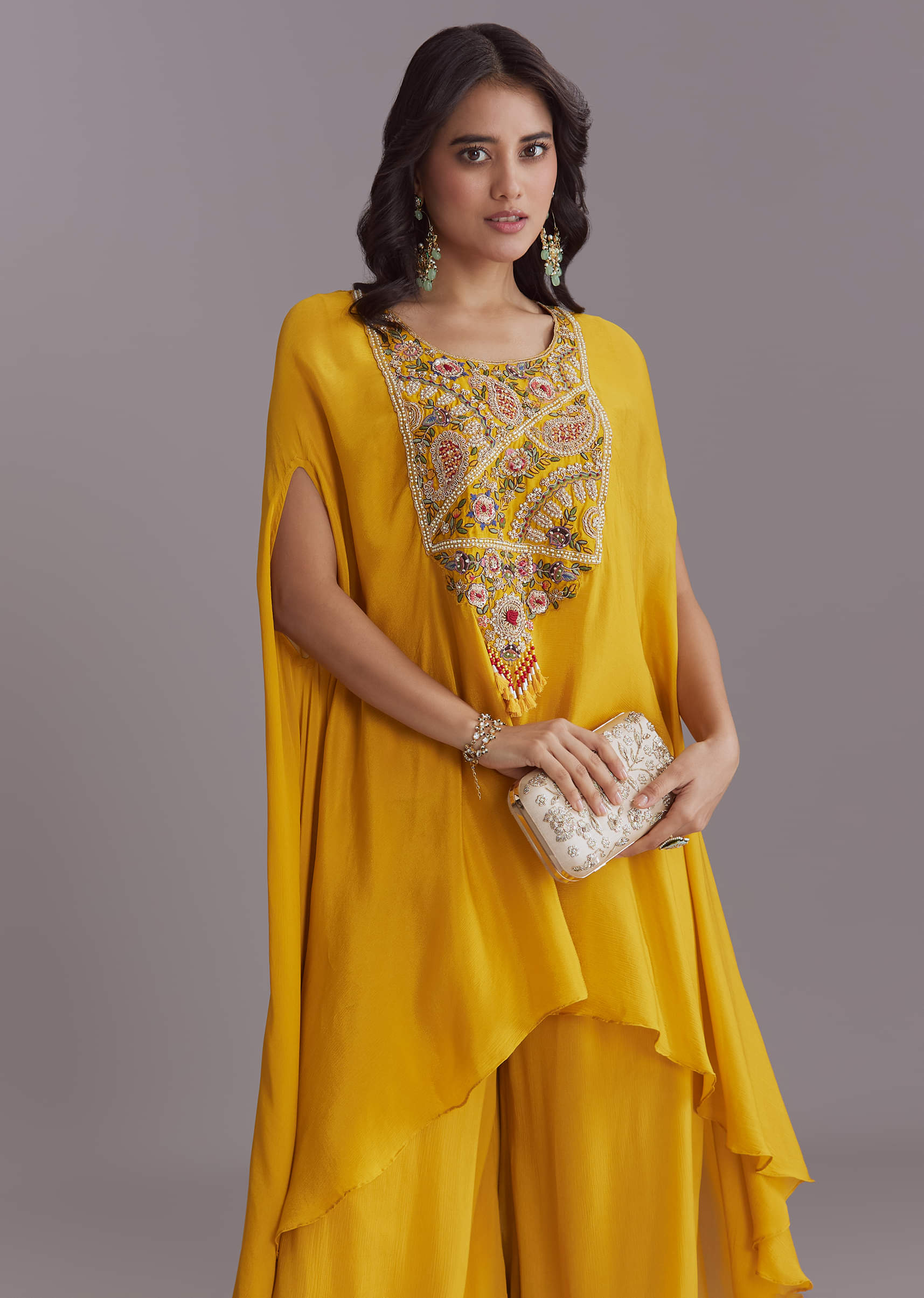 Sunshine tones bring cheerful energy, and this yellow chinon kaftan top and palazzo set with embroidery does it with ease. Subtle detailing lifts the flowy silhouette so it feels put... More Product Details
