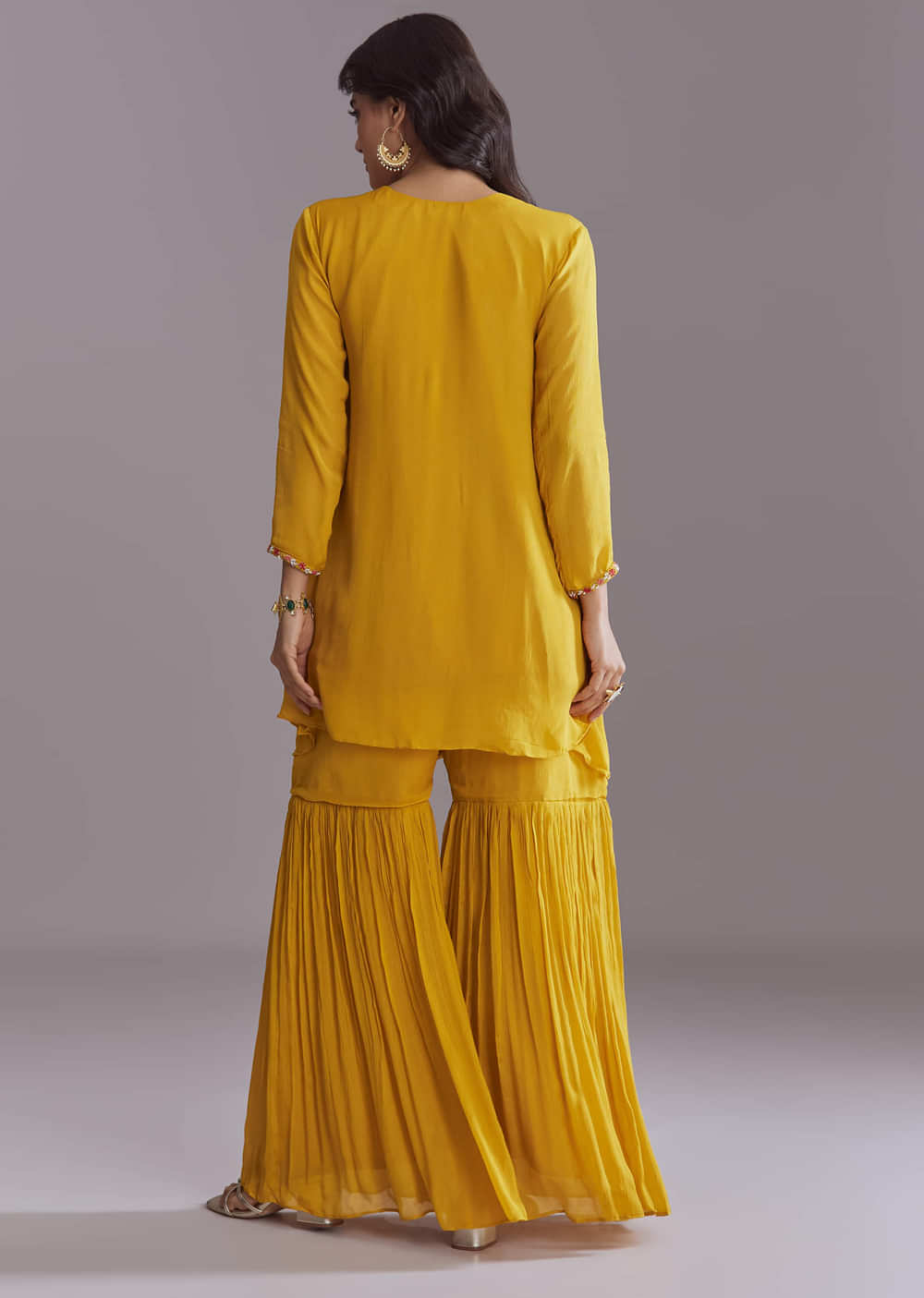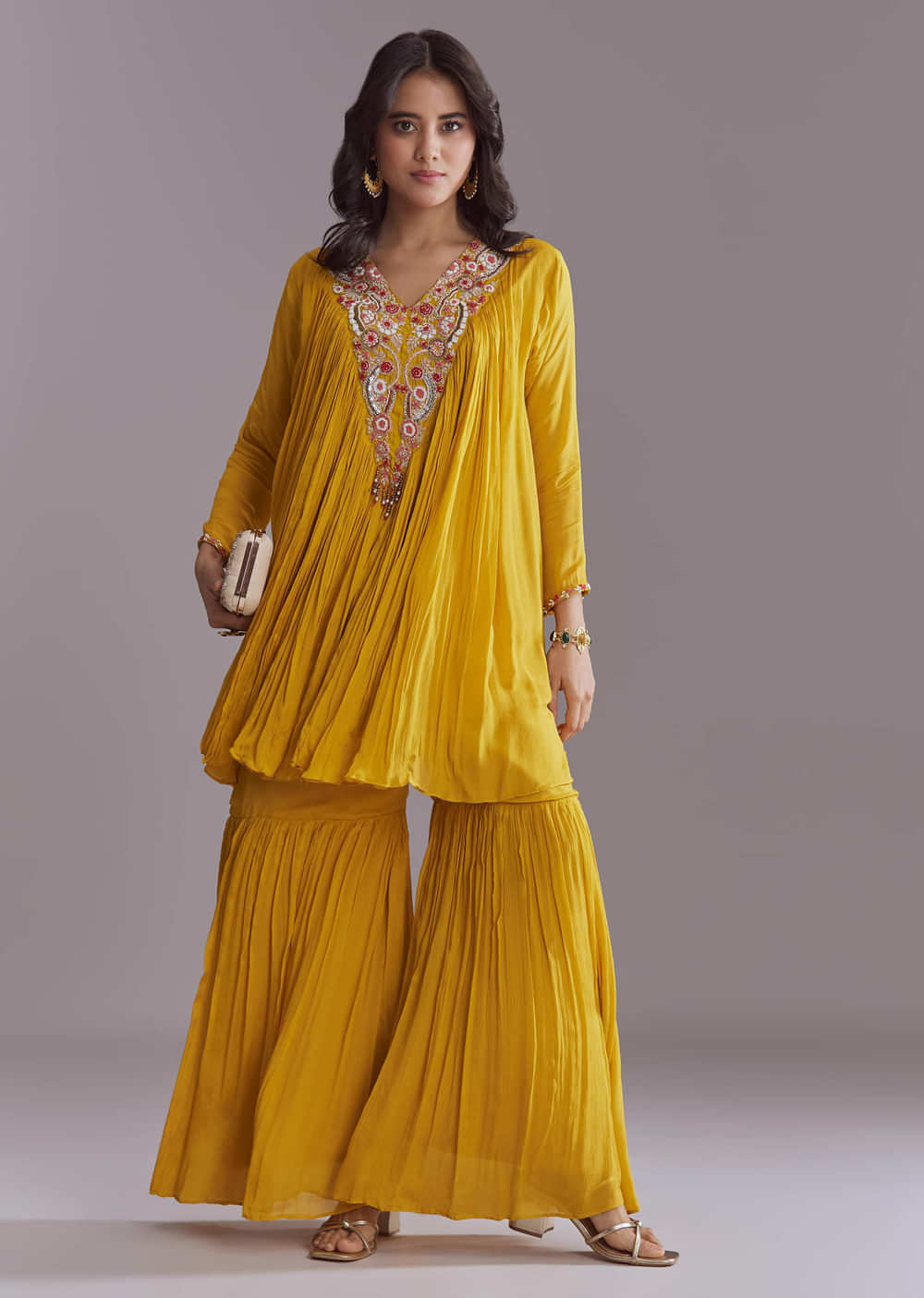 Colour-forward and comfortable, this yellow chinon sharara suit with embroidery blends a modern cut with traditional charm. Delicate work highlights the kurta while the flared sharara adds movement. A natural... More Product Details