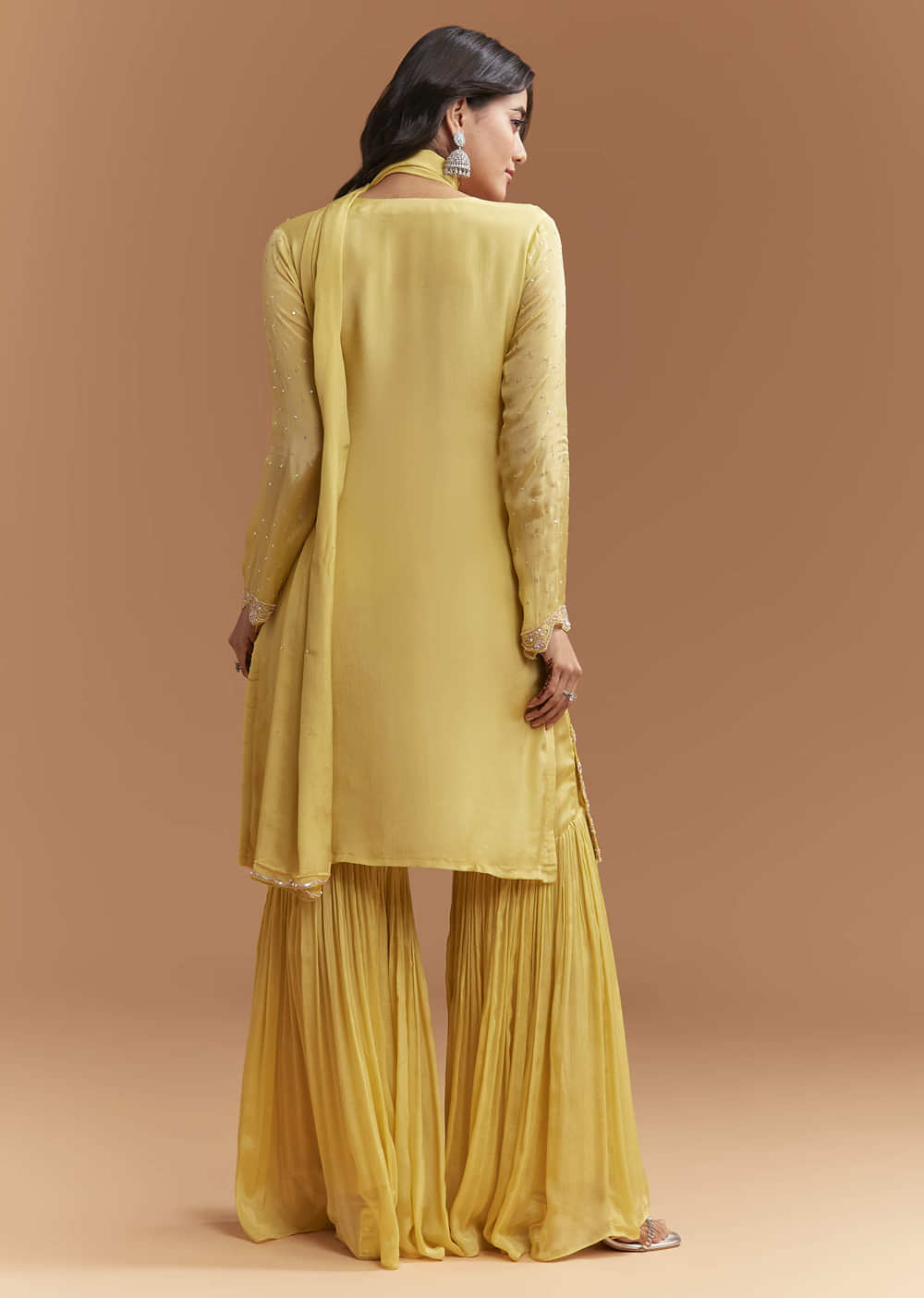 Yellow Chinon Sharara Suit With Sequins And Cutdana Work