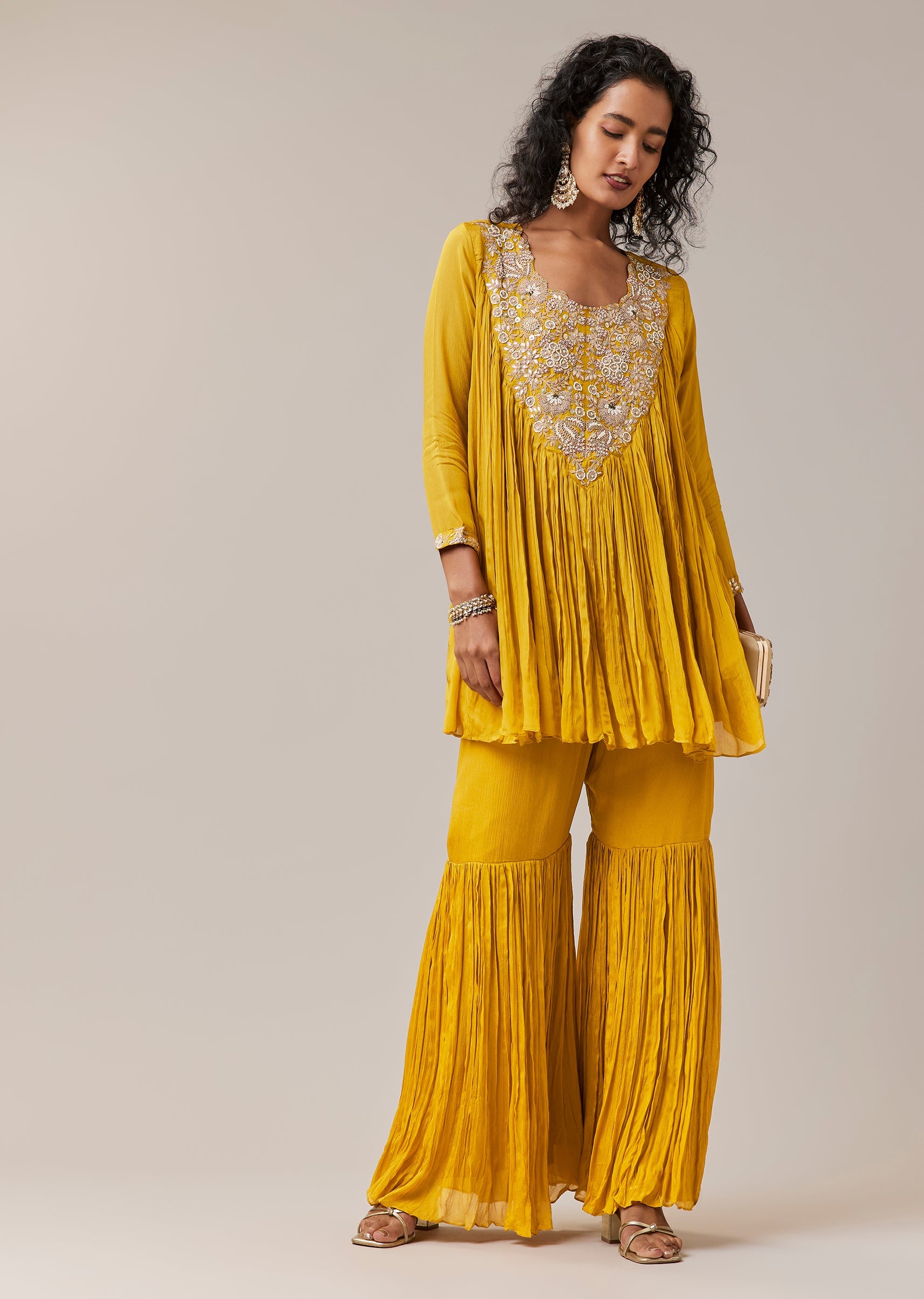 Yellow Chinon Zardozi Work Top and Sharara Set