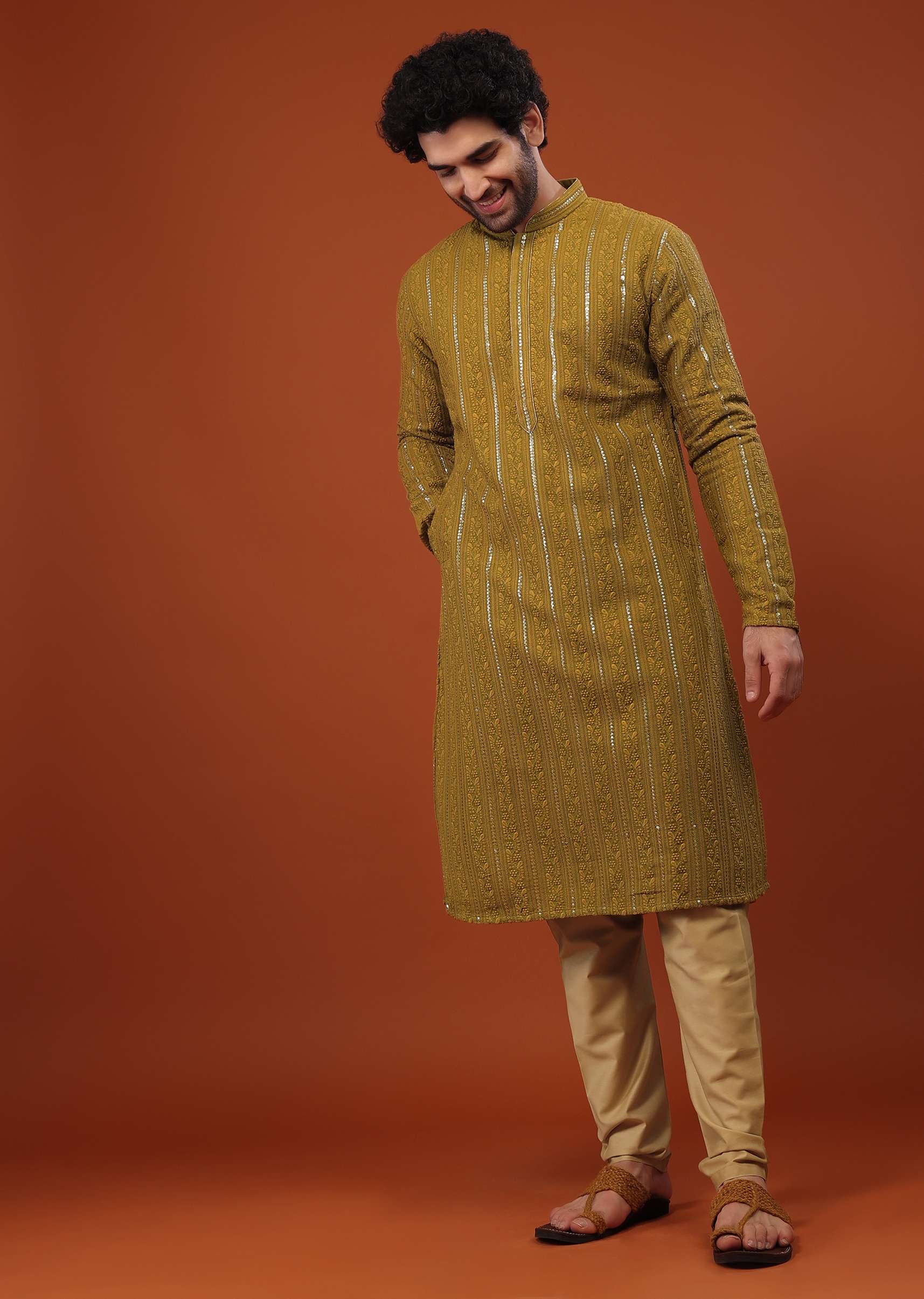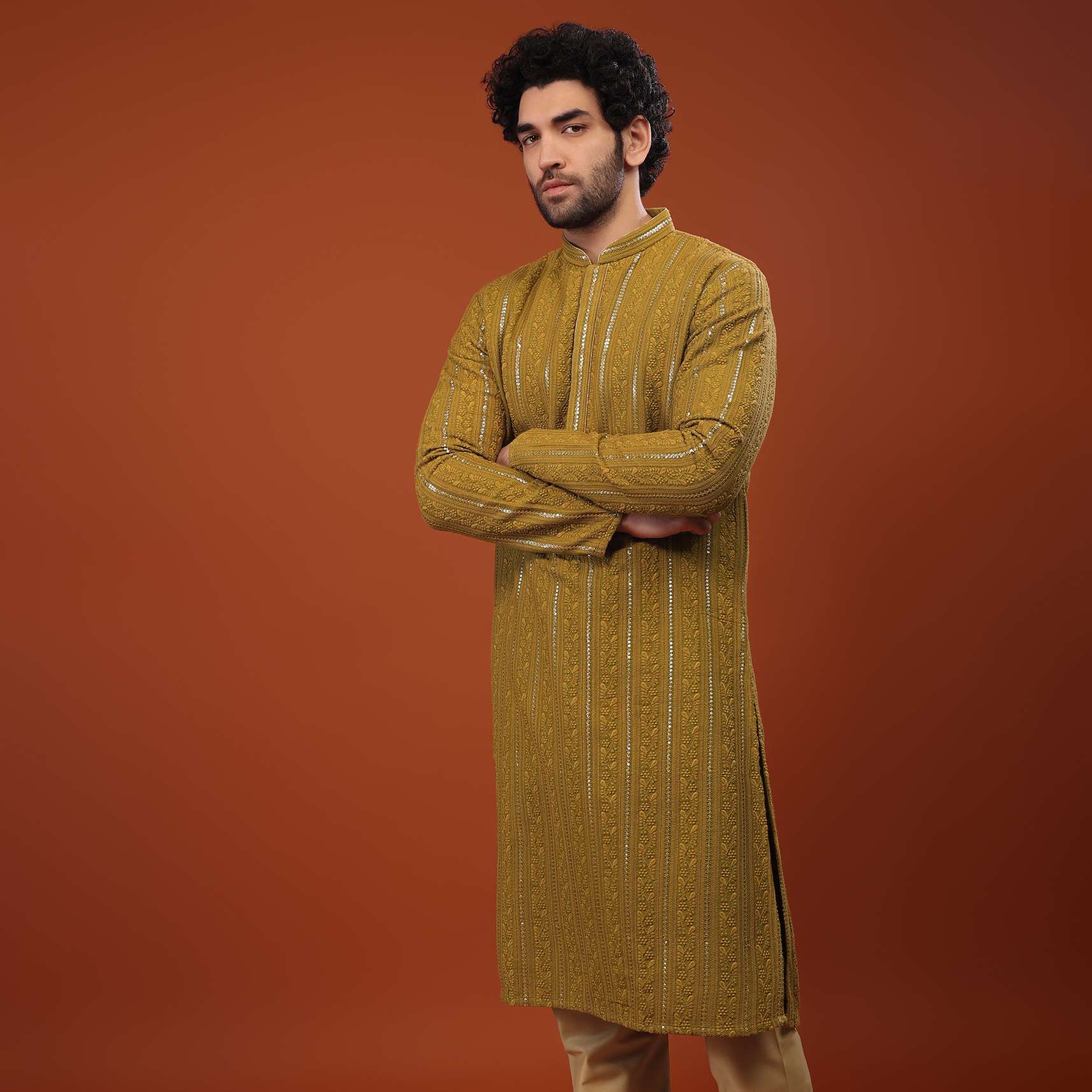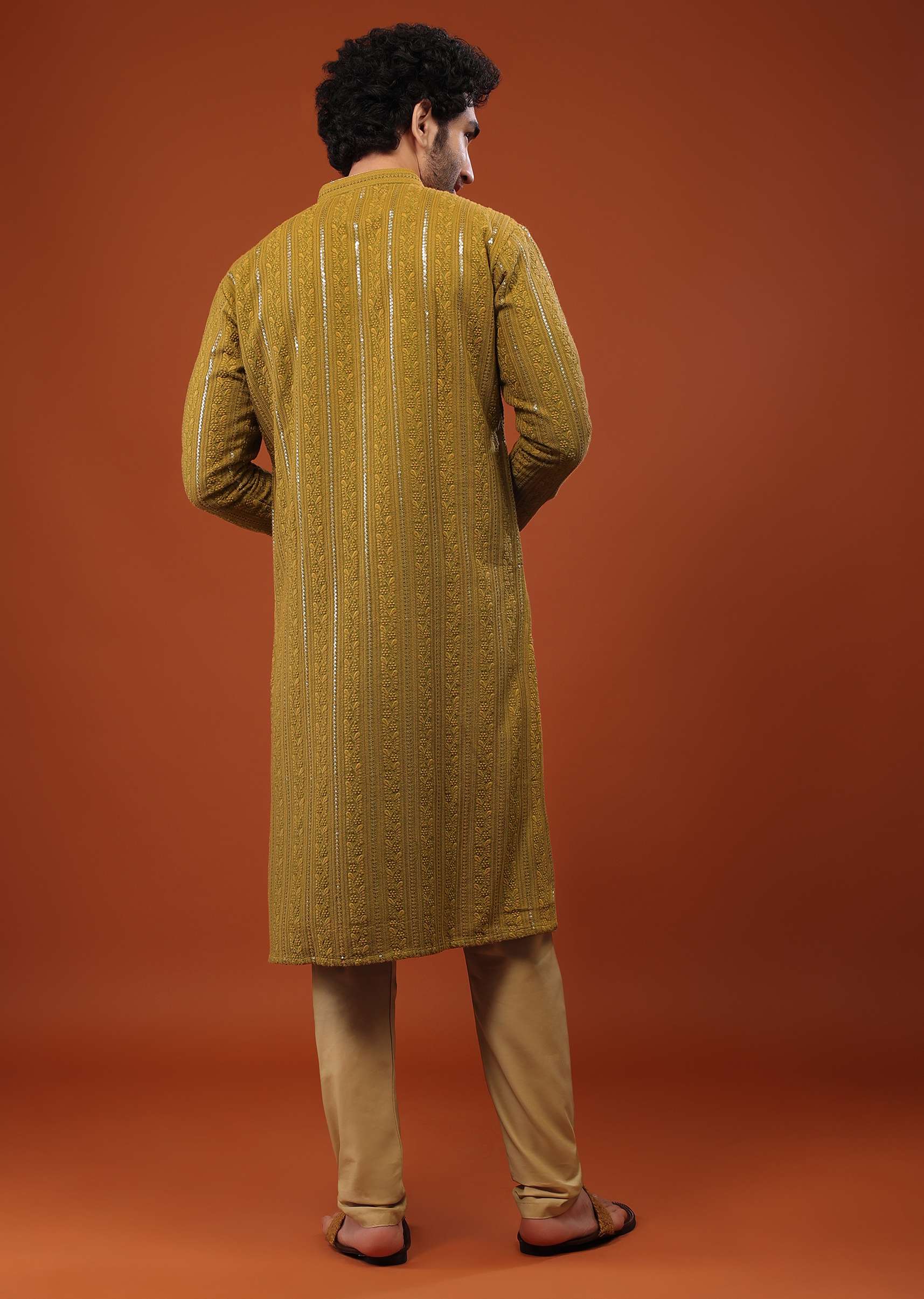 Yellow kurta fabricated in power loom cotton silk fabric. Designed in exquisite chikankari and sequins work. It comes in full sleeves and a mandarin collar neckline. It has a front... More Product Details