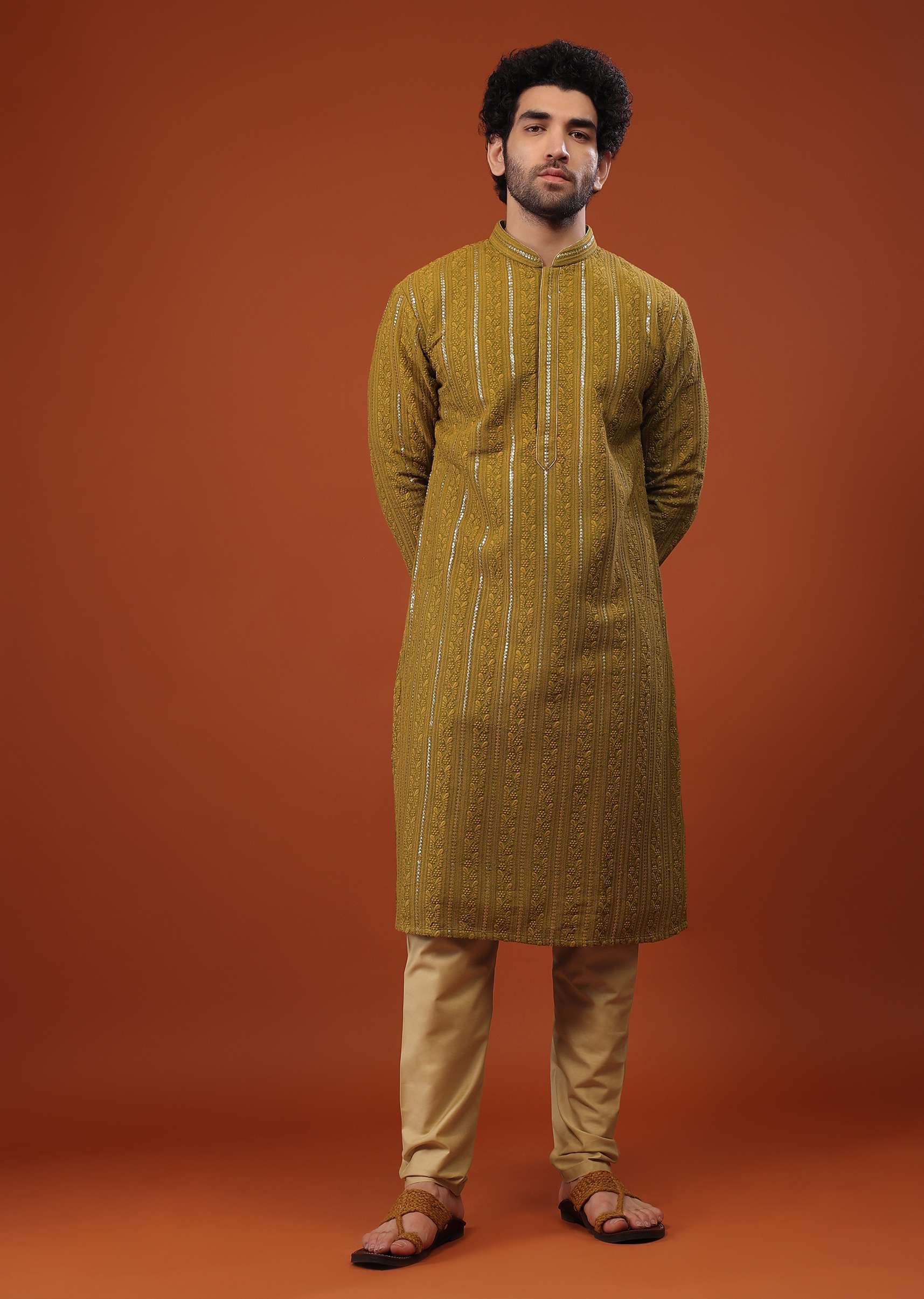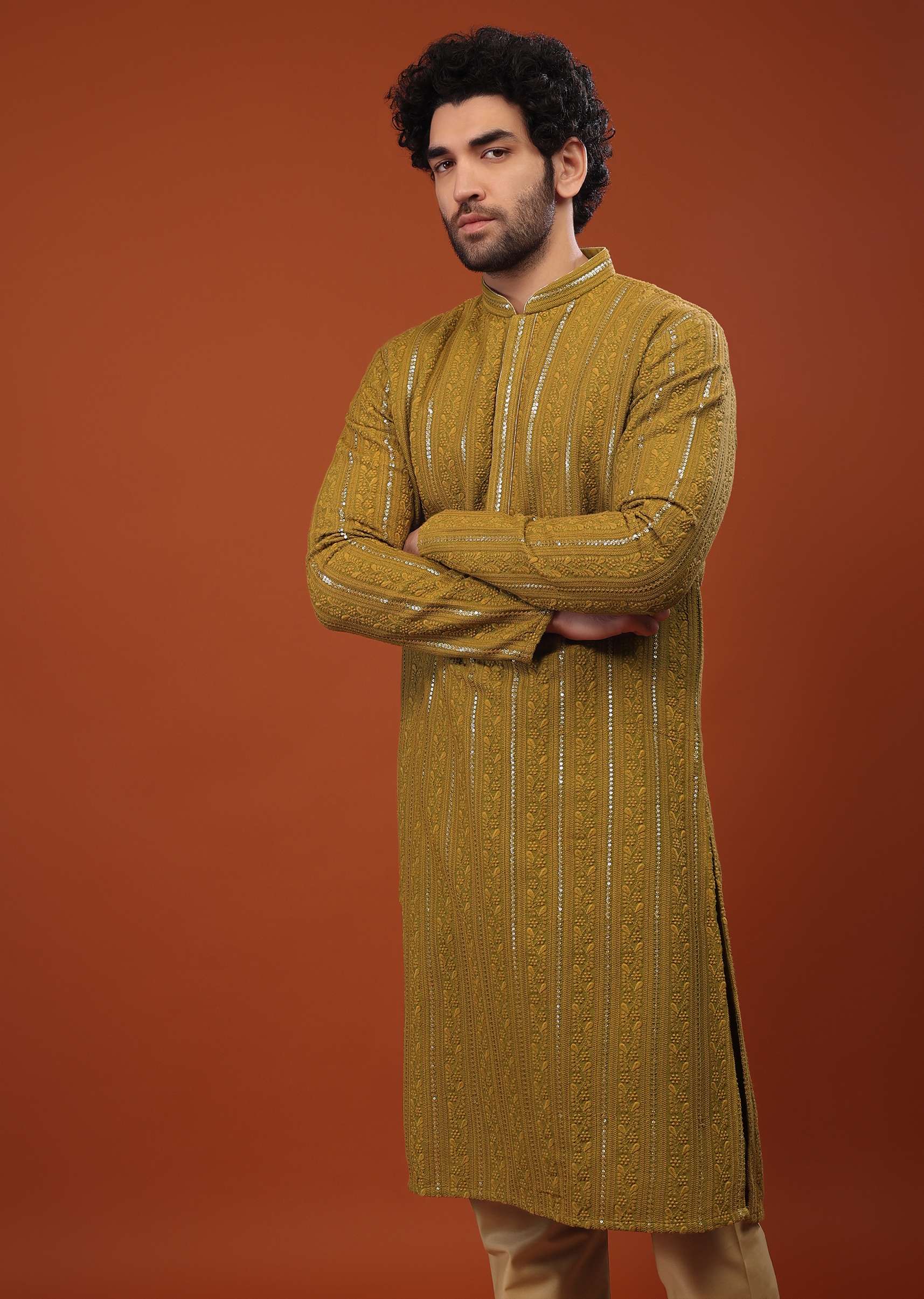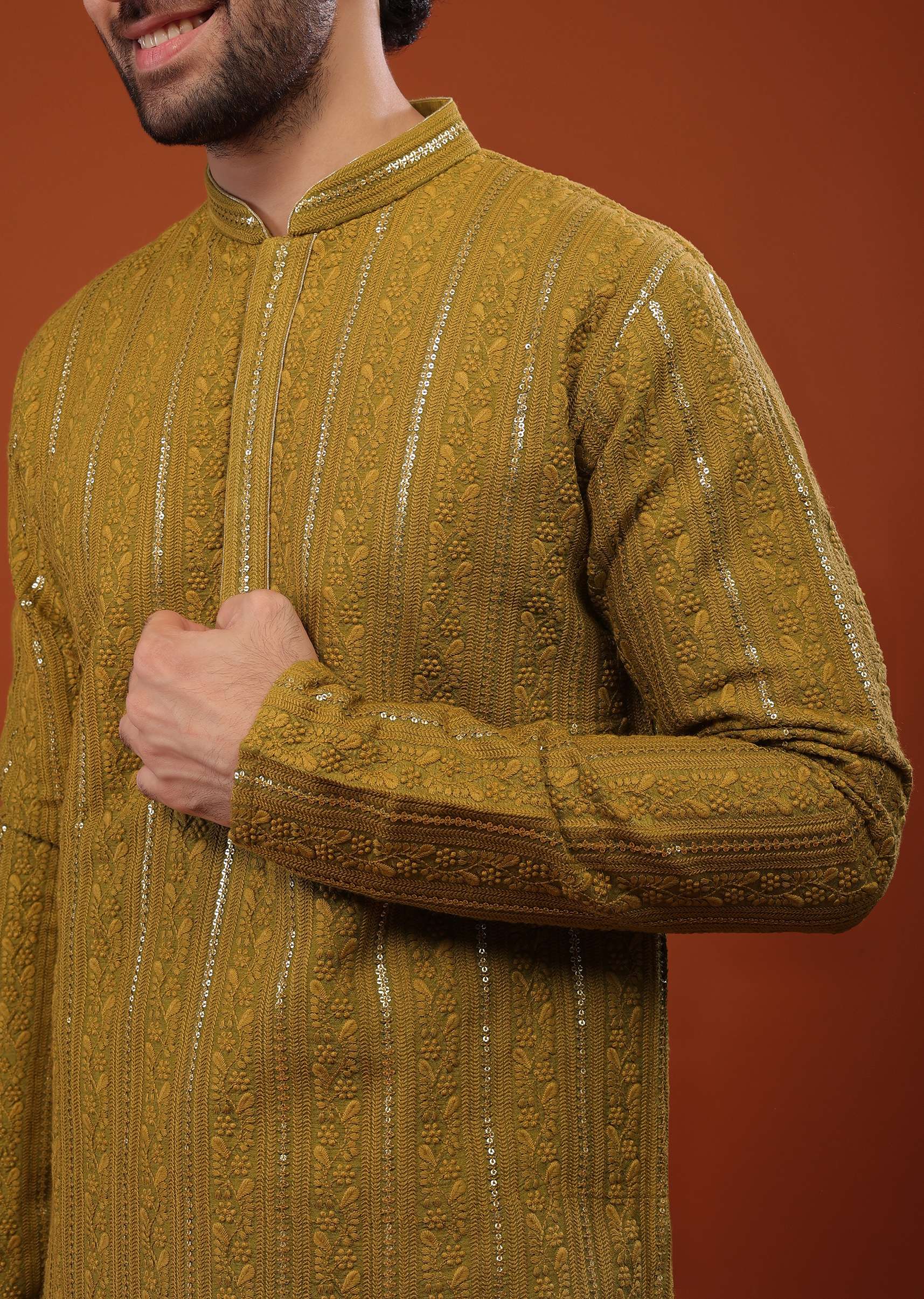 Yellow kurta fabricated in power loom cotton silk fabric. Designed in exquisite chikankari and sequins work. It comes in full sleeves and a mandarin collar neckline. It has a front... More Product Details