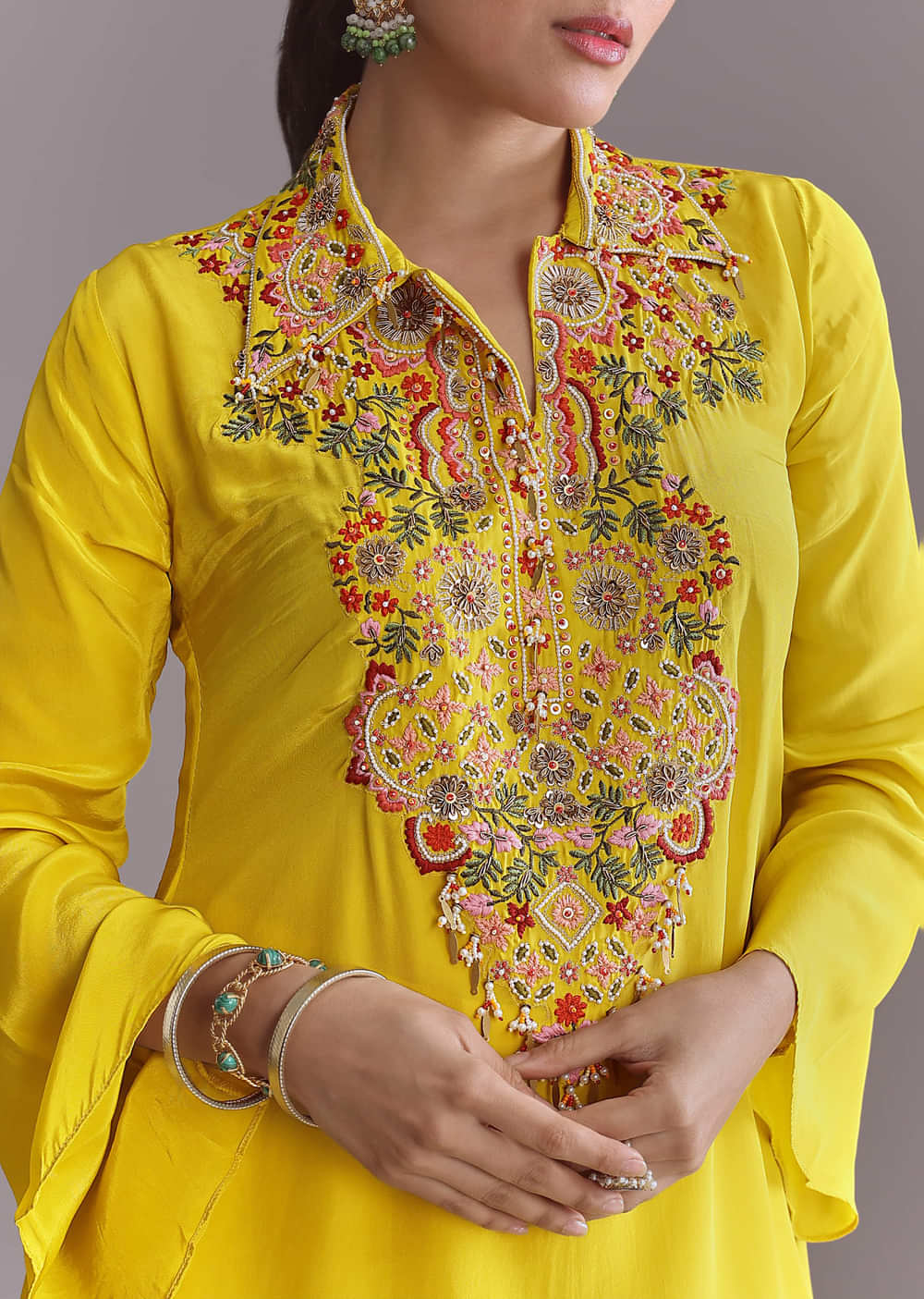 Yellow Crepe Palazzo Suit With Thread And Resham Work