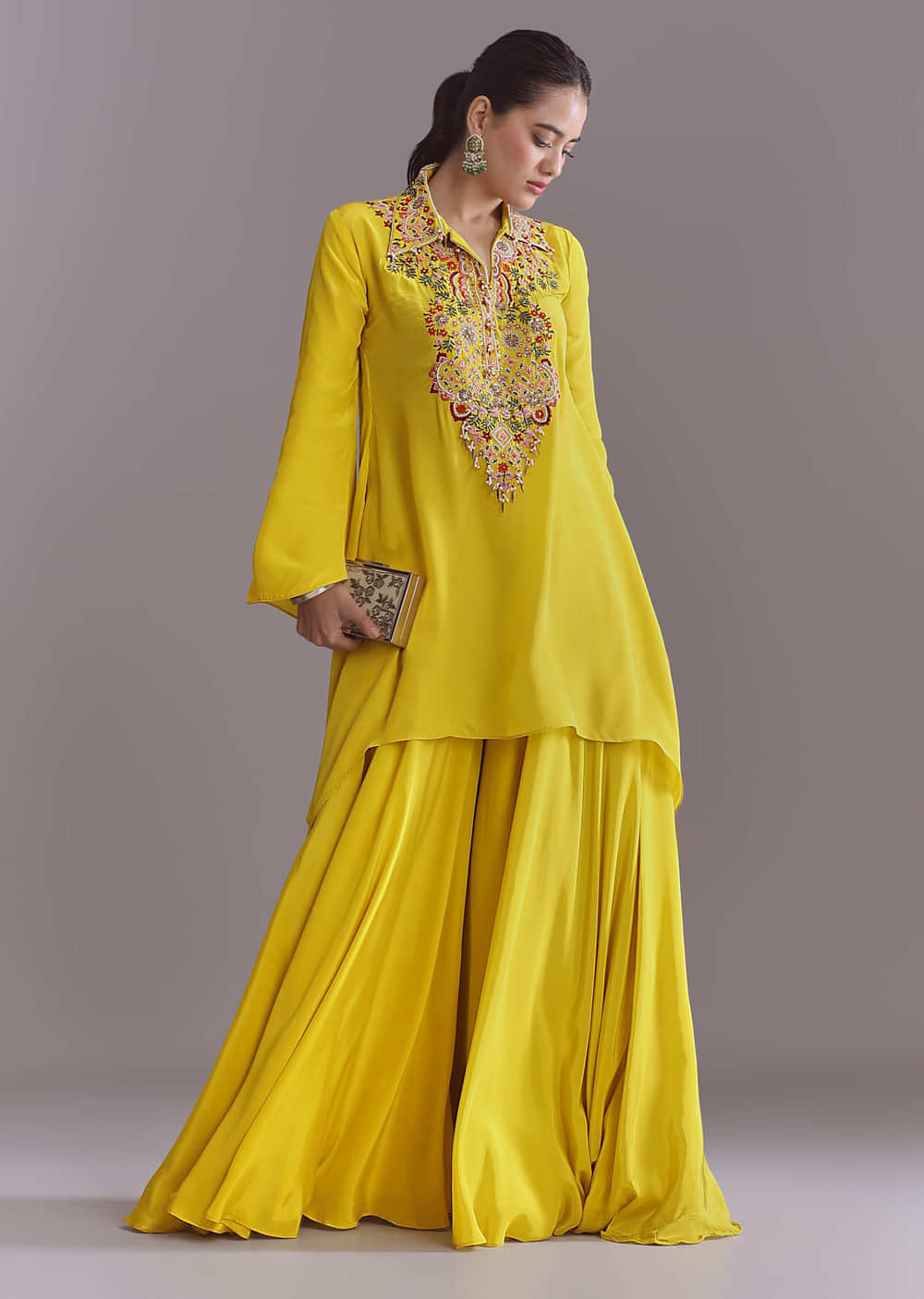 Cheerful and bright, this yellow crepe palazzo suit is a modern silhouette layered with traditional embroidery. Wide-leg trousers keep it easy while the kurta carries fine resham detail. A go-to... More Product Details
