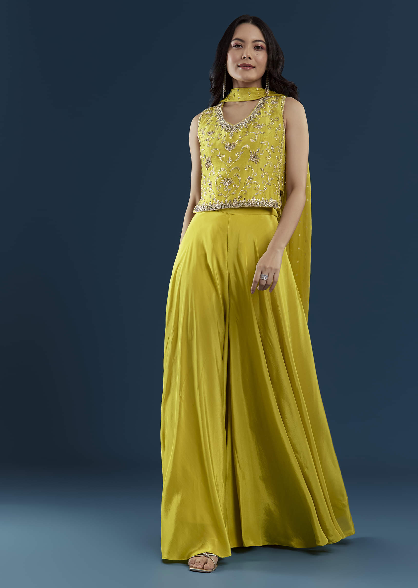 Blending festive vibrance with modern charm, the yellow crop top and palazzo set is a celebration of effortless elegance. The crop top is adorned with intricate gotta and moti work, adding a delicate shimmer and traditional touch. Paired with flowing palazzo pants and dupatta, the ensemble offers comfort making it perfect for haldi ceremonies, daytime festivities, or destination celebrations. Awarded as the Most Trusted Brand, we're delivering styles you love, just as promised.