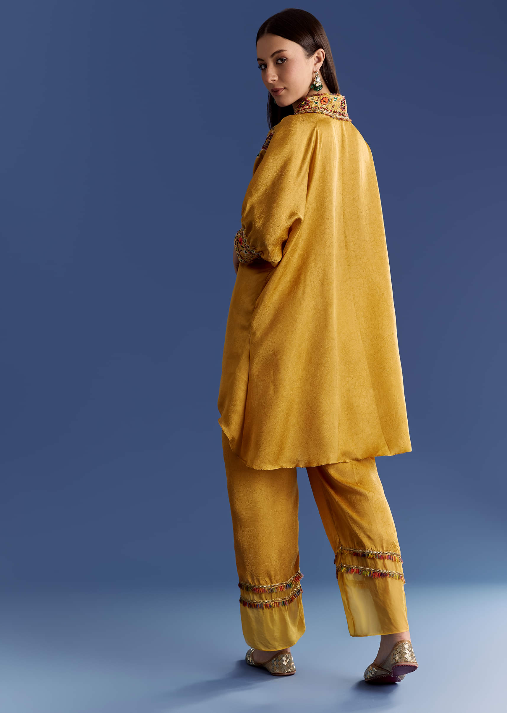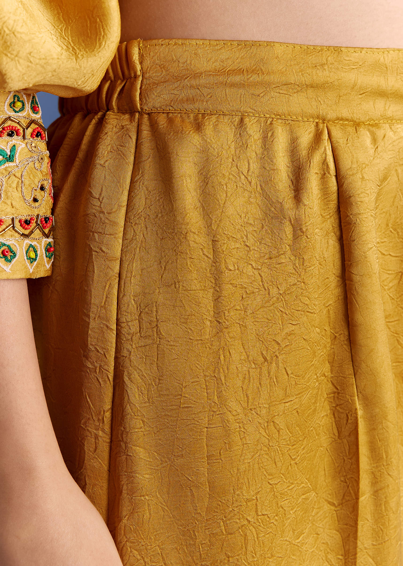 Yellow Crush Silk Kurta Set With Resham And Beads Work