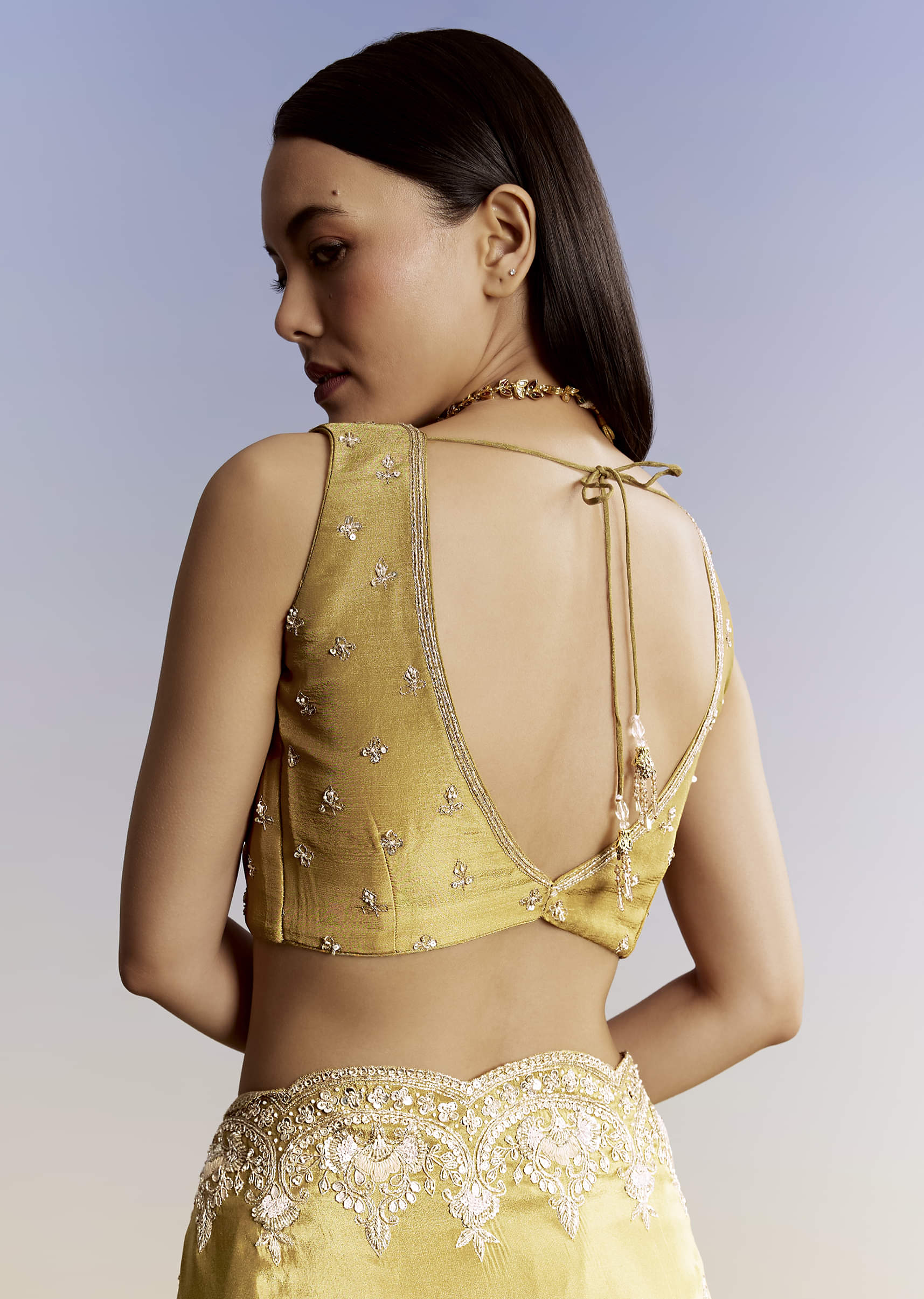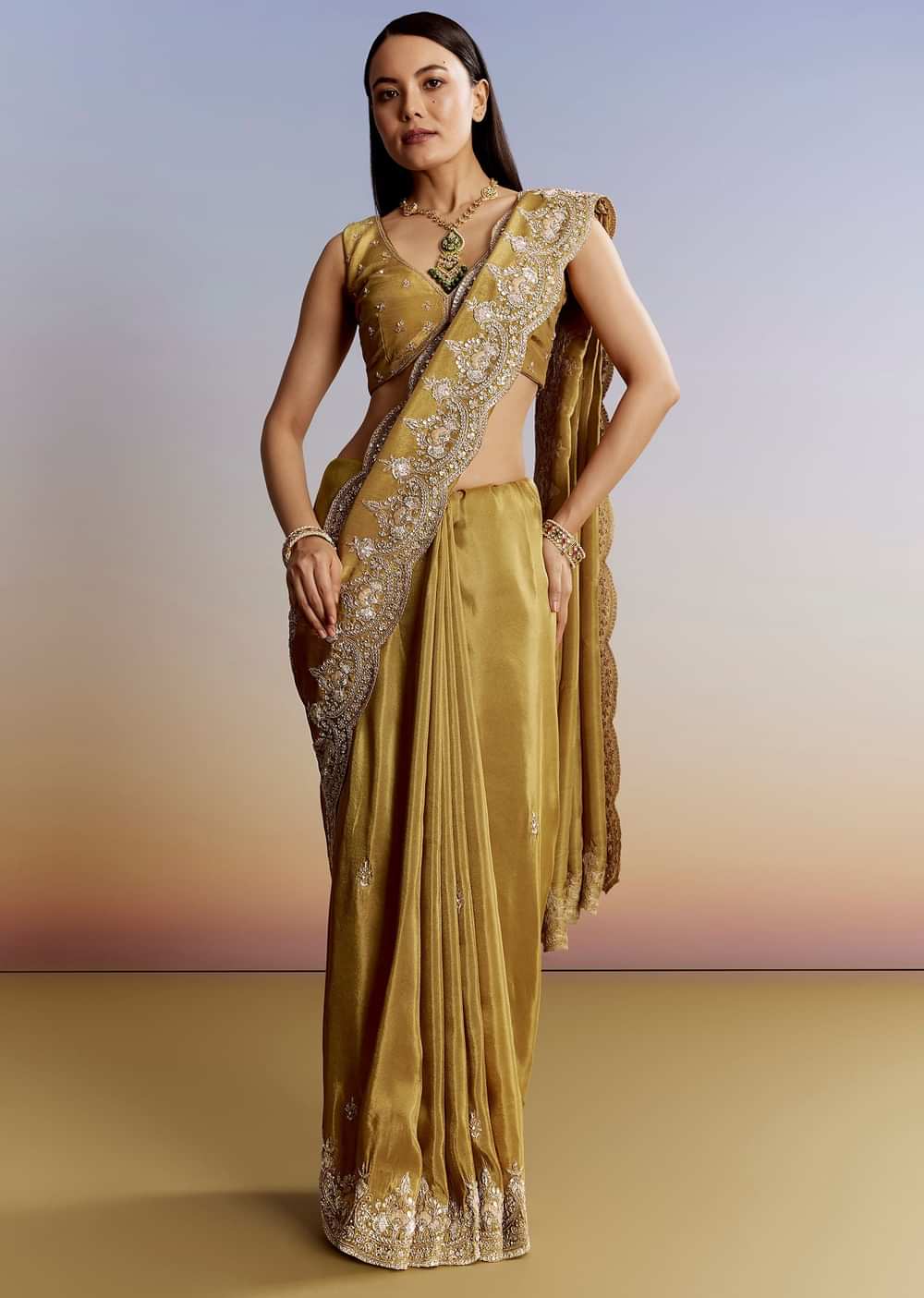 Yellow Crush Tissue Saree With Gota Zari And Beads Embroidery