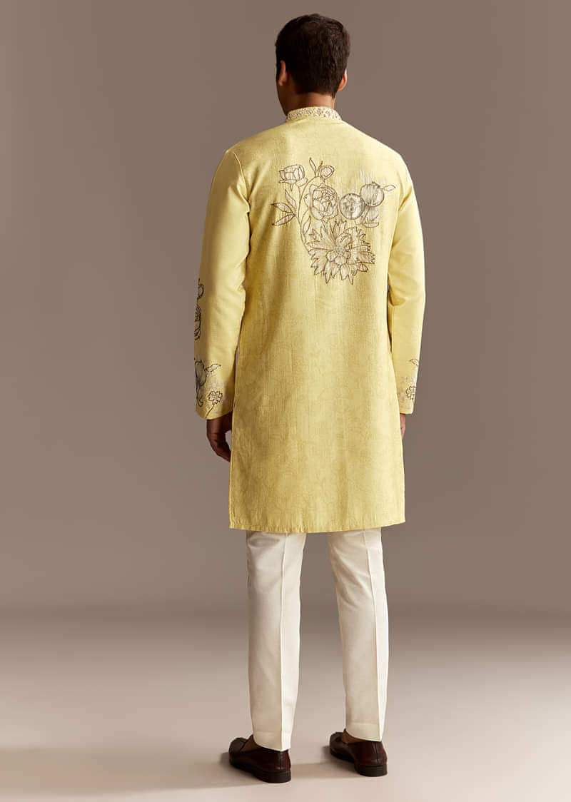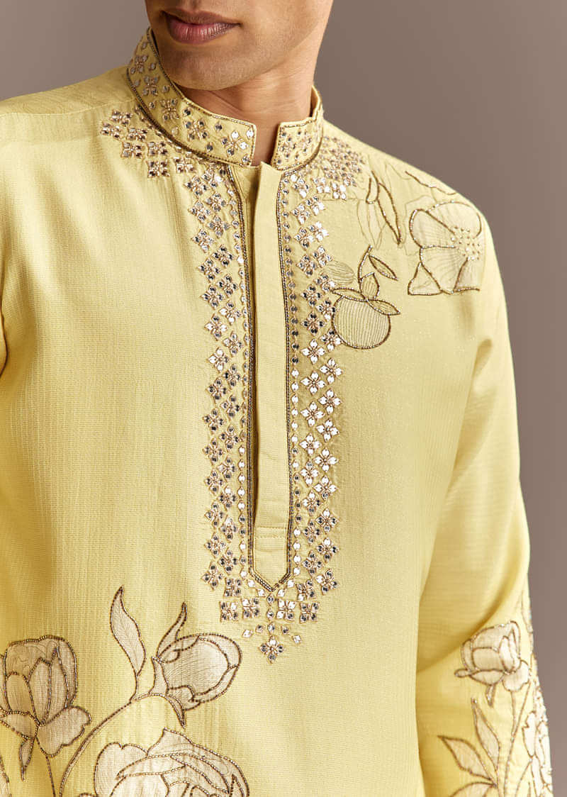 Radiate joy in this vibrant yellow kurta set made in art silk with intricate cutwork. Perfect for haldi and pooja ceremonies. Awarded as the Most Trusted Brand, we're delivering styles... More Product Details
