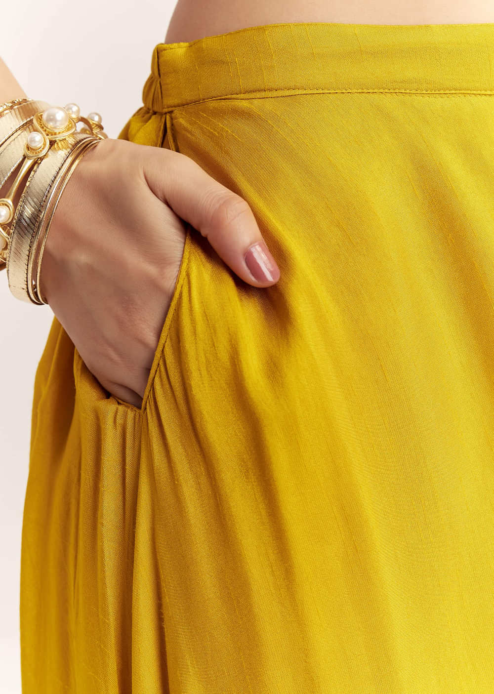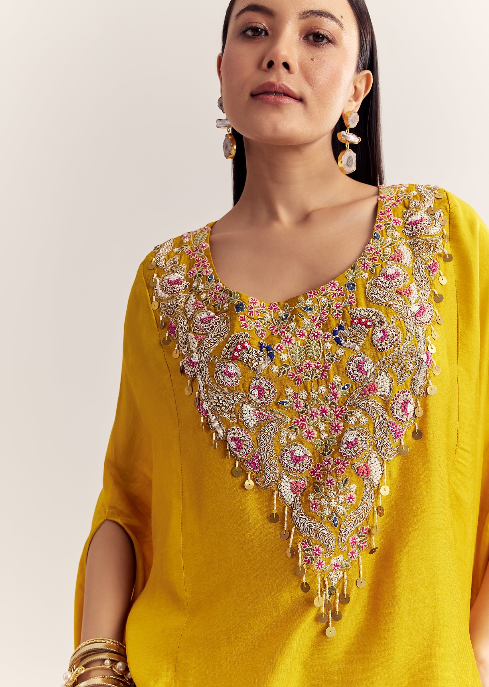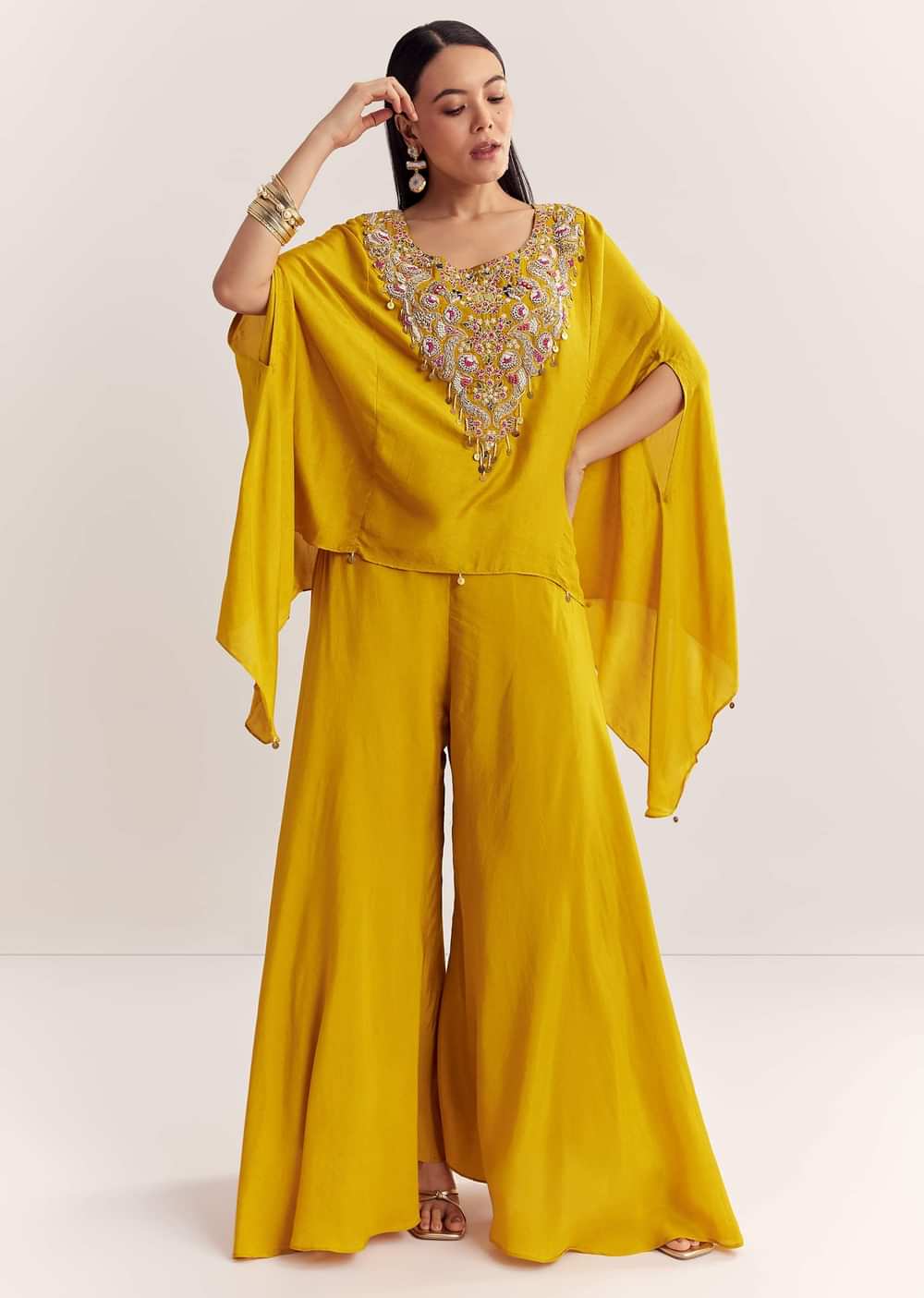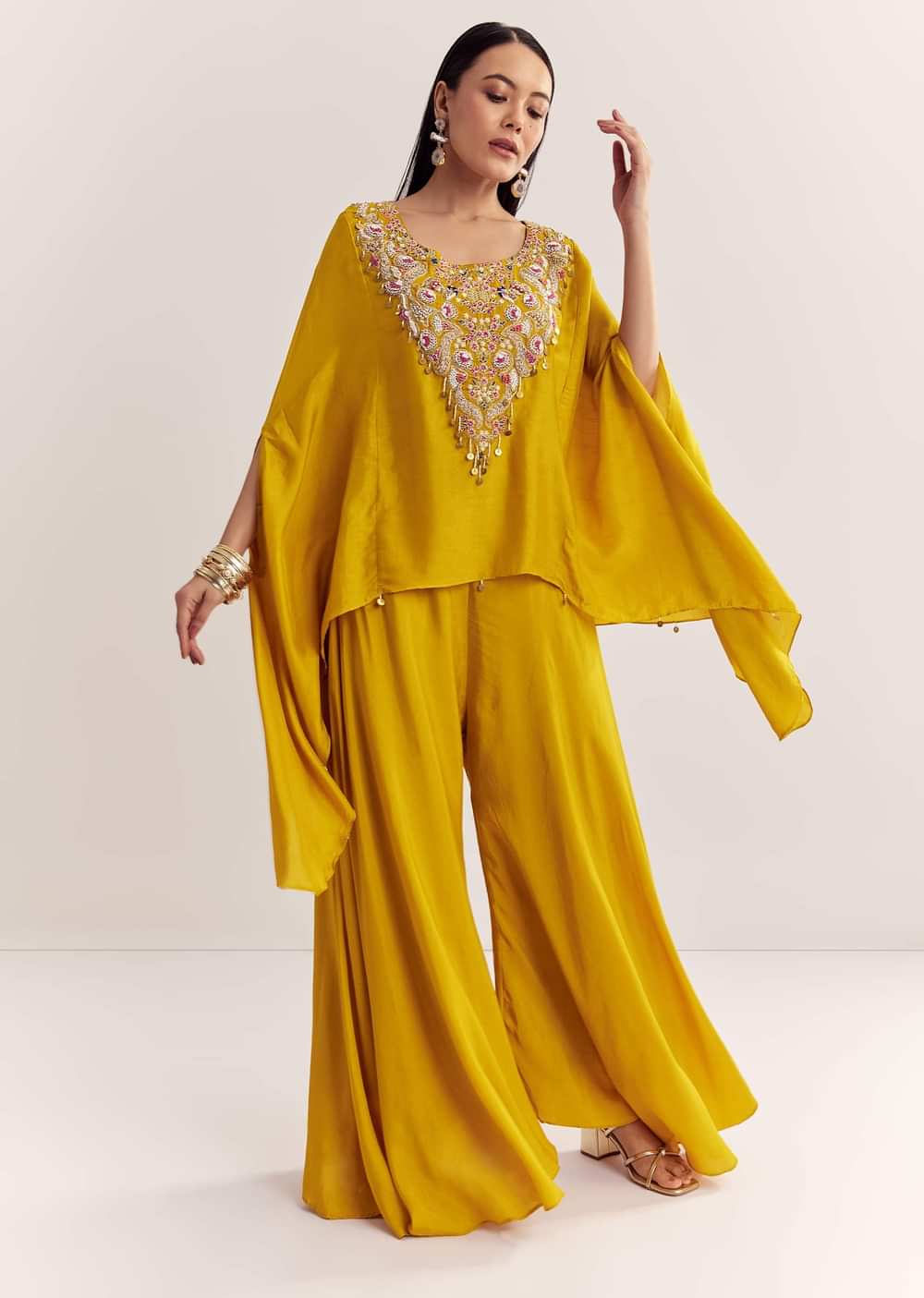This sunshine yellow cape kurta in dola silk brings festive joy alive, highlighted with intricate embroidery for radiant flair. Awarded as the Most Trusted Brand, we're delivering styles you love, just as promised.