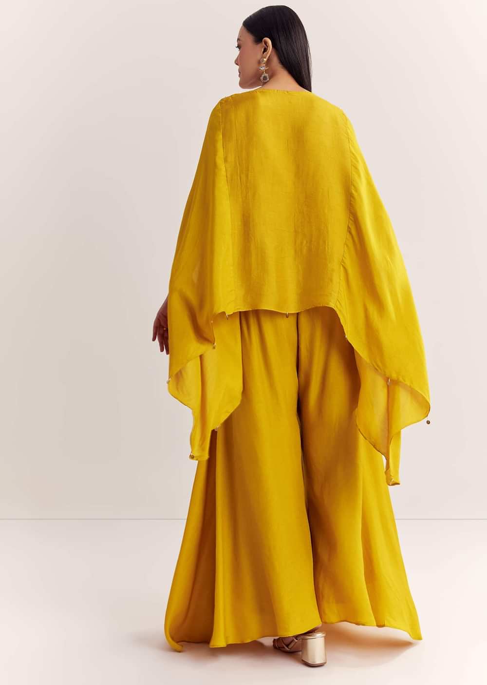 Yellow Dola Silk Cape Kurta Set With Embroidery