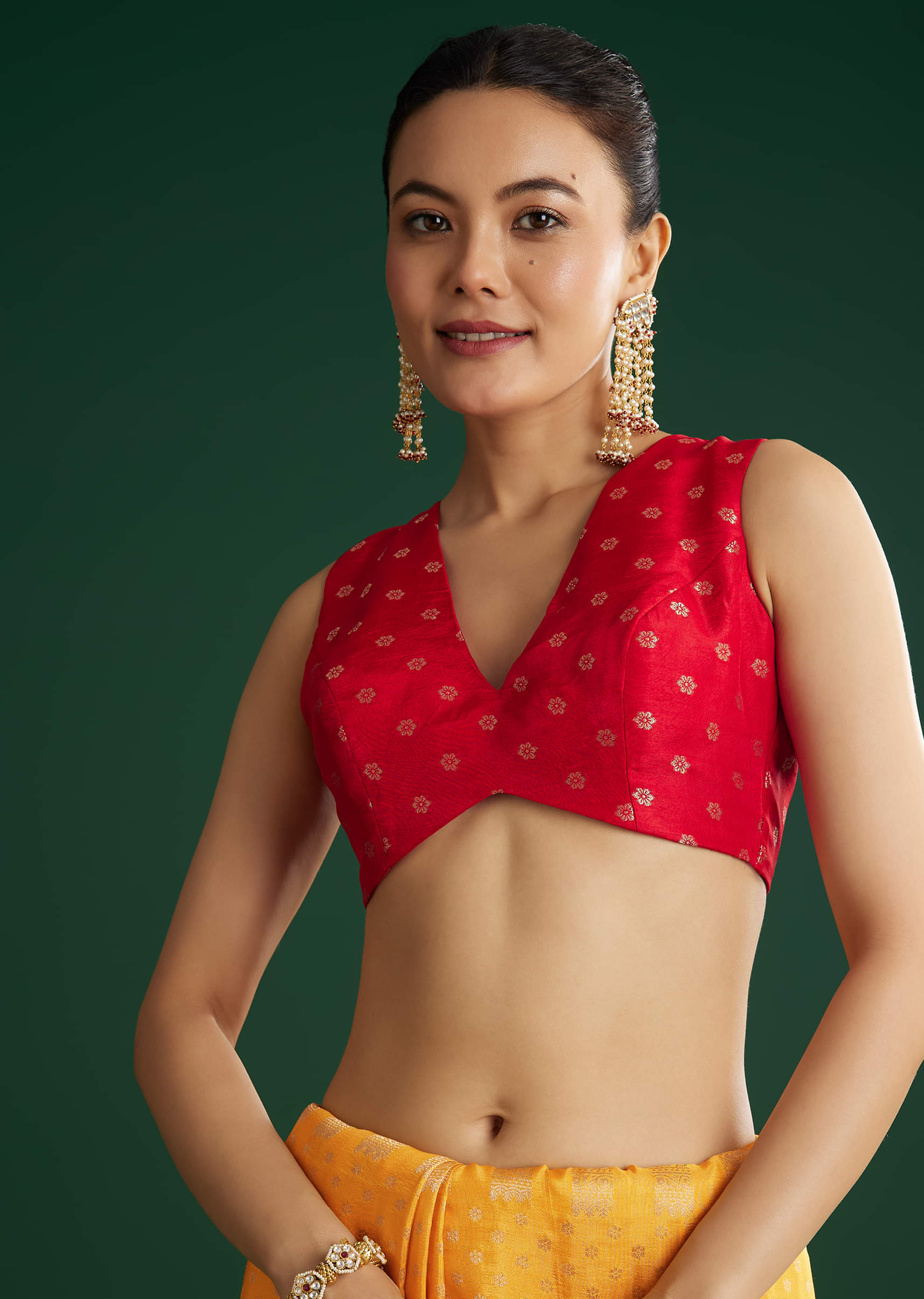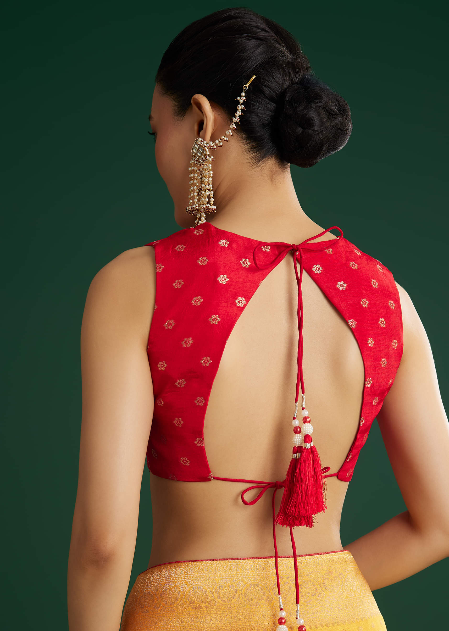 Pair this vibrant yellow saree and red blouse with emerald drop earrings for a striking contrast, or go classic with gold chandbalis for a cohesive festive look.
