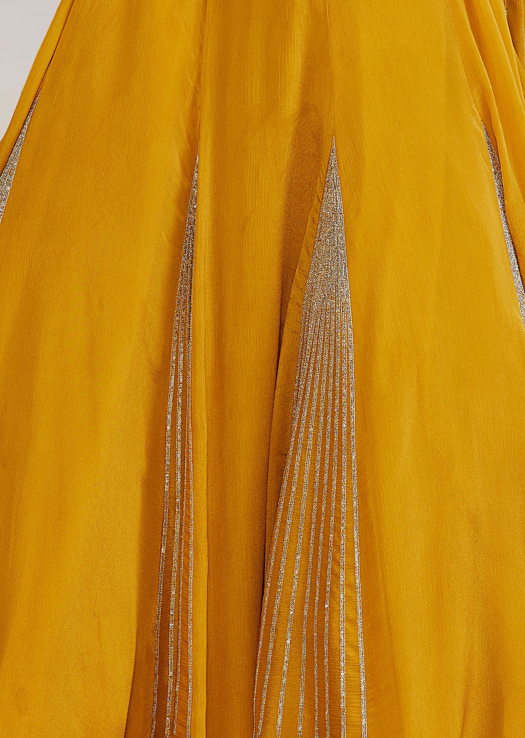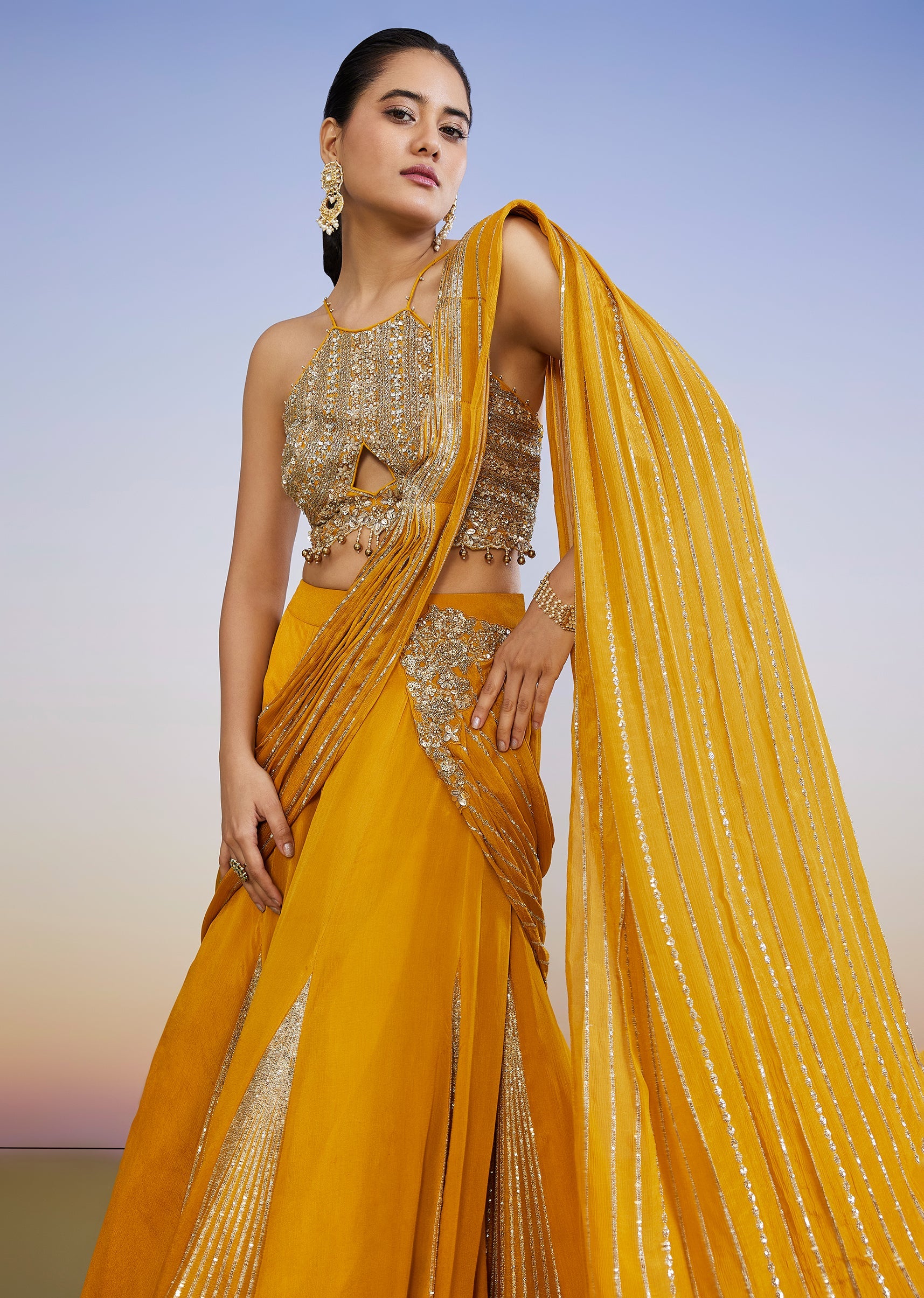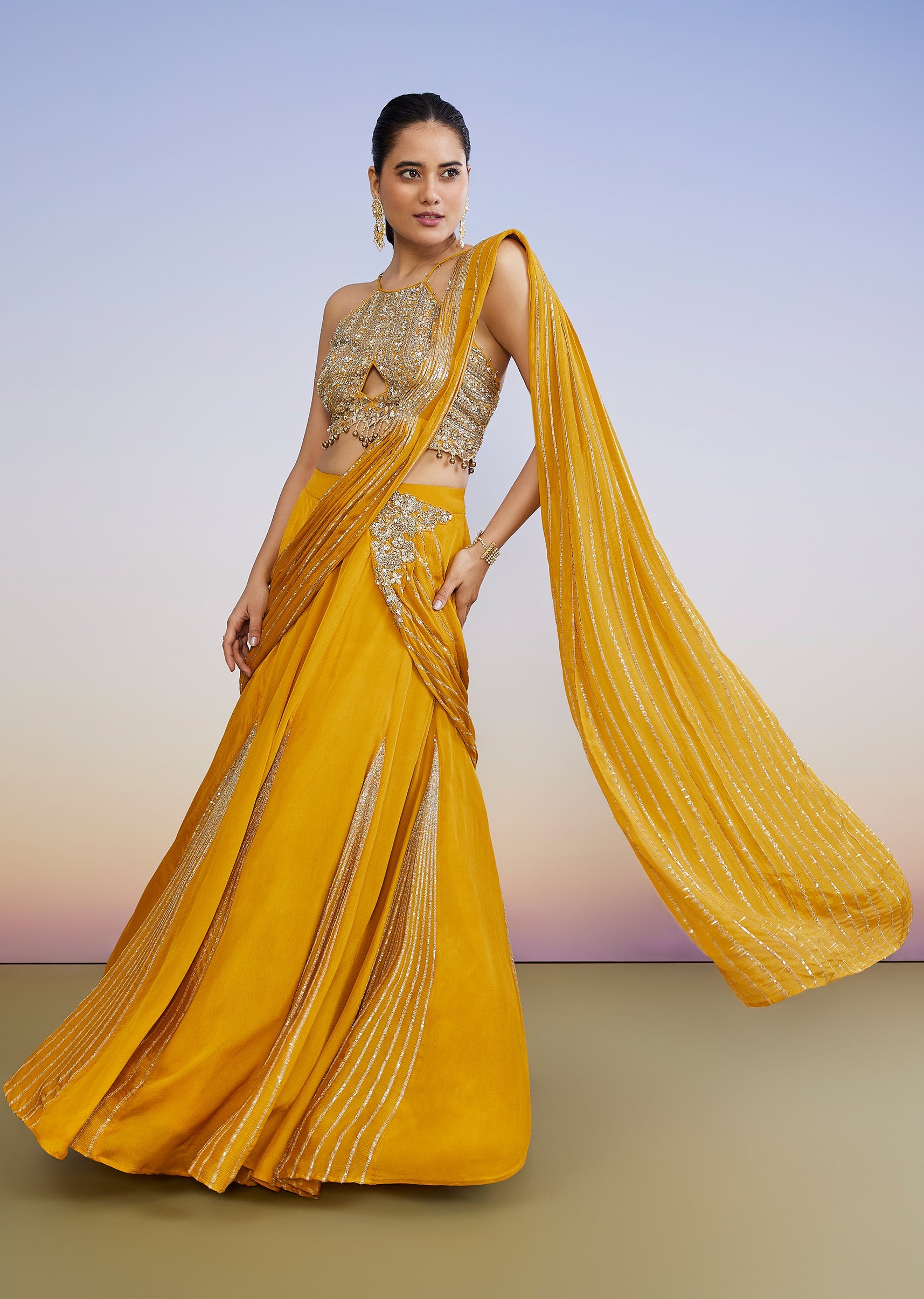 A contemporary haldi-mehendi standout, this yellow fusion lehenga features a sequin and cut dana embellished front-cut choli styled with a halter neckline. The lehenga comes with an attached drape that gives a saree-inspired look while keeping the comfort of a skirt set—perfect for bridesmaid festivities. Awarded as the Most Trusted Brand, we're delivering styles you love, just as promised.