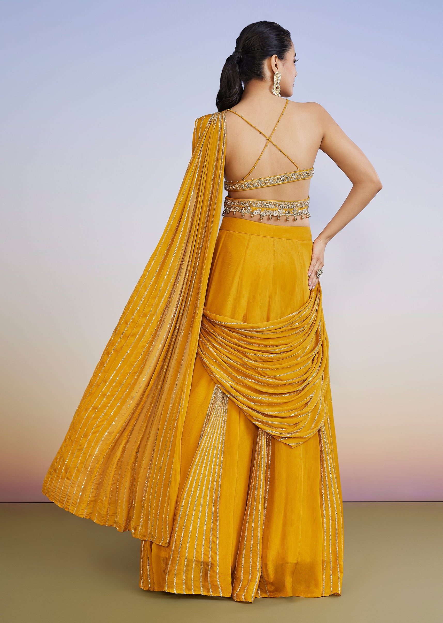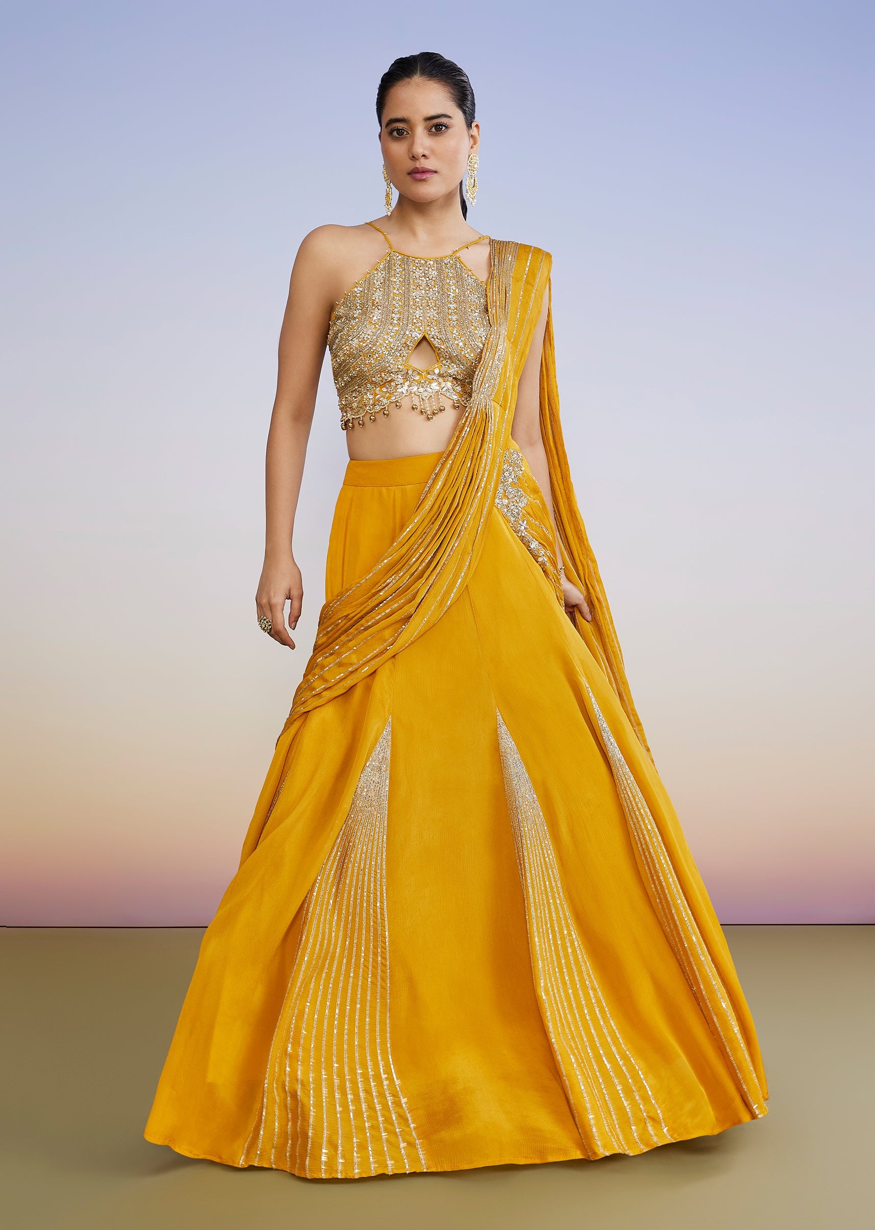 Yellow Drape Style Lehenga With Sequin Cut Dana Halter Choli
