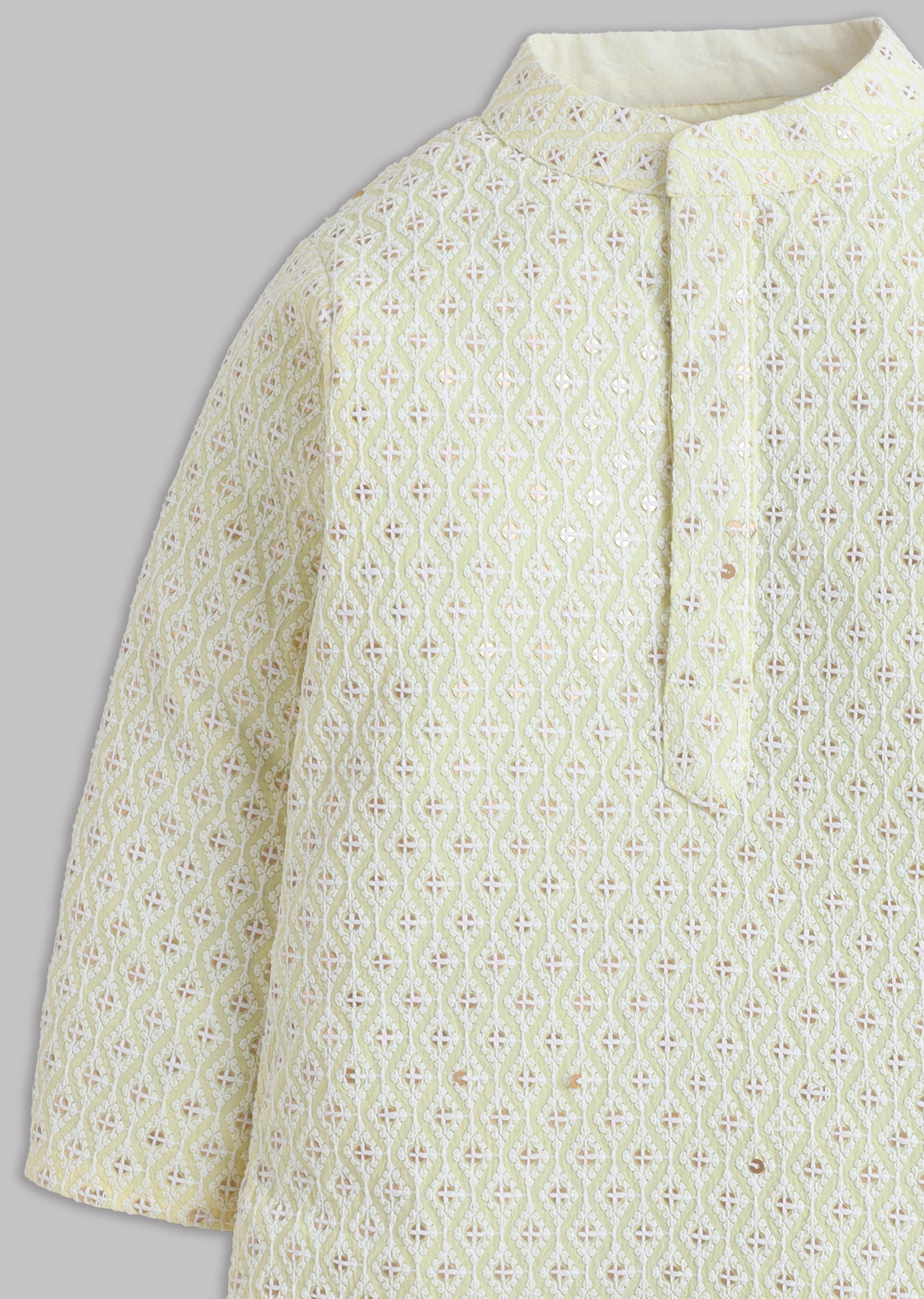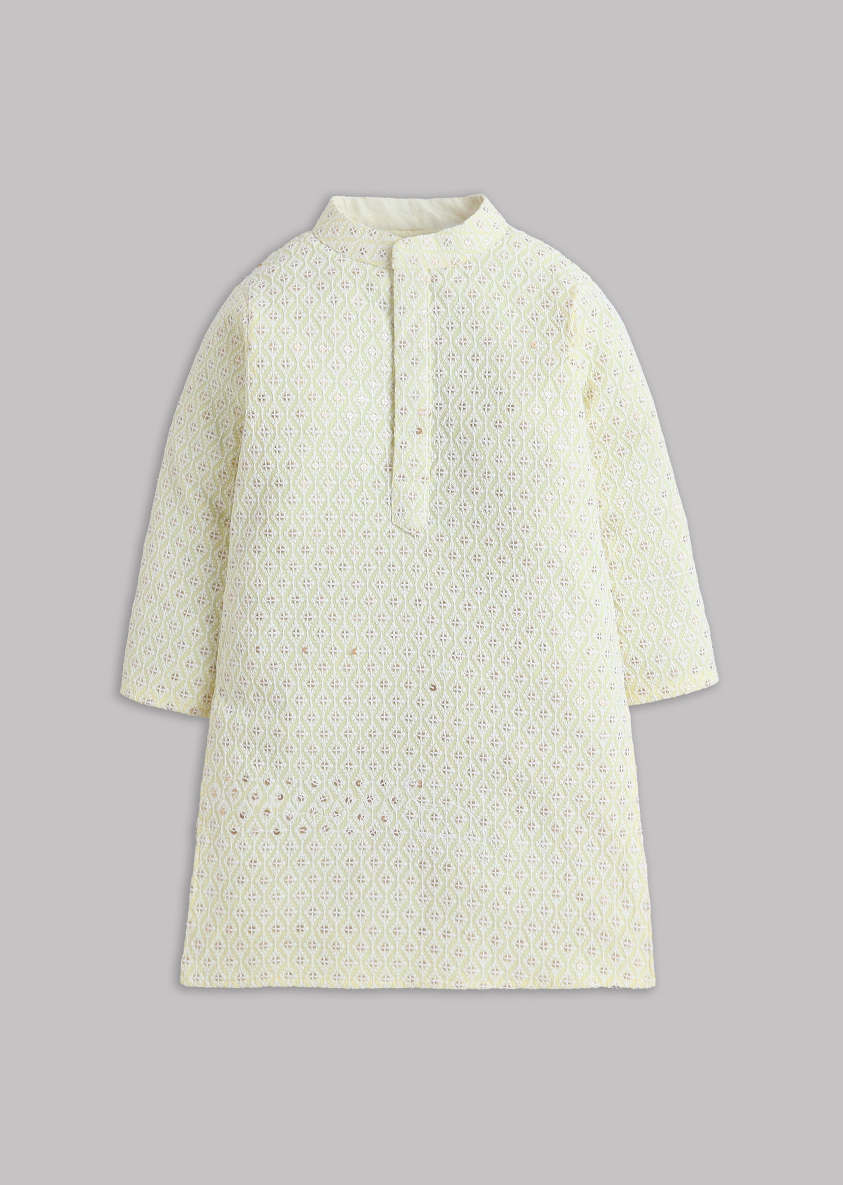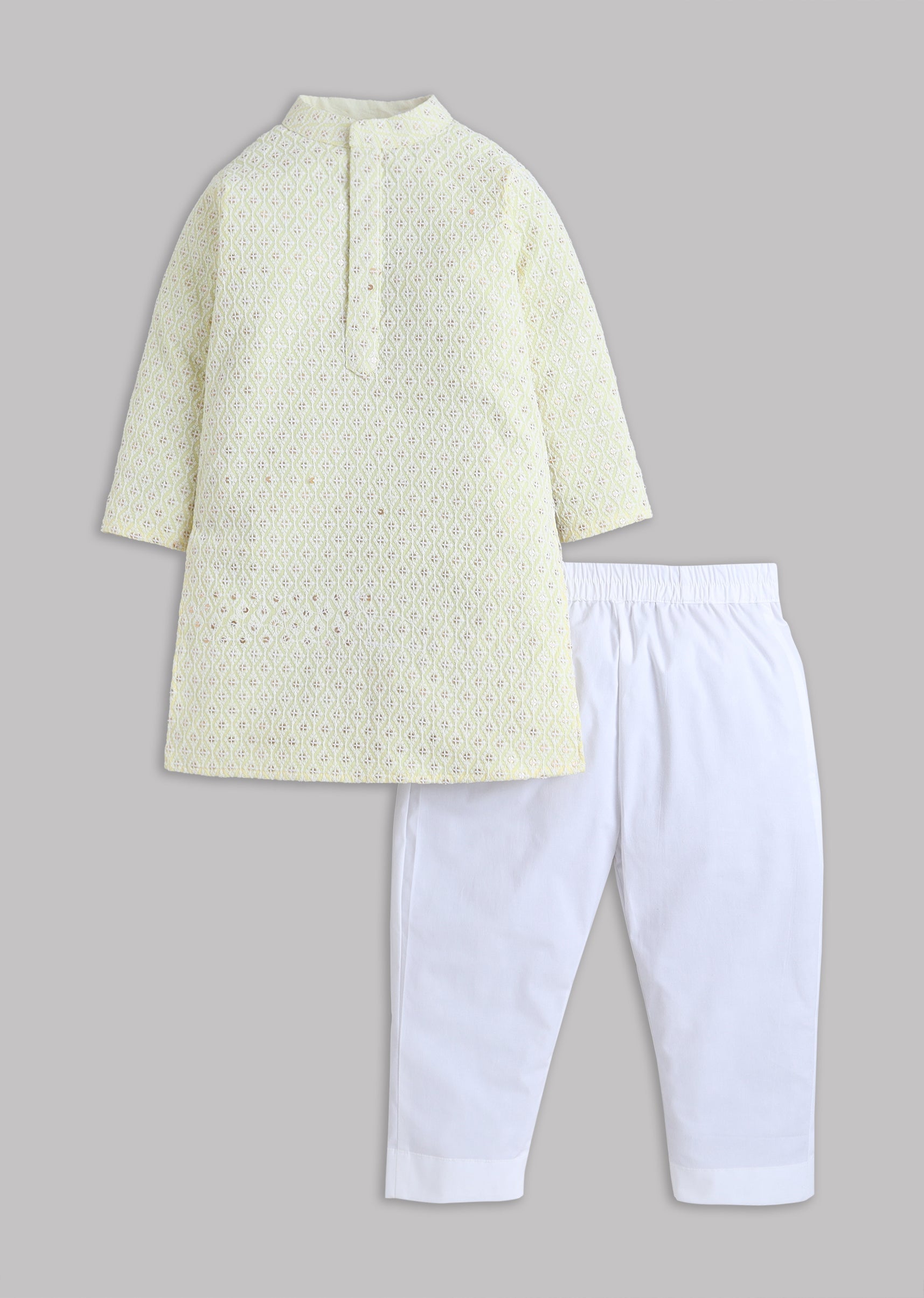 A bright yellow cotton kurta with sequin and thread embroidery, paired with comfort-fit cotton lycra pants. Finished with a mandarin collar and full sleeves—festive and super wearable. Awarded as the... More Product Details