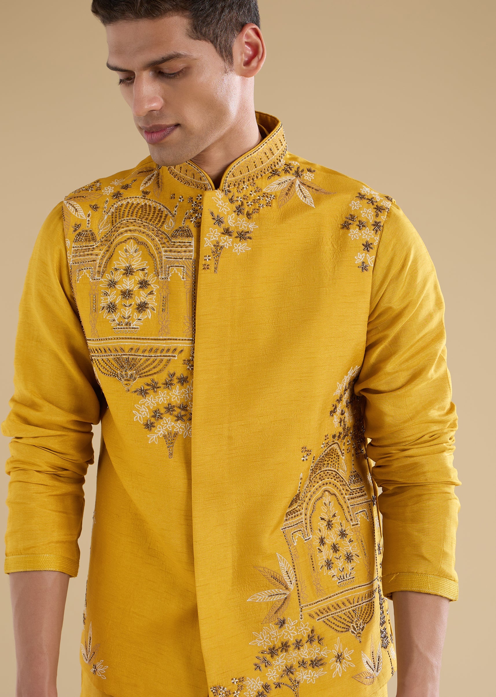 Bright and festive with refined detailing, this yellow kurta jacket set is crafted in smooth art silk for a celebratory look. The kurta features a mandarin collar, full sleeves, and... More Product Details