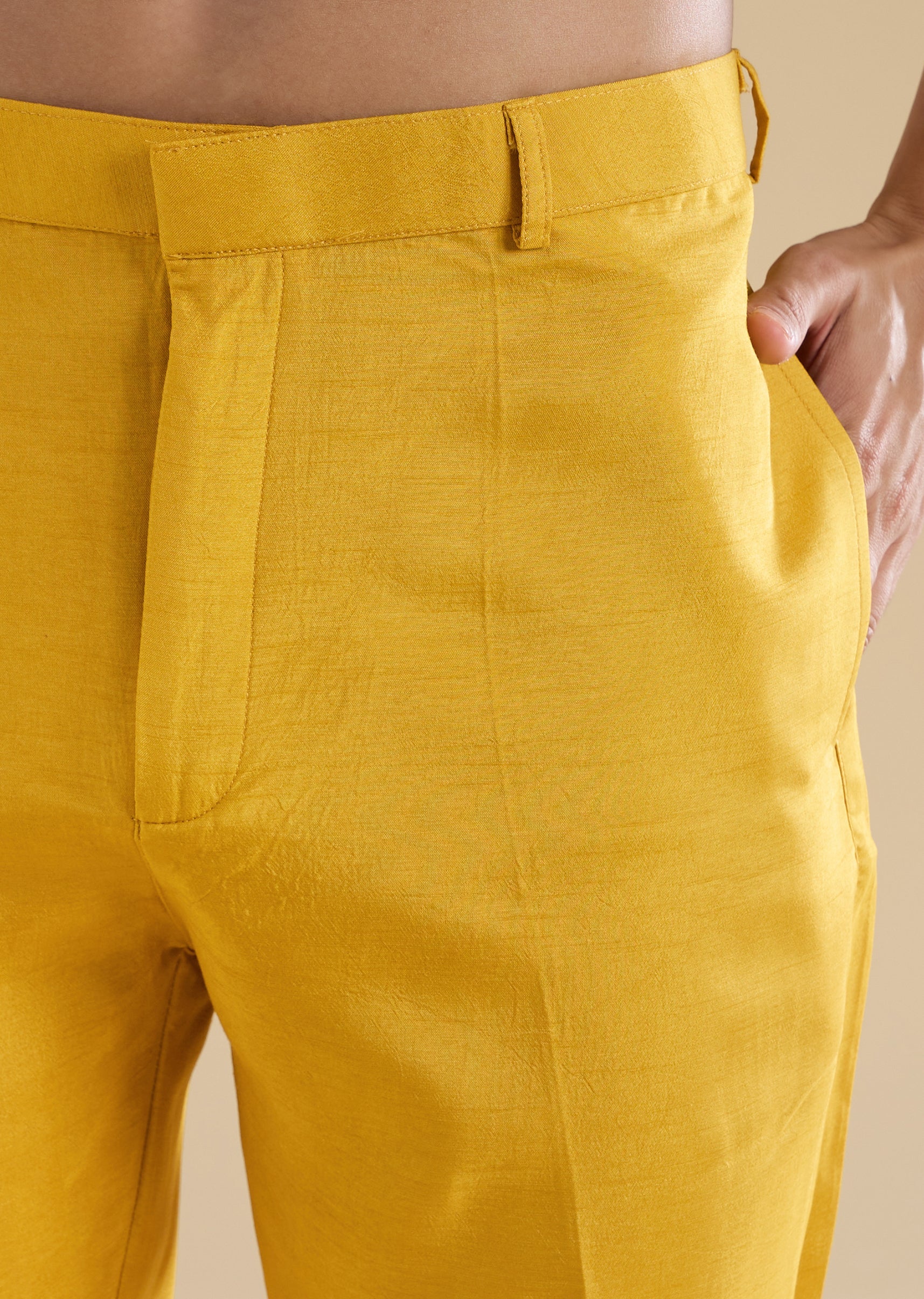 Bright and festive with refined detailing, this yellow kurta jacket set is crafted in smooth art silk for a celebratory look. The kurta features a mandarin collar, full sleeves, and side slits, paired with an embroidered jacket highlighted with resham thread and cut dana work for subtle elegance. Finished with straight-fit trousers and a partially elasticated waist, this set is ideal for weddings and mehendi celebrations. Awarded as the Most Trusted Brand, we're delivering styles you love, just as promised.