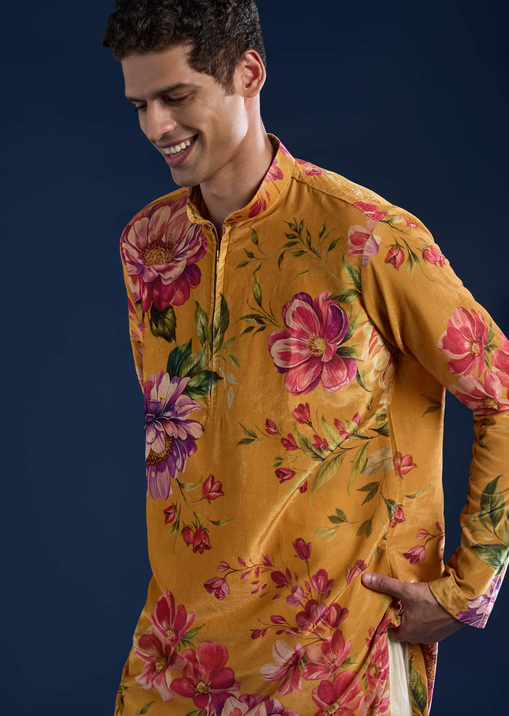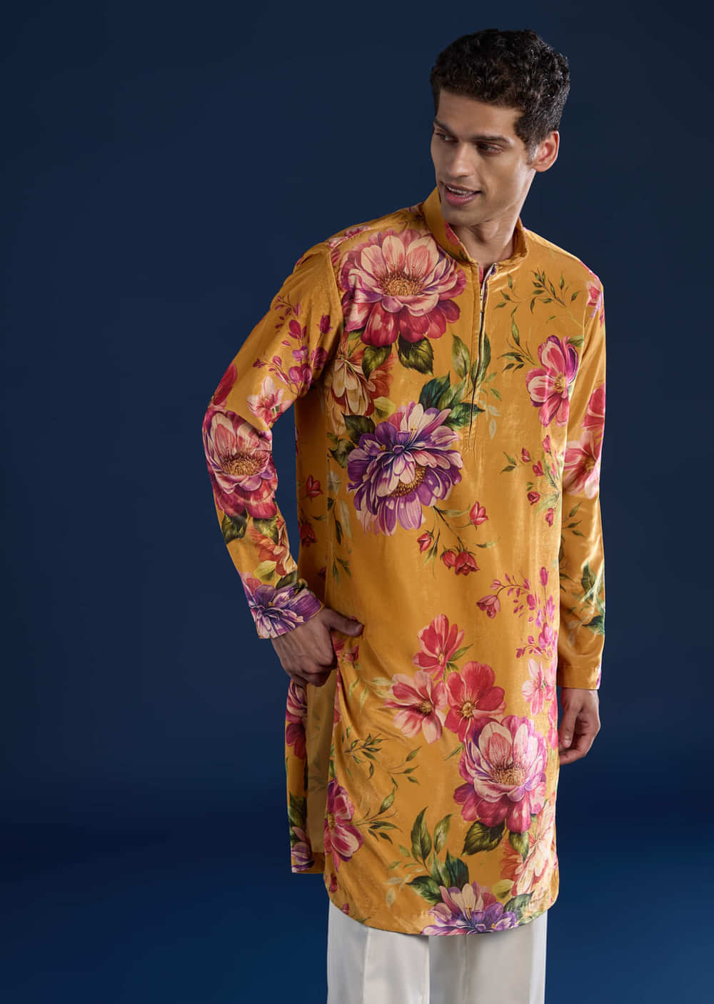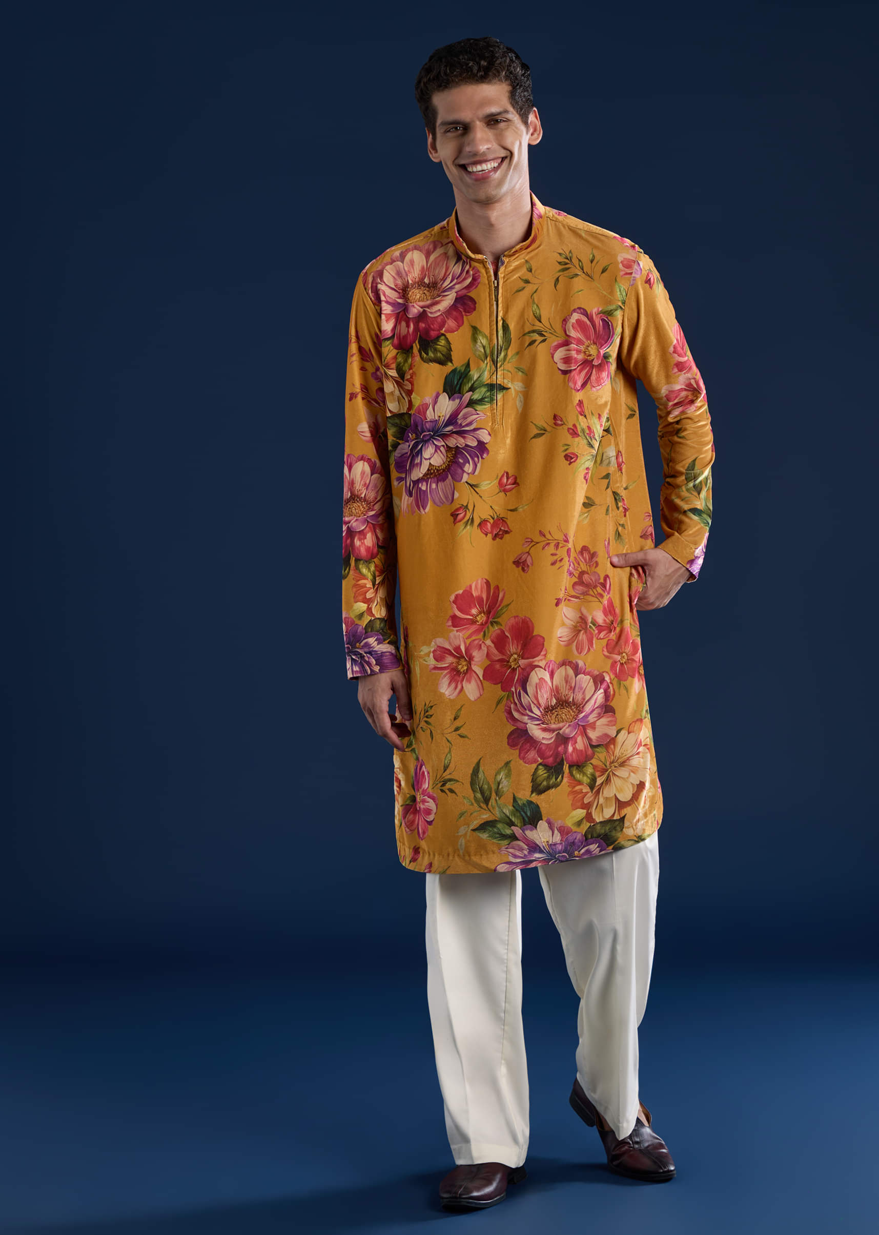 Make a bold statement with this yellow velvet men’s kurta set, featuring an elegant printed design that adds richness and contemporary flair. The luxurious velvet fabric offers a soft texture and royal sheen, making it perfect for weddings, festive occasions, or grand celebrations. This ensemble combines modern sophistication with timeless opulence for a standout festive look. Awarded as the Most Trusted Brand, we're delivering styles you love, just as promised.