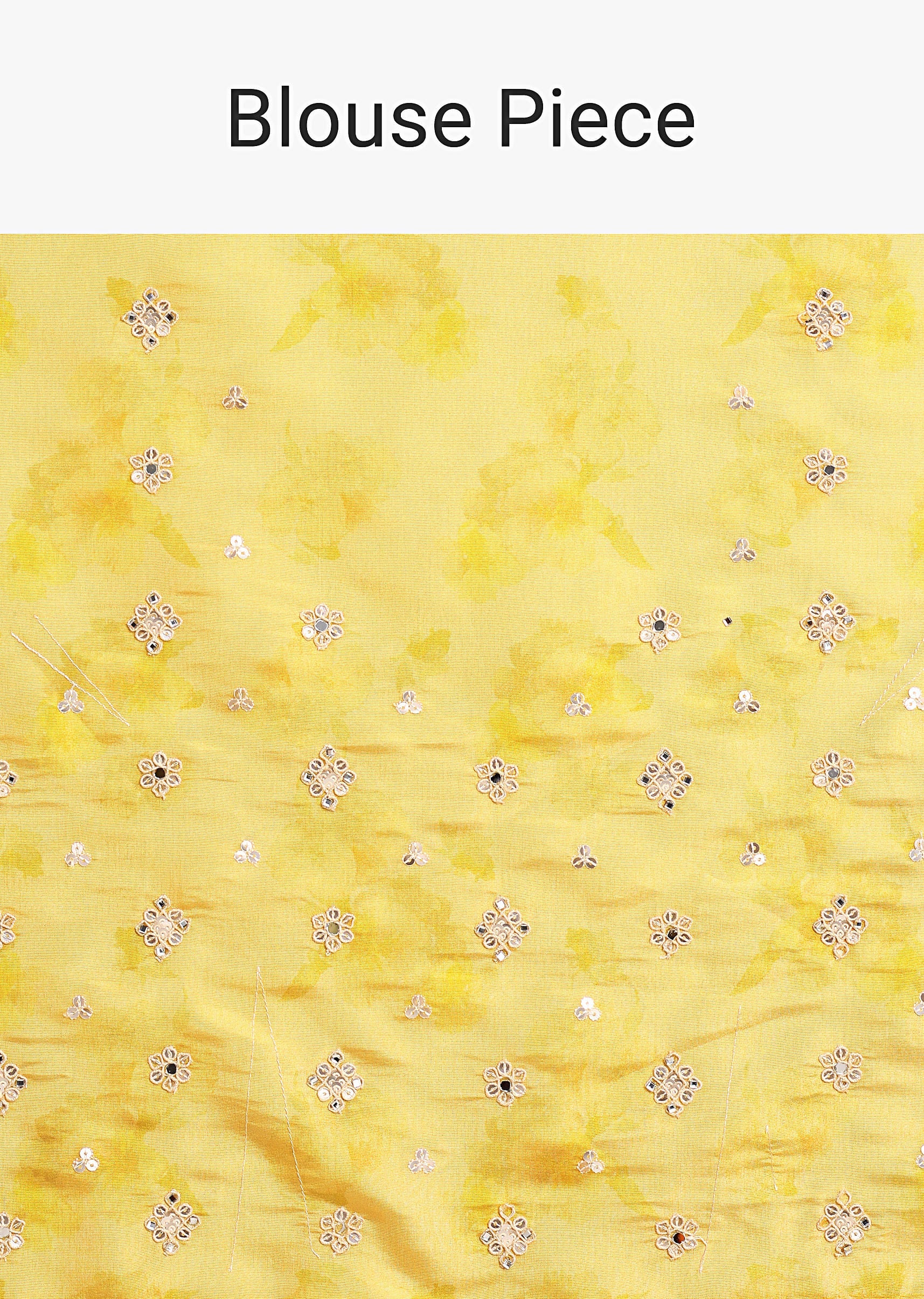 Yellow Floral Printed Organza Saree With Sequin Border And Unstitched Blouse