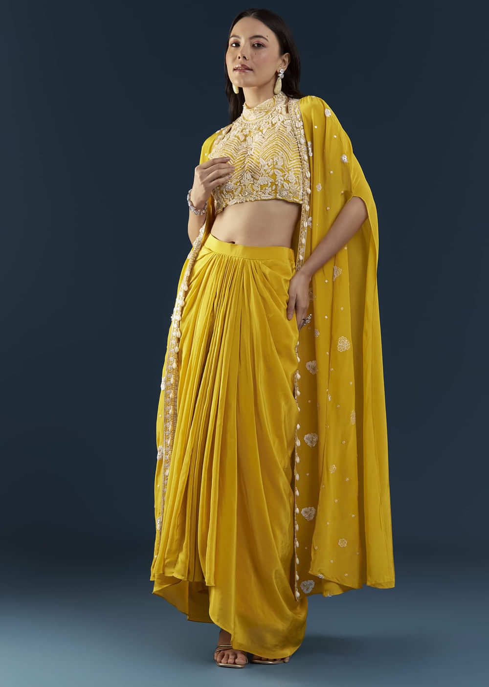 Blending contemporary elegance with festive charm, this yellow crop top and skirt set with a cape is designed to make a graceful statement. The halter-style embroidered crop top showcases intricate... More Product Details