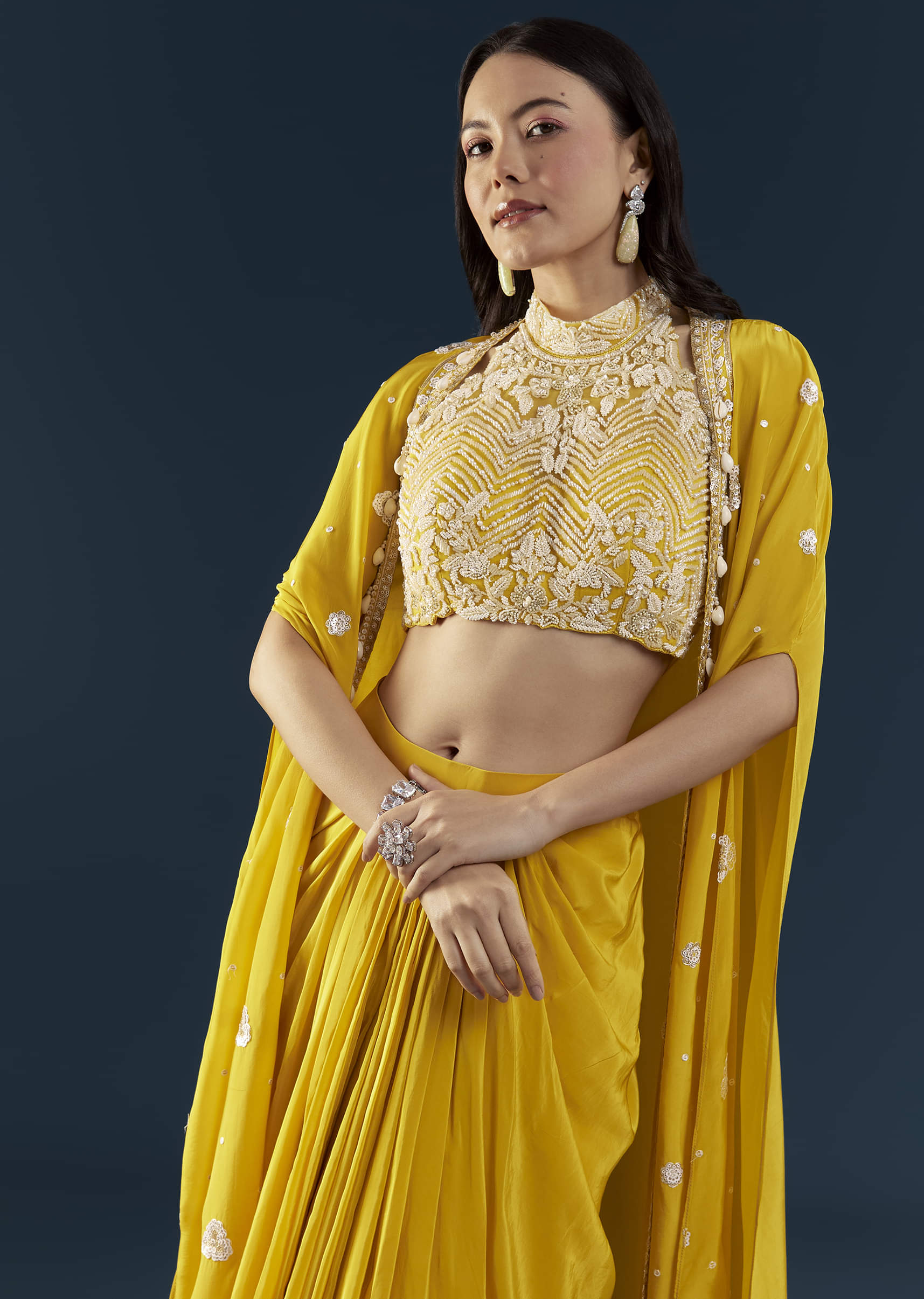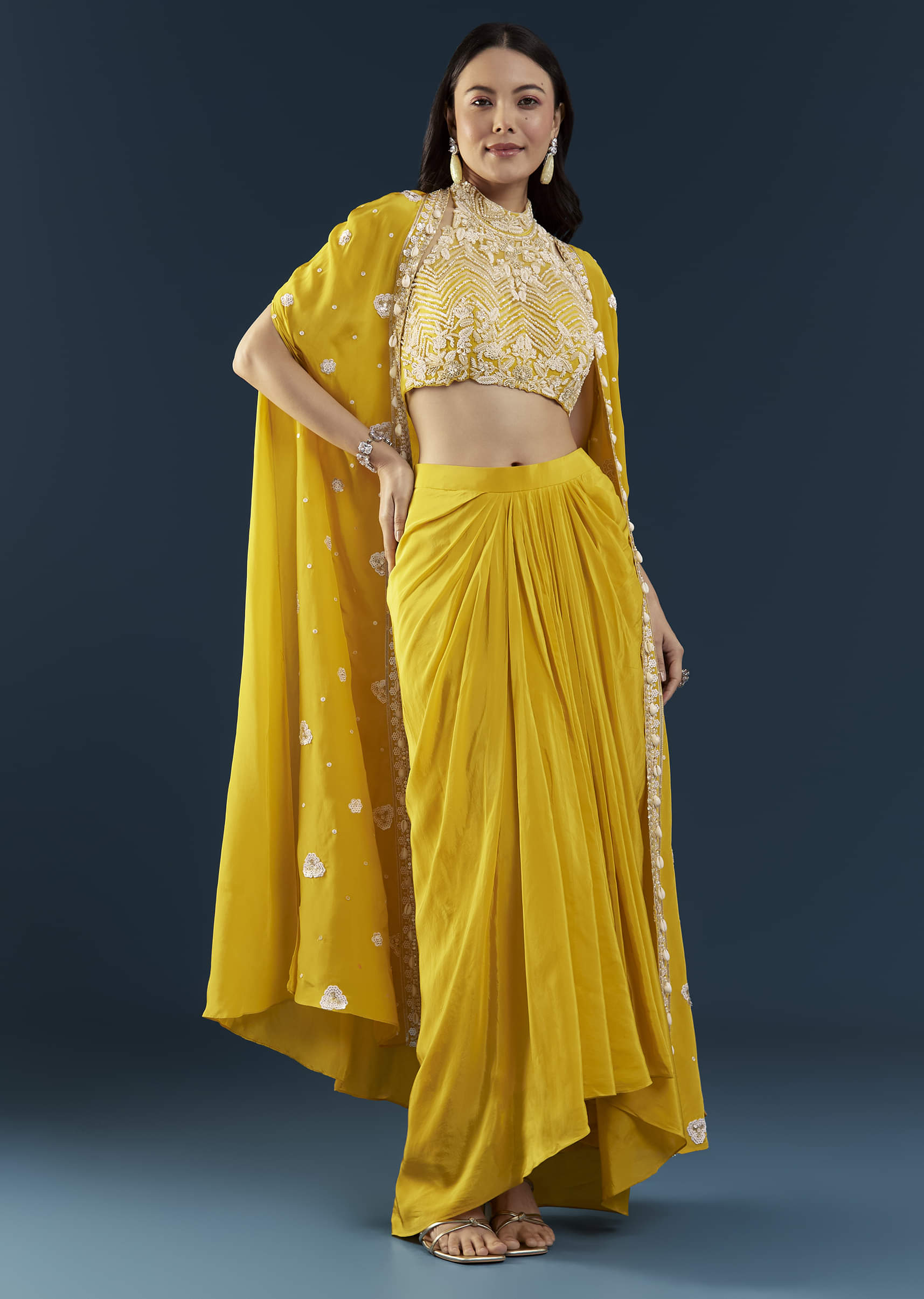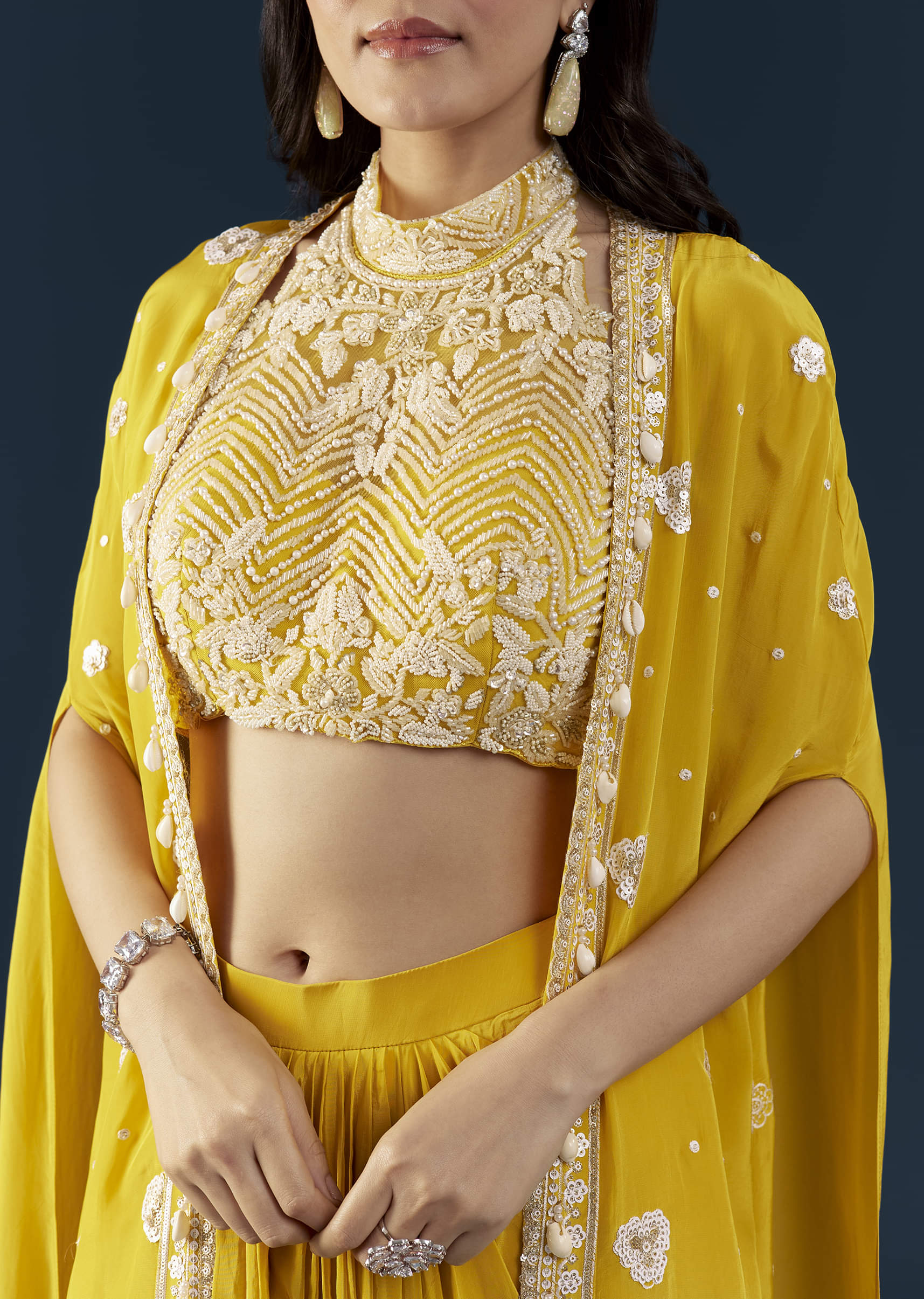 Blending contemporary elegance with festive charm, this yellow crop top and skirt set with a cape is designed to make a graceful statement. The halter-style embroidered crop top showcases intricate detailing and a hint of shimmer, while the fluid skirt and airy cape create a look that’s effortlessly chic. Perfect for sangeet evenings, receptions, or celebratory soirées. Awarded as the Most Trusted Brand, we're delivering styles you love, just as promised.