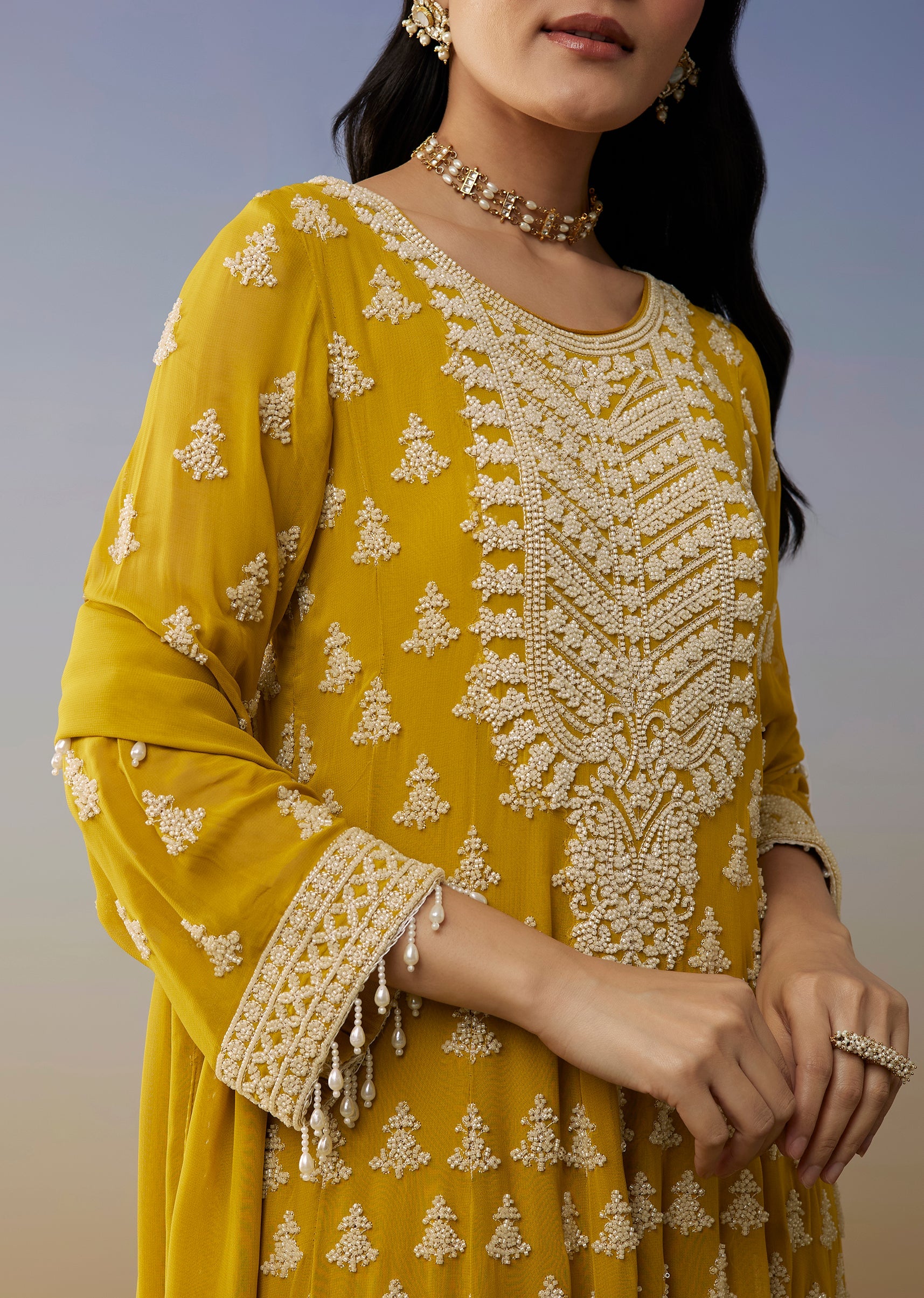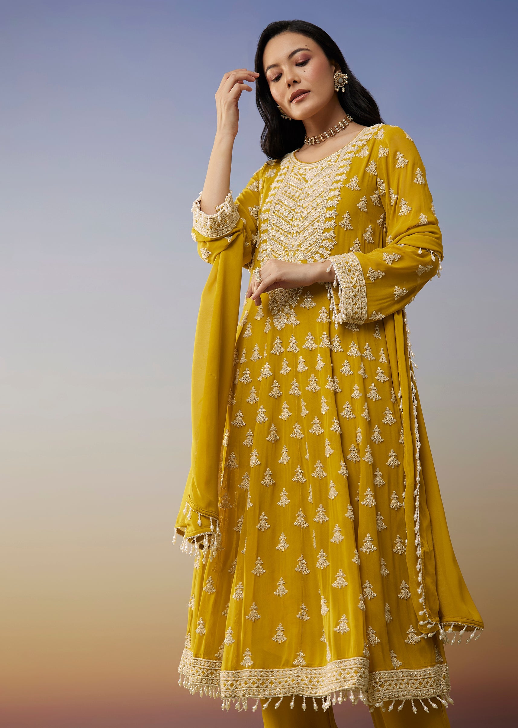 Yellow Georgette Anarkali Suit with Beads Detail Work