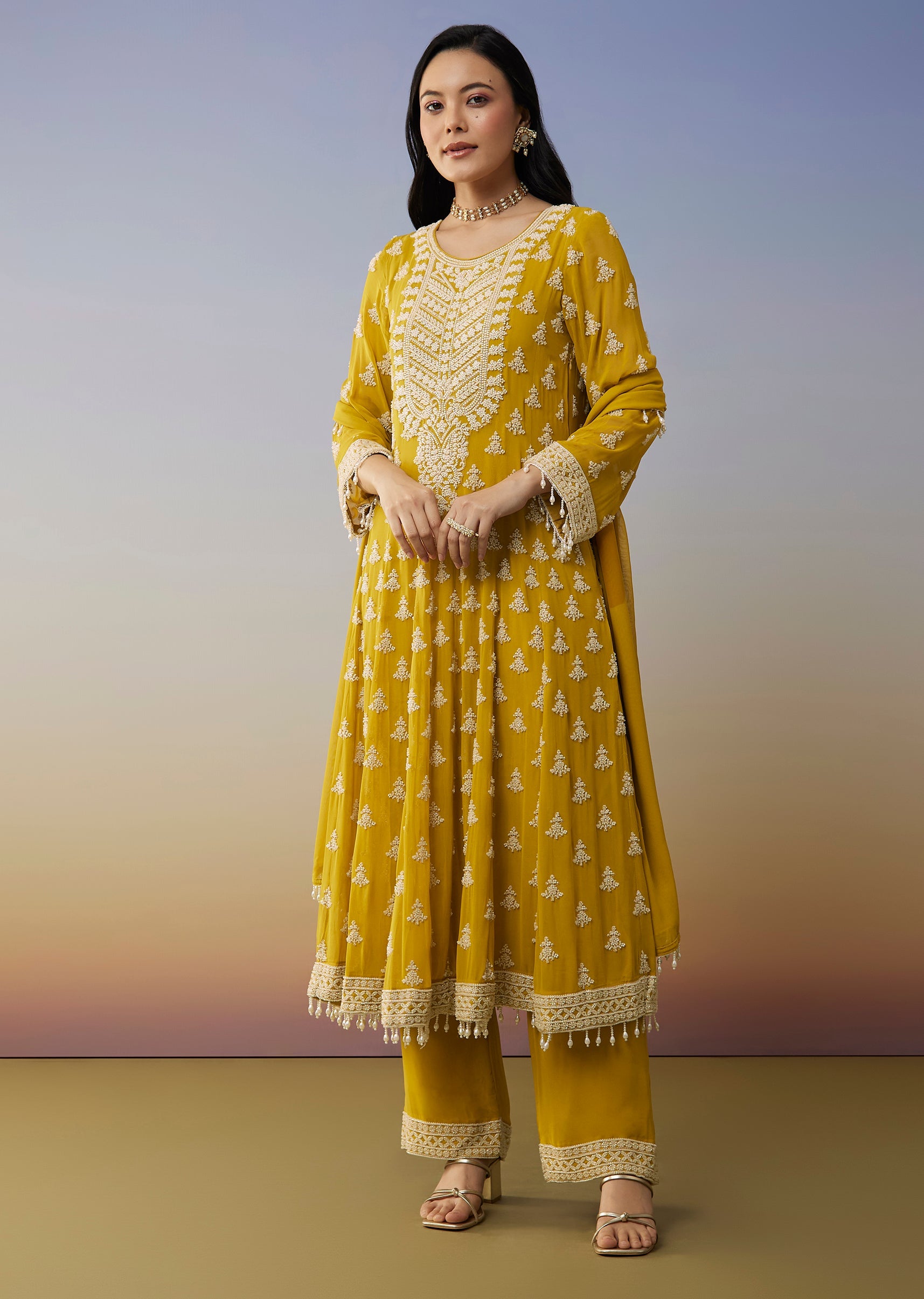 This yellow anarkali suit is designed for haldi sangeet and mehendi celebrations offering a vibrant festive charm with effortless grace. Crafted in fluid georgette the fifty inch anarkali features delicate... More Product Details