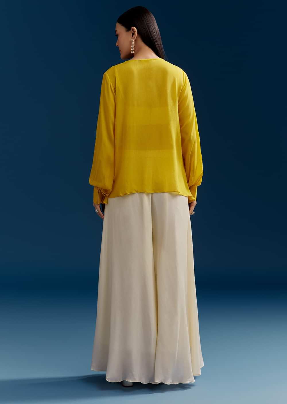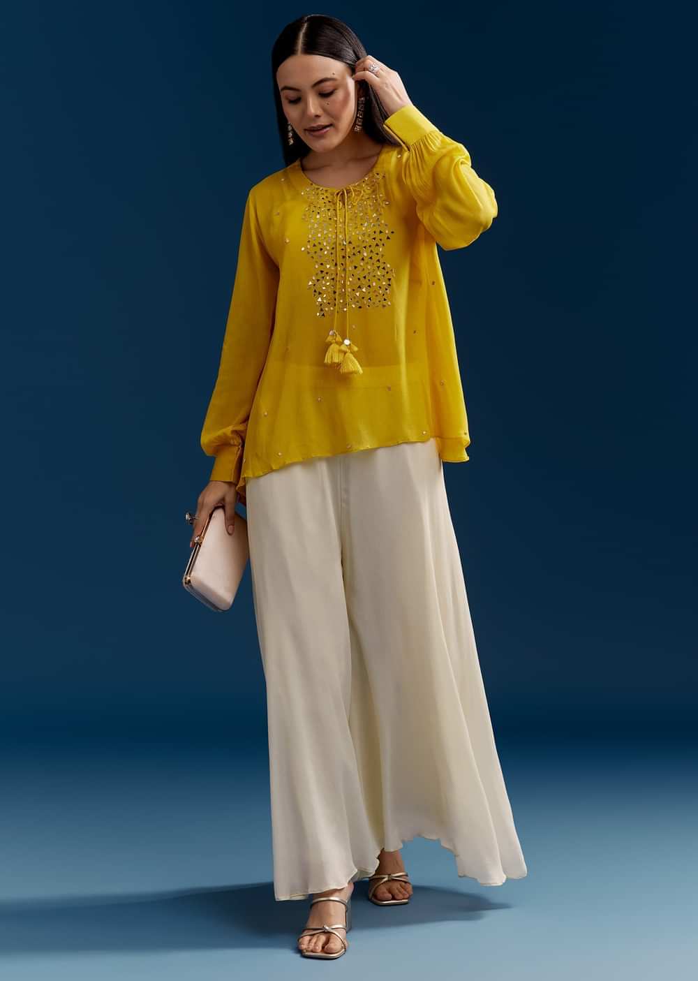 This mirror work crop top in bright yellow brings instant vibrance to any look. With full sleeves and a round neckline, the silhouette stays classic while the mirror detailing adds playful shimmer. Perfect to pair with contrasting bottoms or as a standalone showstopper. Awarded as the Most Trusted Brand, we're delivering styles you love, just as promised.