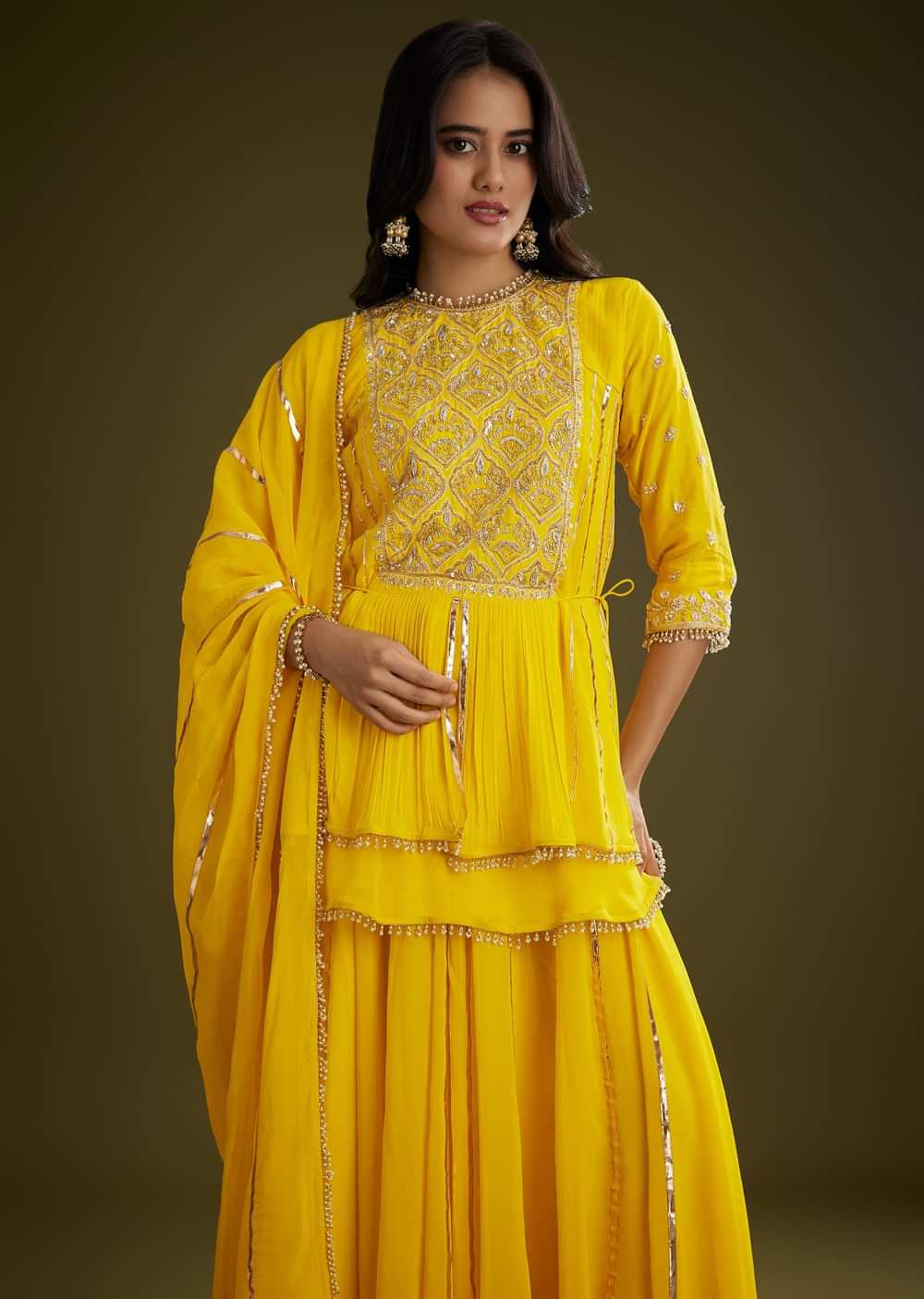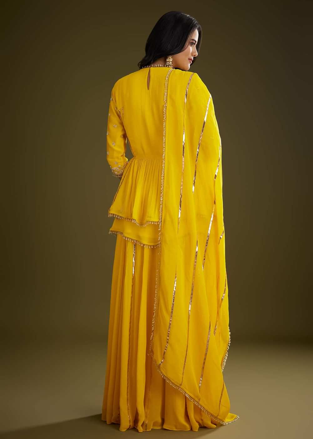 This yellow kurta set in airy georgette showcases vibrant cut dana and sequins work with traditional gotta lace on the skirt and dupatta. A cheerful look for haldi events.