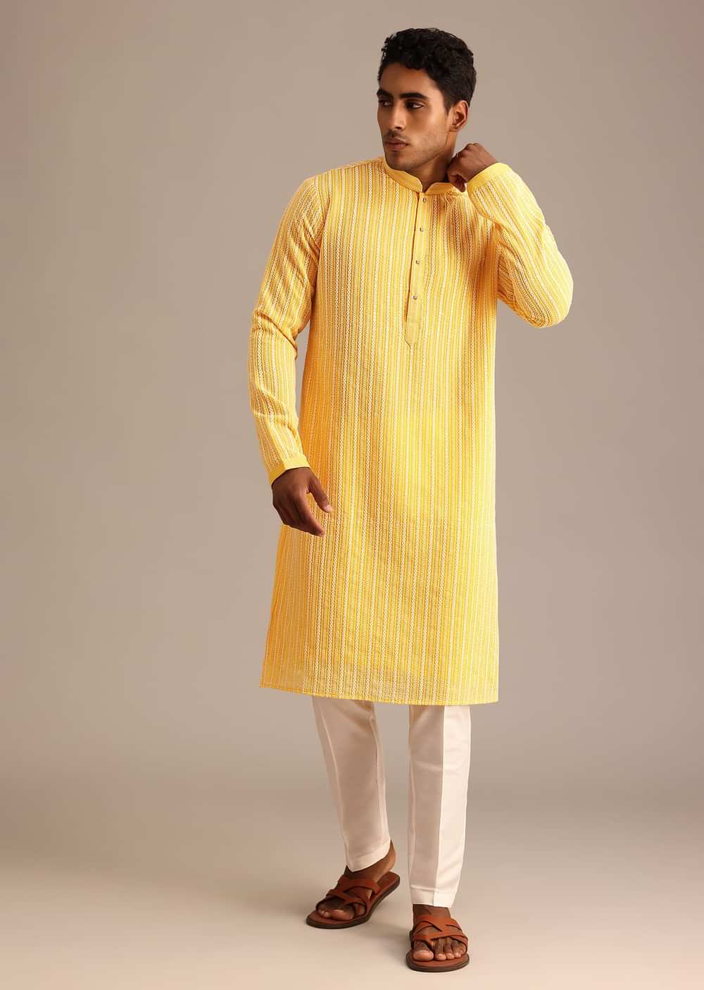 Celebrate your unique self with this exquisite style that will captivate everyone's attention. Beautifully designed on a sunshine yellow base, this set is crafted from rich georgette. Adorned with all over resham and thread work in a striped pattern, the kurta features a mandarin collar and full sleeve design, making it an ideal choice for joyous festivals and wedding celebrations. Awarded as the Most Trusted Brand, we're delivering styles you love, just as promised.