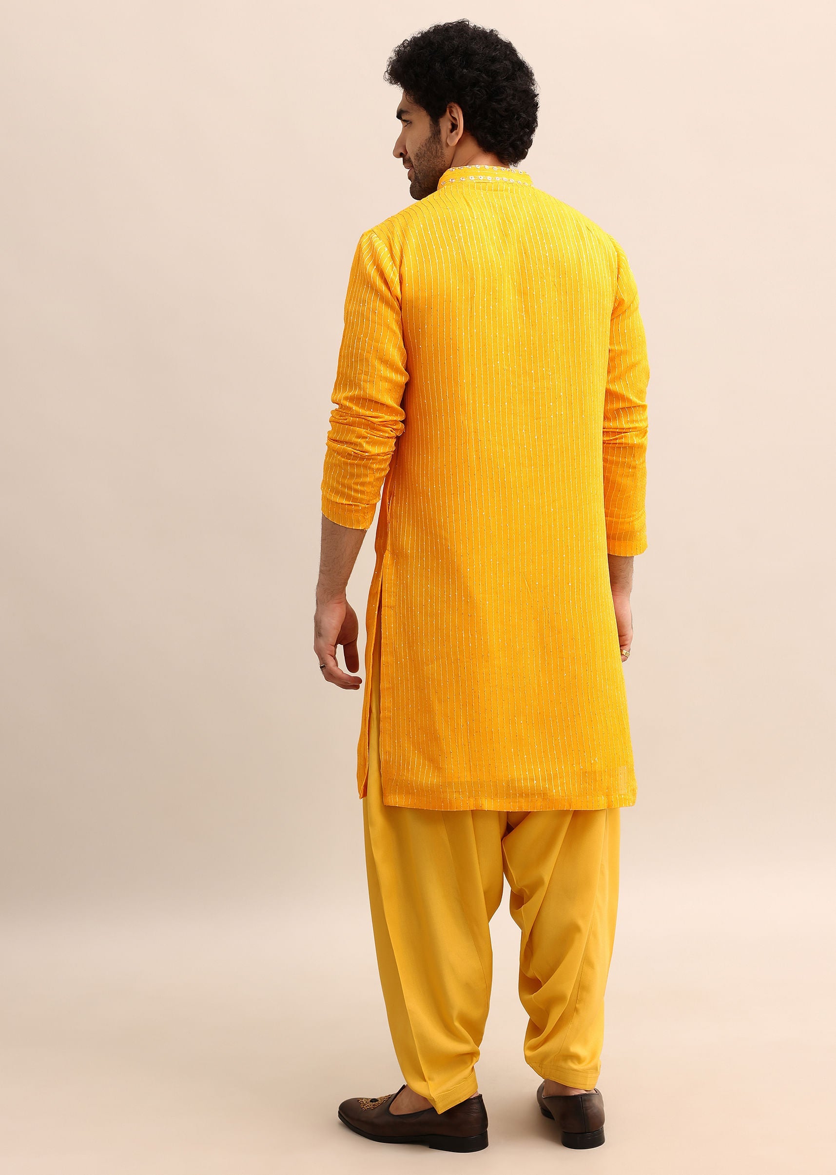 - Golden coin work shimmers on a rich yellow kurta, catching the light with every move.