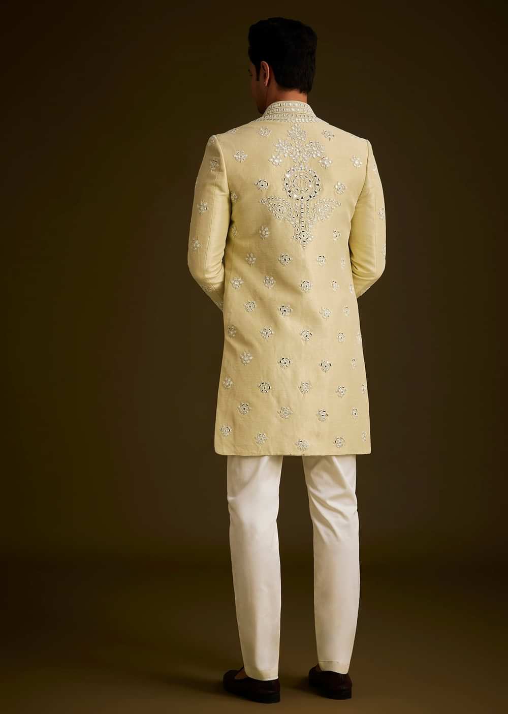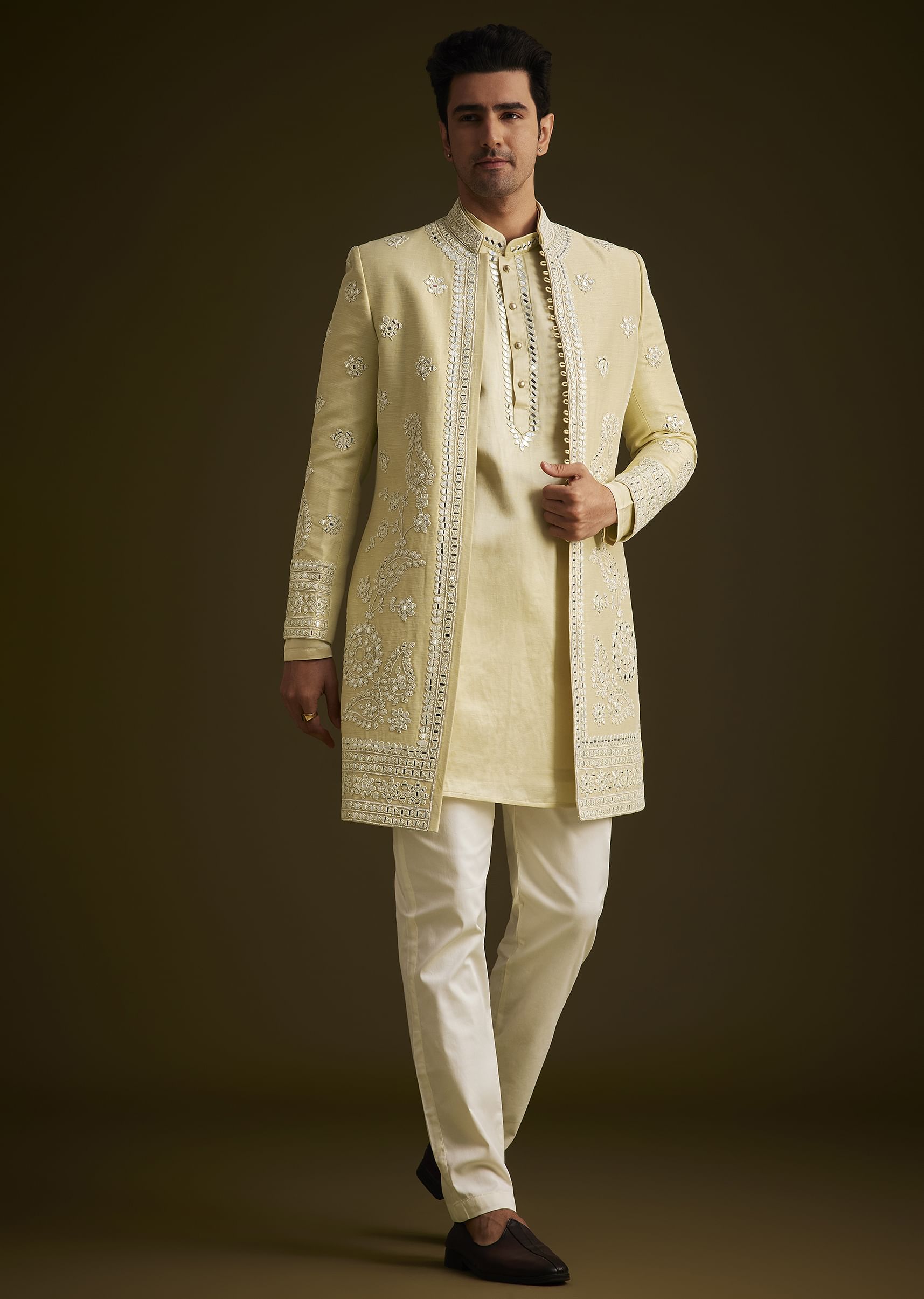 Adorn yourself with timeless grandeur in this yellow handembroidered sherwani detailed with intricate floral and paisley motifs. The fine threadwork complemented by delicate sequin embellishments creates an aura of royal... More Product Details