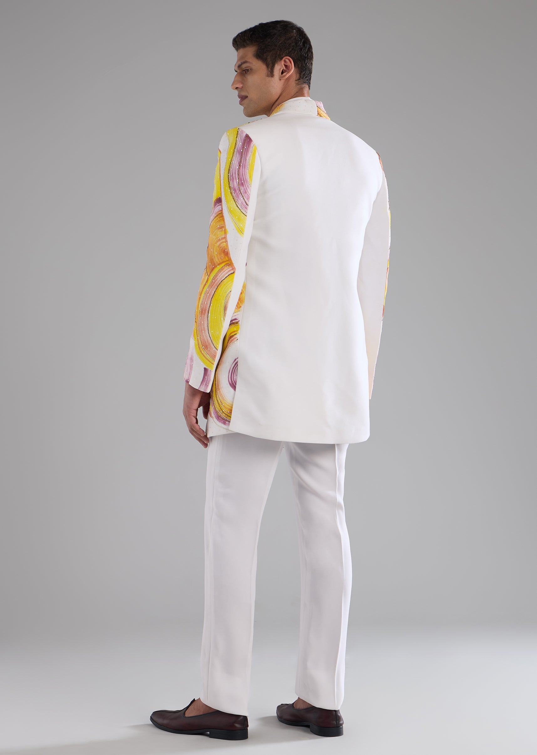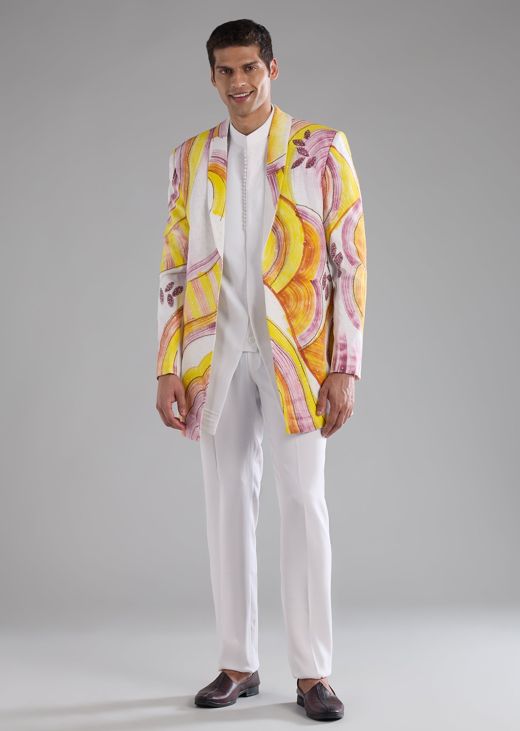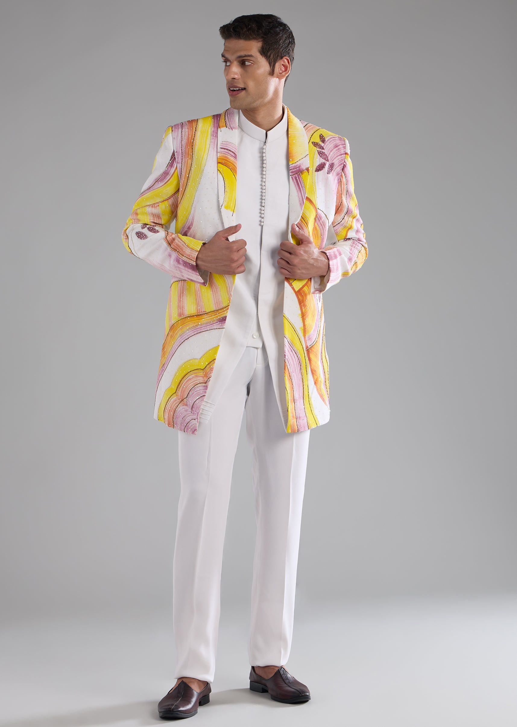Pair with sleek loafers or traditional mojaris and keep accessories minimal to maintain a polished indo western look.