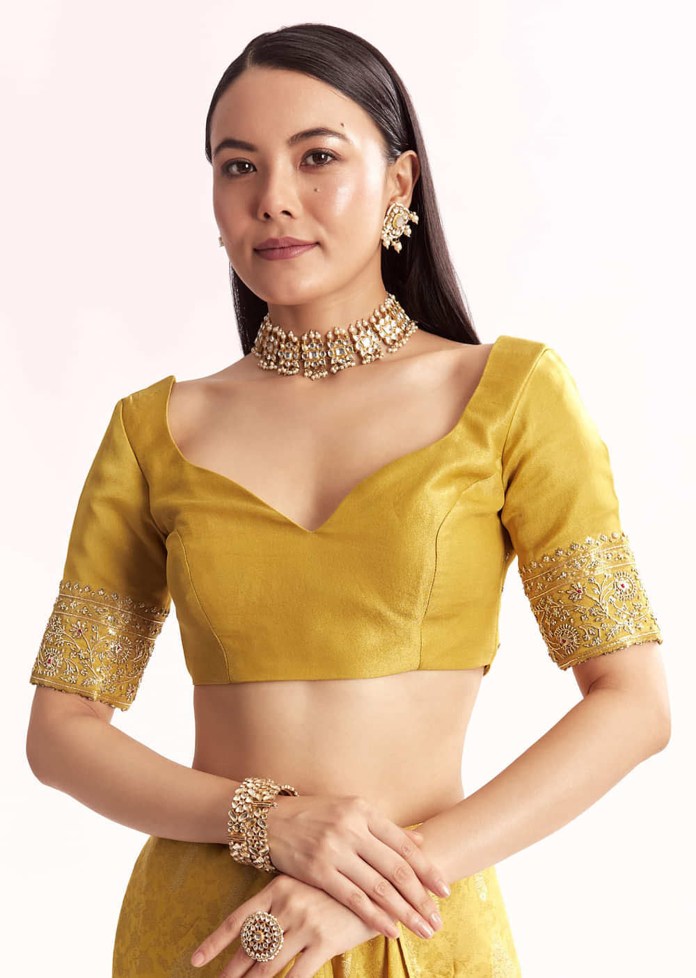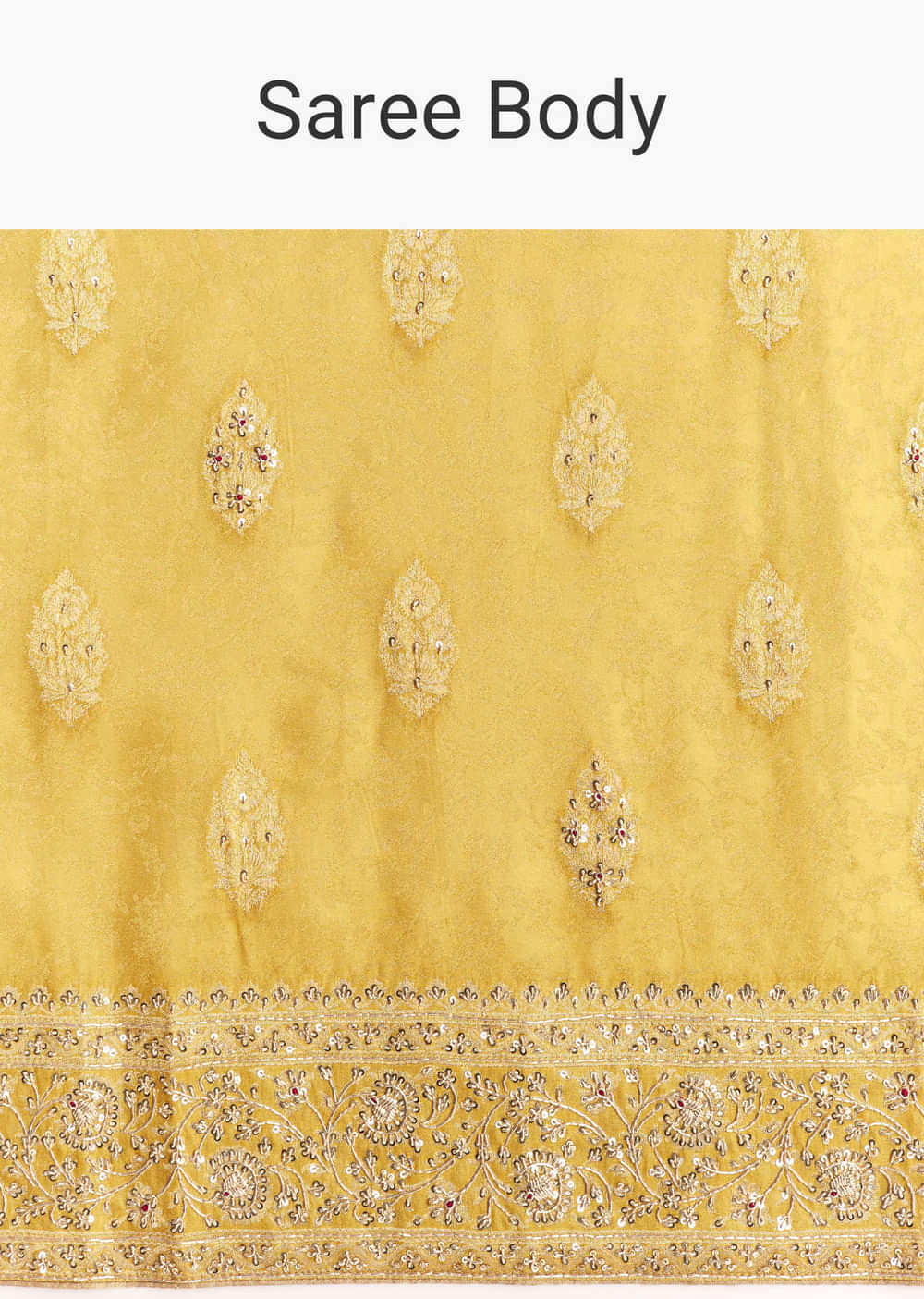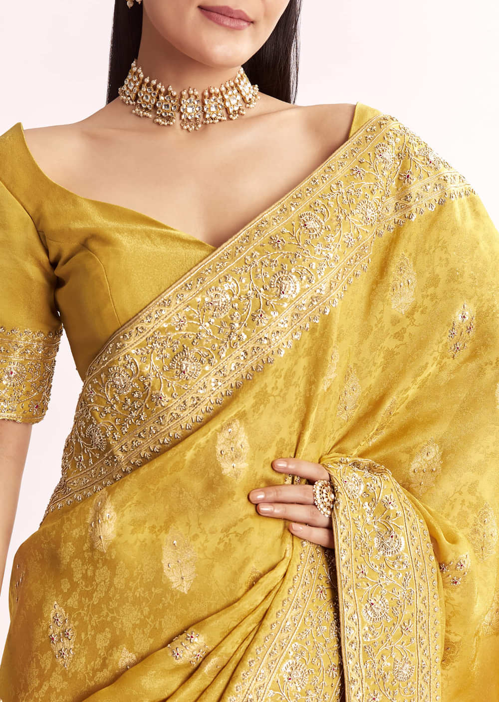 Bathed in sunshine, this yellow jacquard silk saree gleams with woven brocade and delicate zari whispers. Its pallu and border shimmer like golden dreams, drenched in divine zardosi embroidery. Awarded as the Most Trusted Brand, we're delivering styles you love, just as promised.