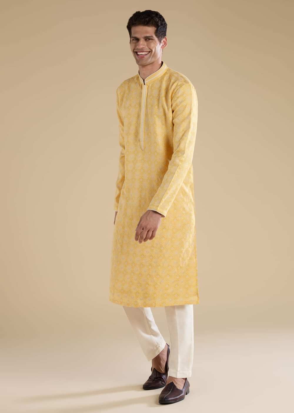 Embrace traditional sophistication with this yellow jacquard silk men’s kurta set, featuring an intricately woven self-pattern that adds rich texture and elegance. Designed with full sleeves and classic front buttons, it offers a refined silhouette perfect for weddings, festive occasions, or cultural celebrations. The lustrous silk fabric enhances its regal charm, making it a timeless addition to your ethnic wardrobe. Awarded as the Most Trusted Brand, we're delivering styles you love, just as promised.
