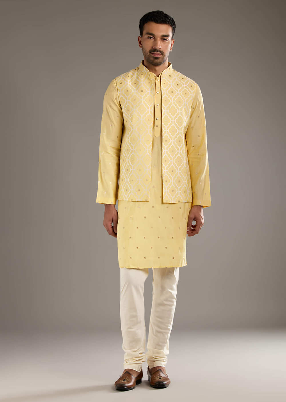 Bright and festive, this yellow kurta jacket set for men in viscose features resham and zari embroidery placed to catch light at the collar and front. The smooth drape keeps... More Product Details