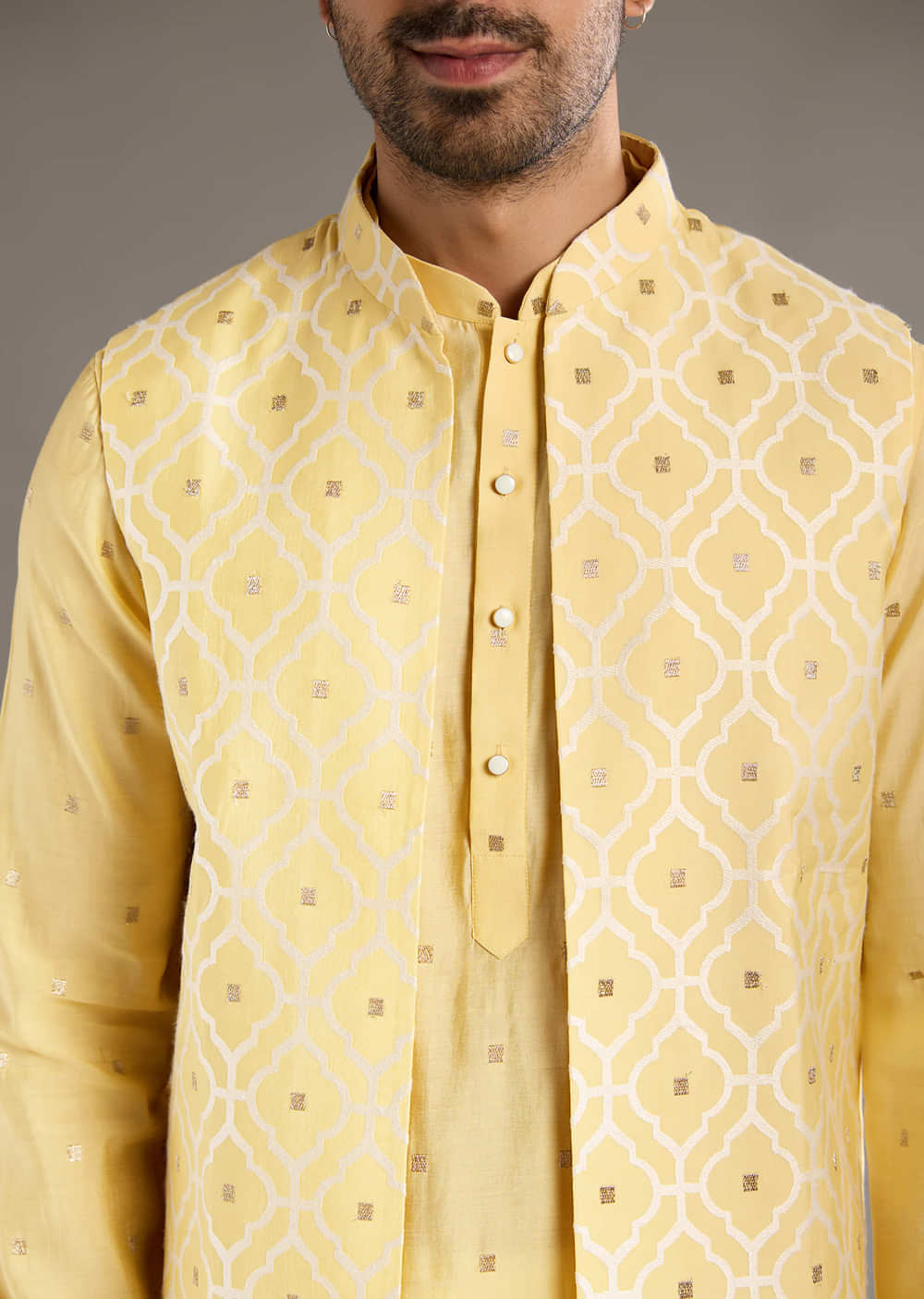 Yellow Kurta Jacket Set For Men With Hand Embroidery