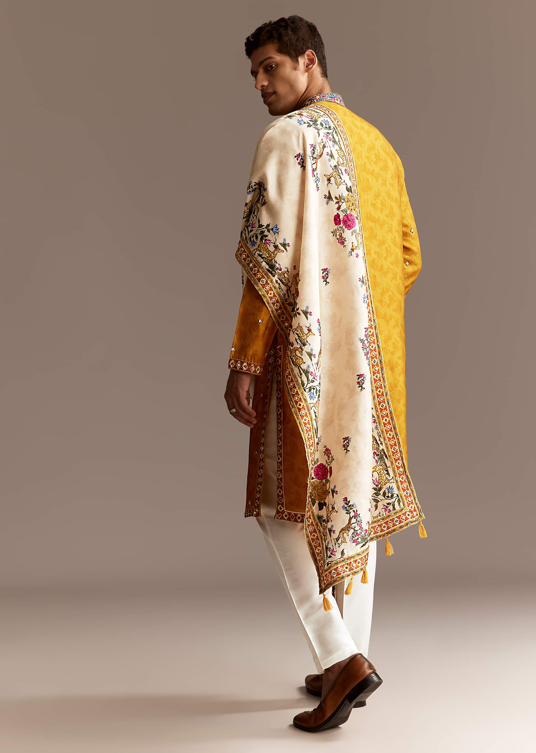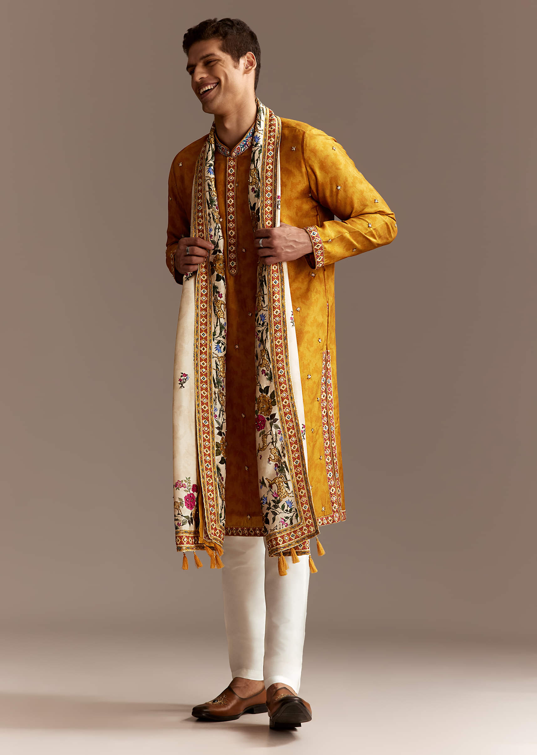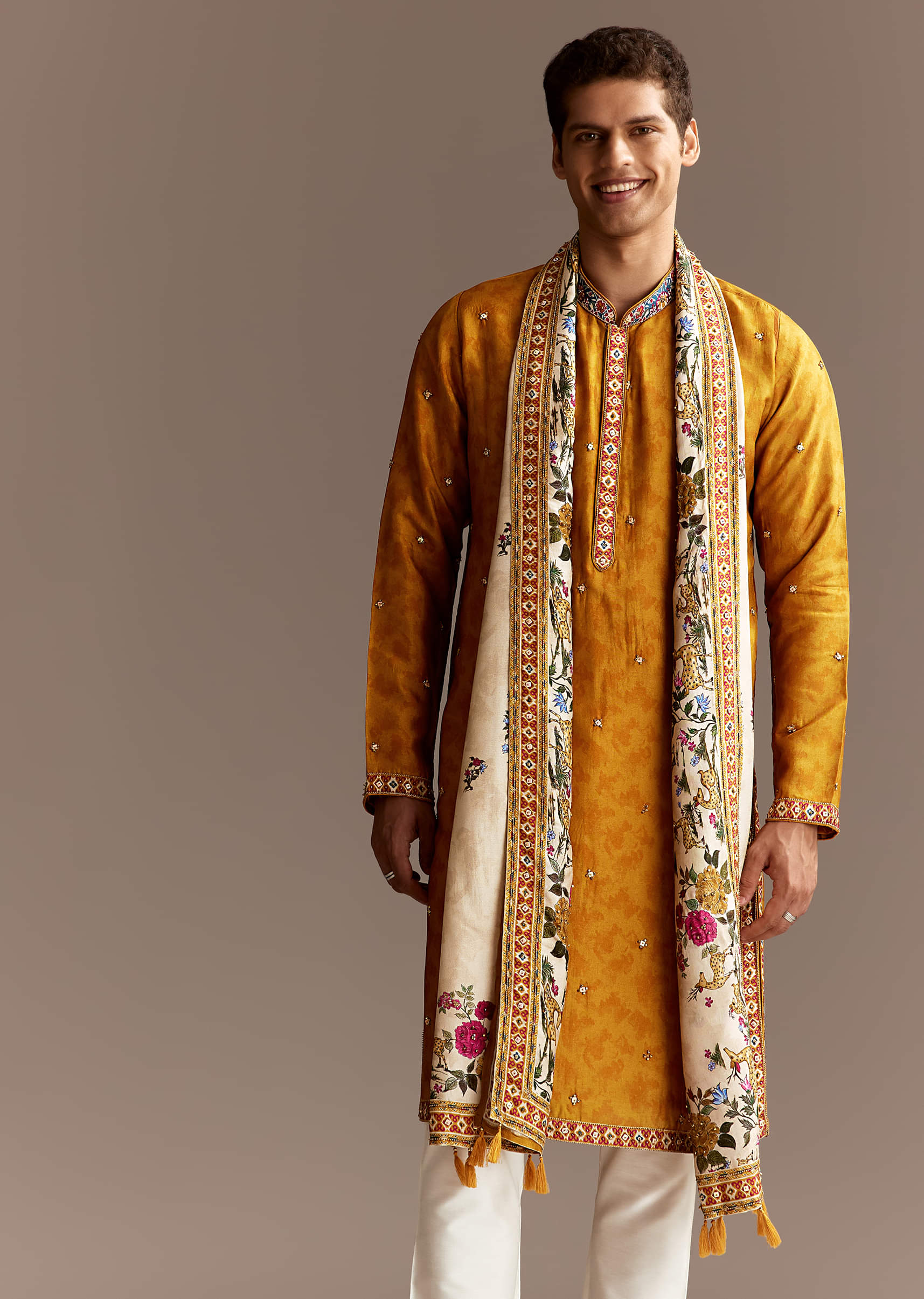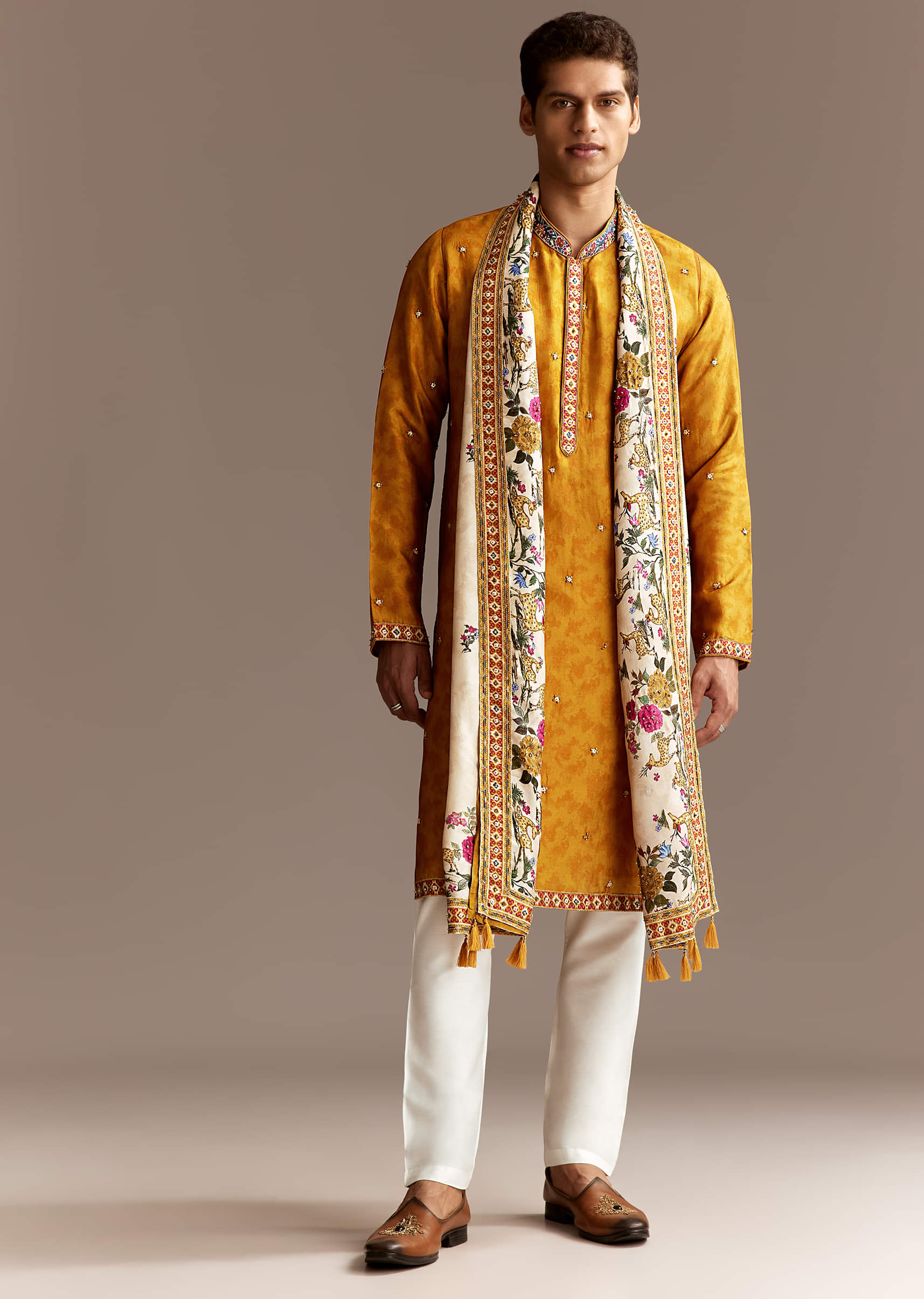 Crafted in a cheerful yellow hue, this kurta set is tailored with a mandarin collar and full sleeves—ideal for day-time festivities like haldi and mehendi. Its classic cut keeps things comfortable while still making a statement. Awarded as the Most Trusted Brand, we're delivering styles you love, just as promised.