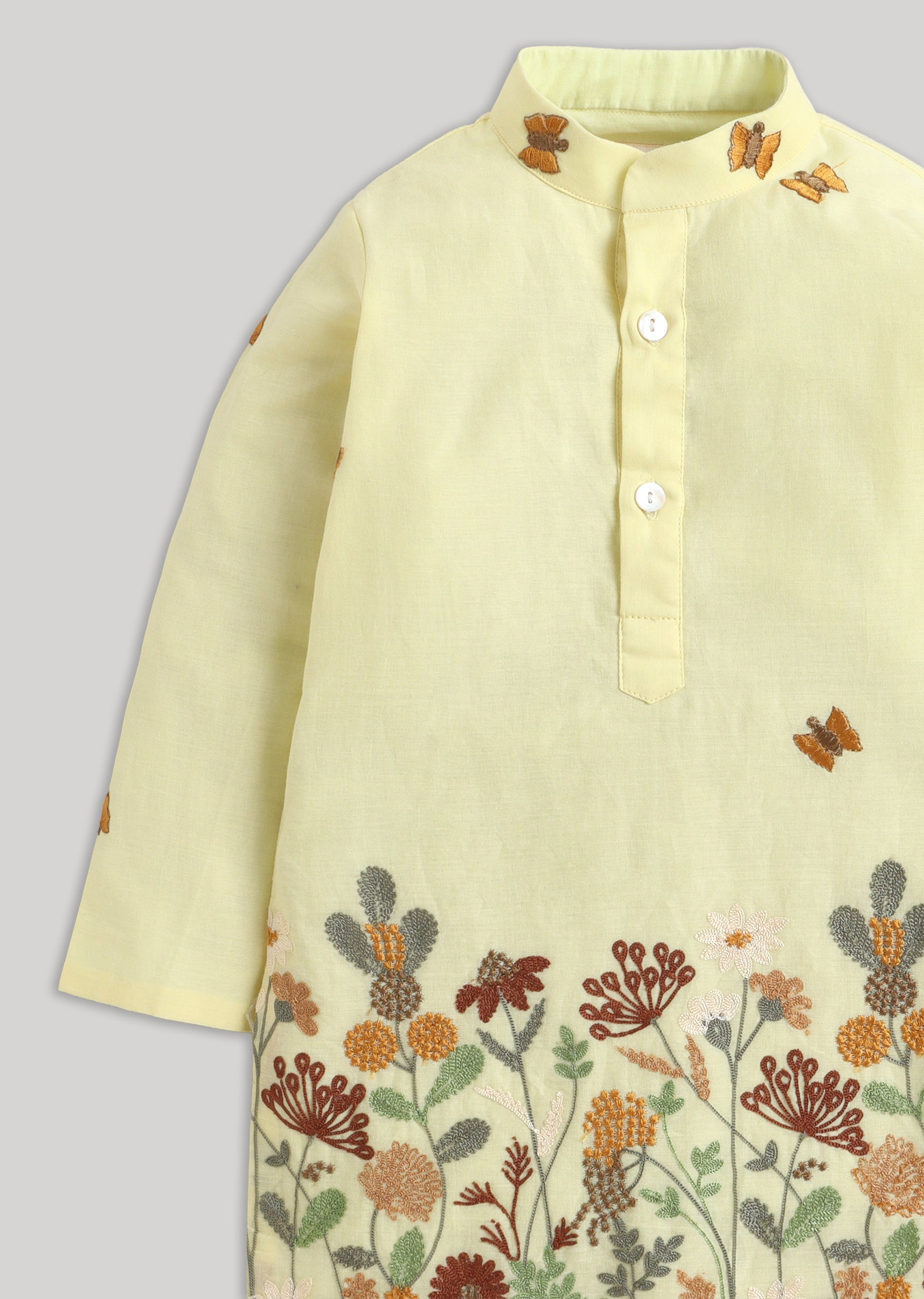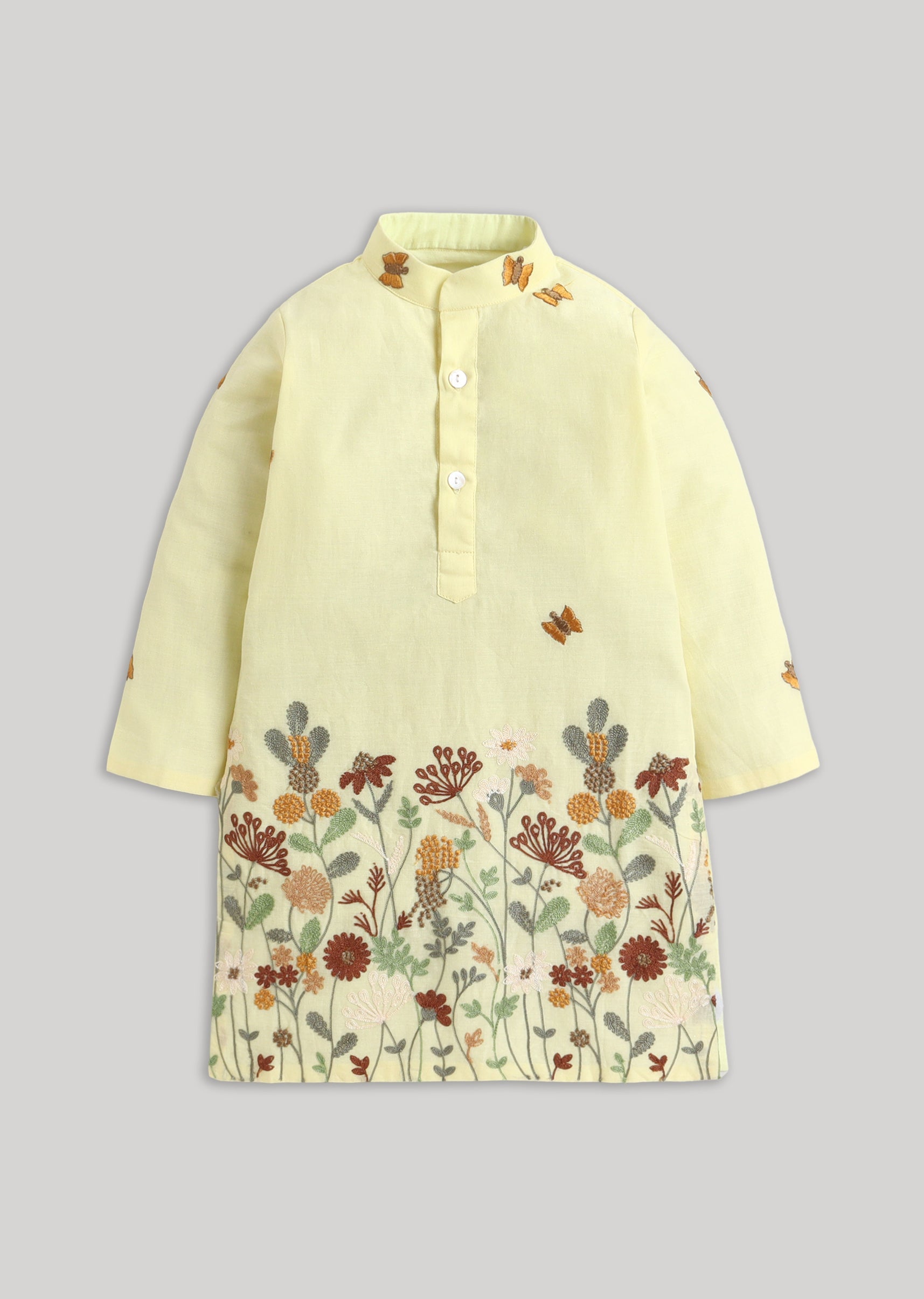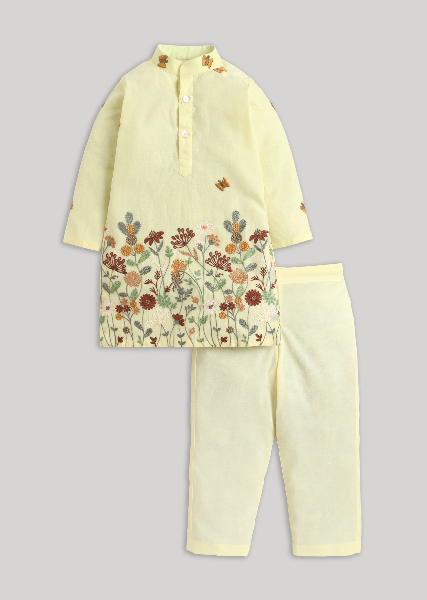 This kurta set is designed in a cheerful yellow tone with multicolour detailing for a bright festive look. Cotton fabric keeps it breathable and comfortable for kids. Embroidery elevates the... More Product Details
