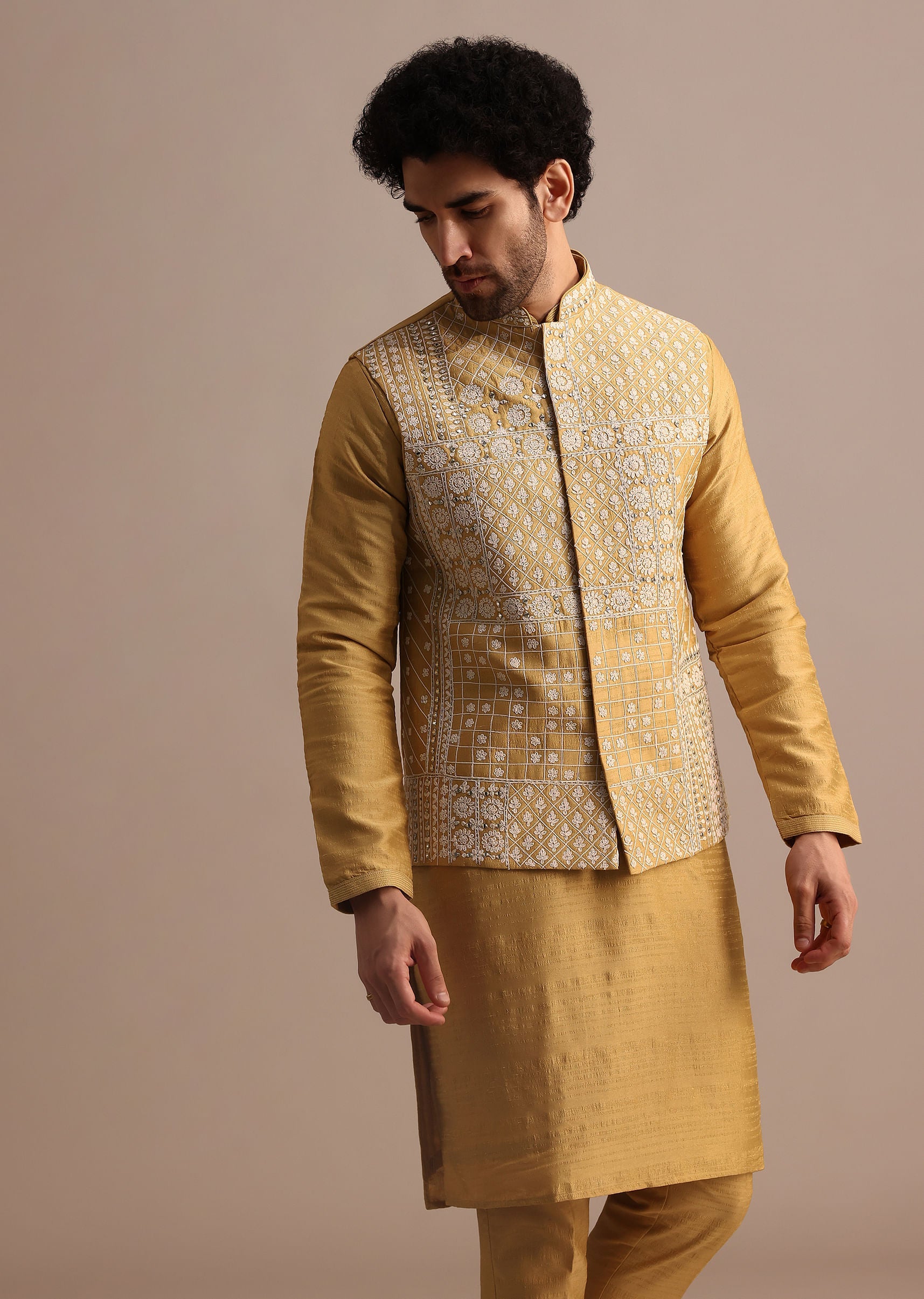 Make a grand entrance in this yellow raw silk kurta jacket set designed to impress. The kurta's intricate thread work adds a layer of sophistication while the jacket’s radiant mirror embroidery creates a captivating shimmer. Perfect for festive celebrations or upscale events. This kurta comes with a jacket and pants. Awarded as the Most Trusted Brand, we're delivering styles you love, just as promised.
