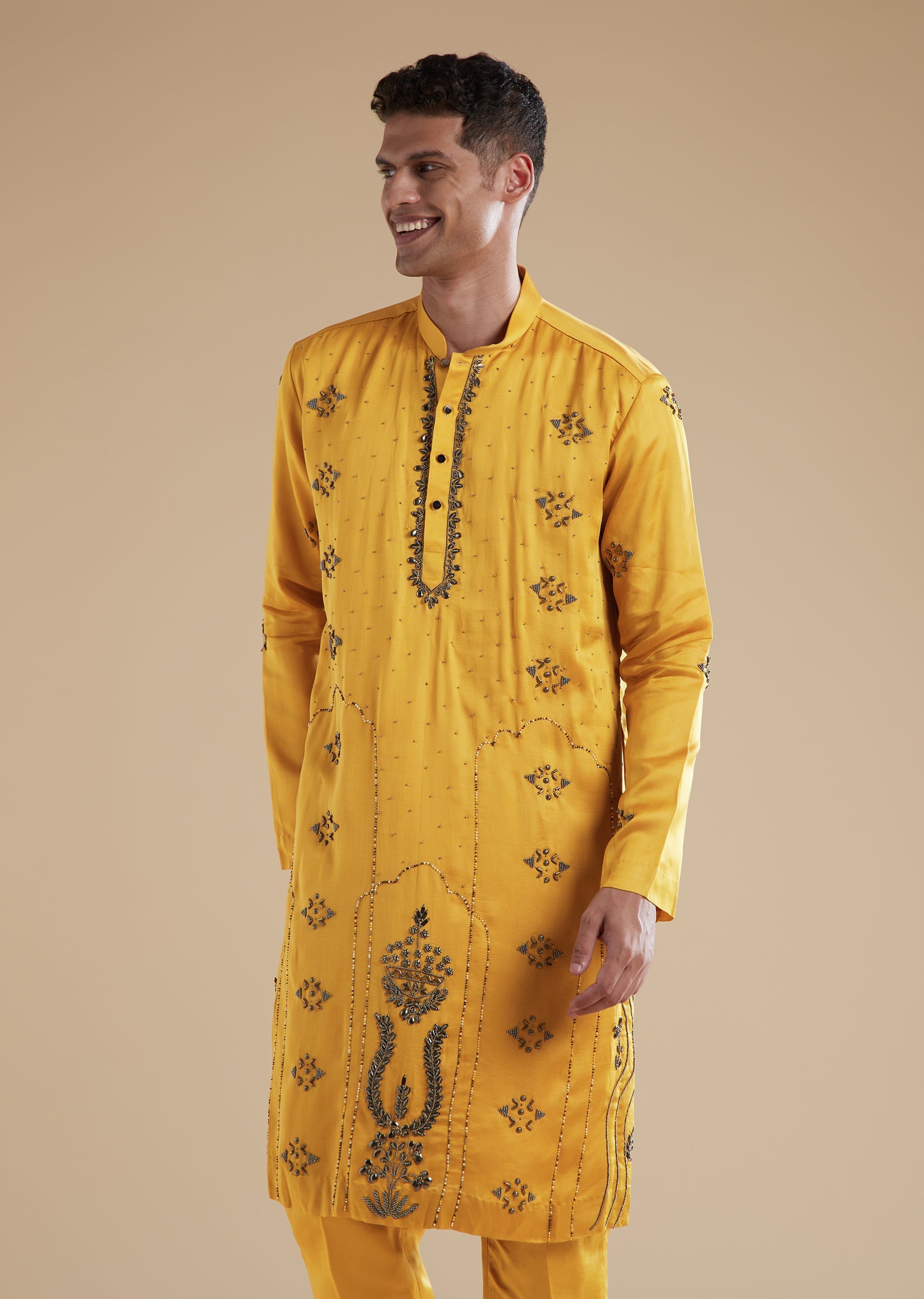 Yellow Linen Satin Mens Kurta Set with Metal Beads Detail Work
