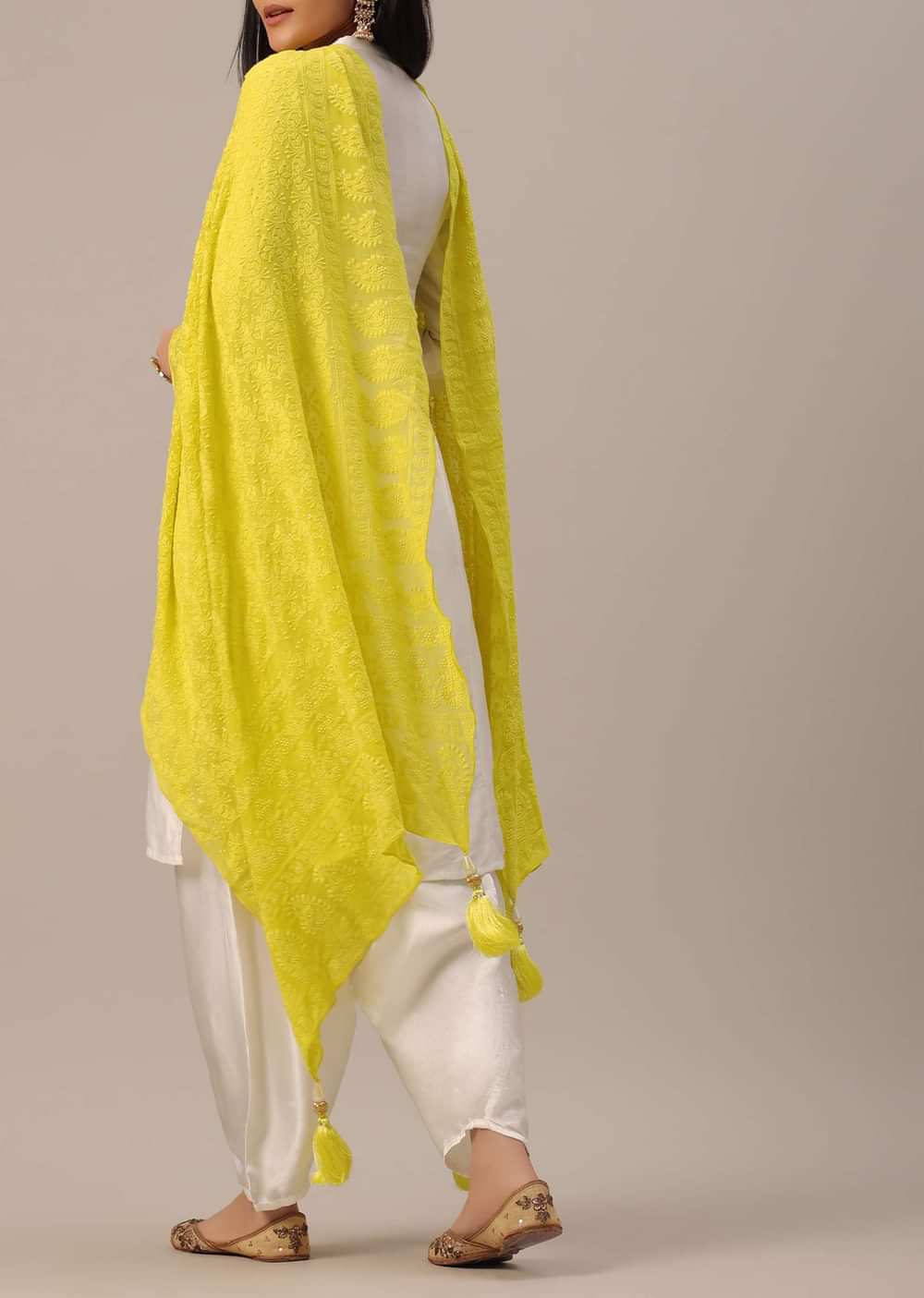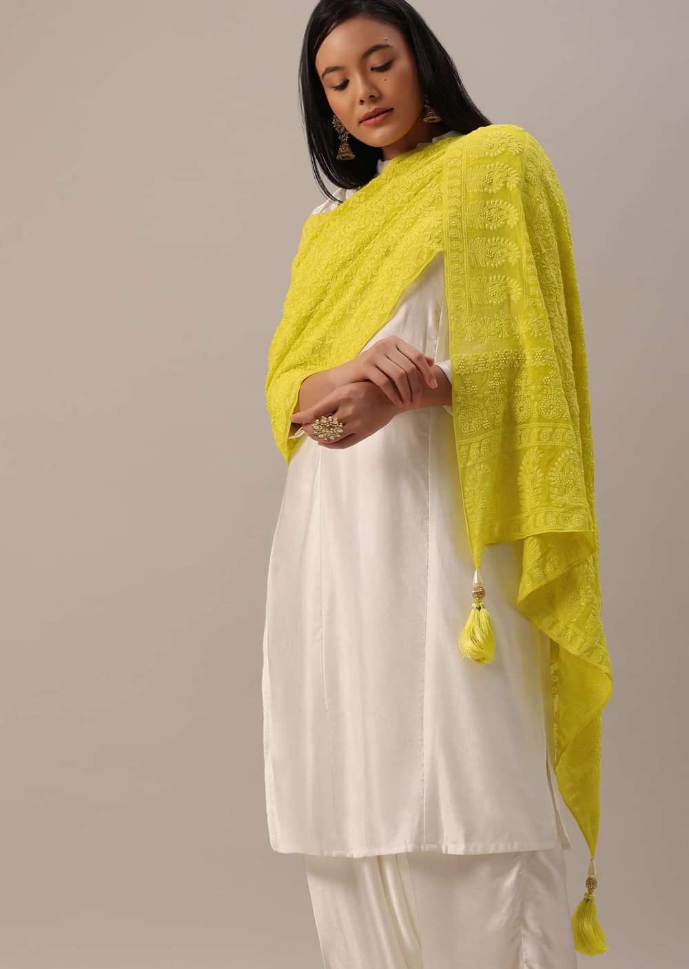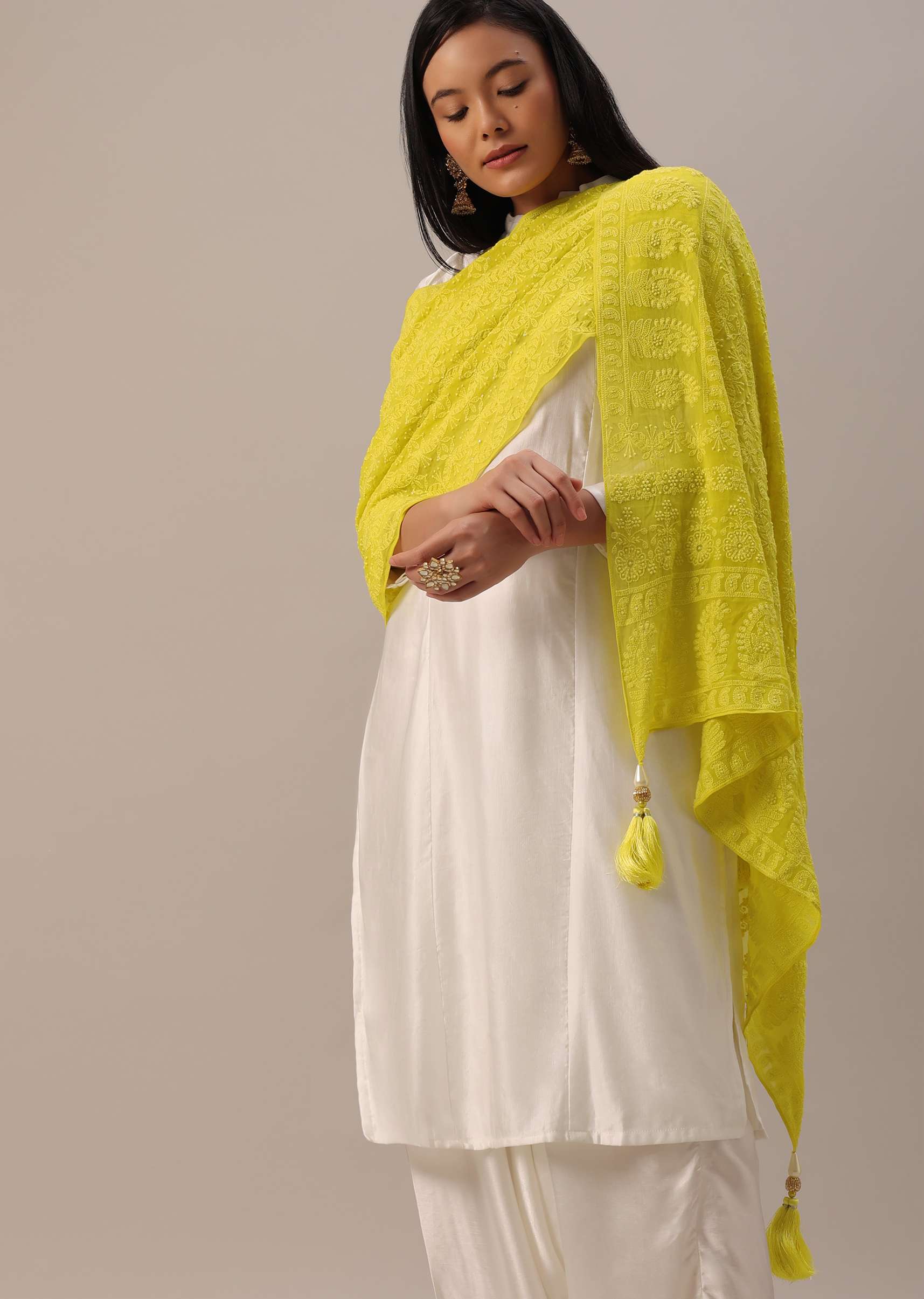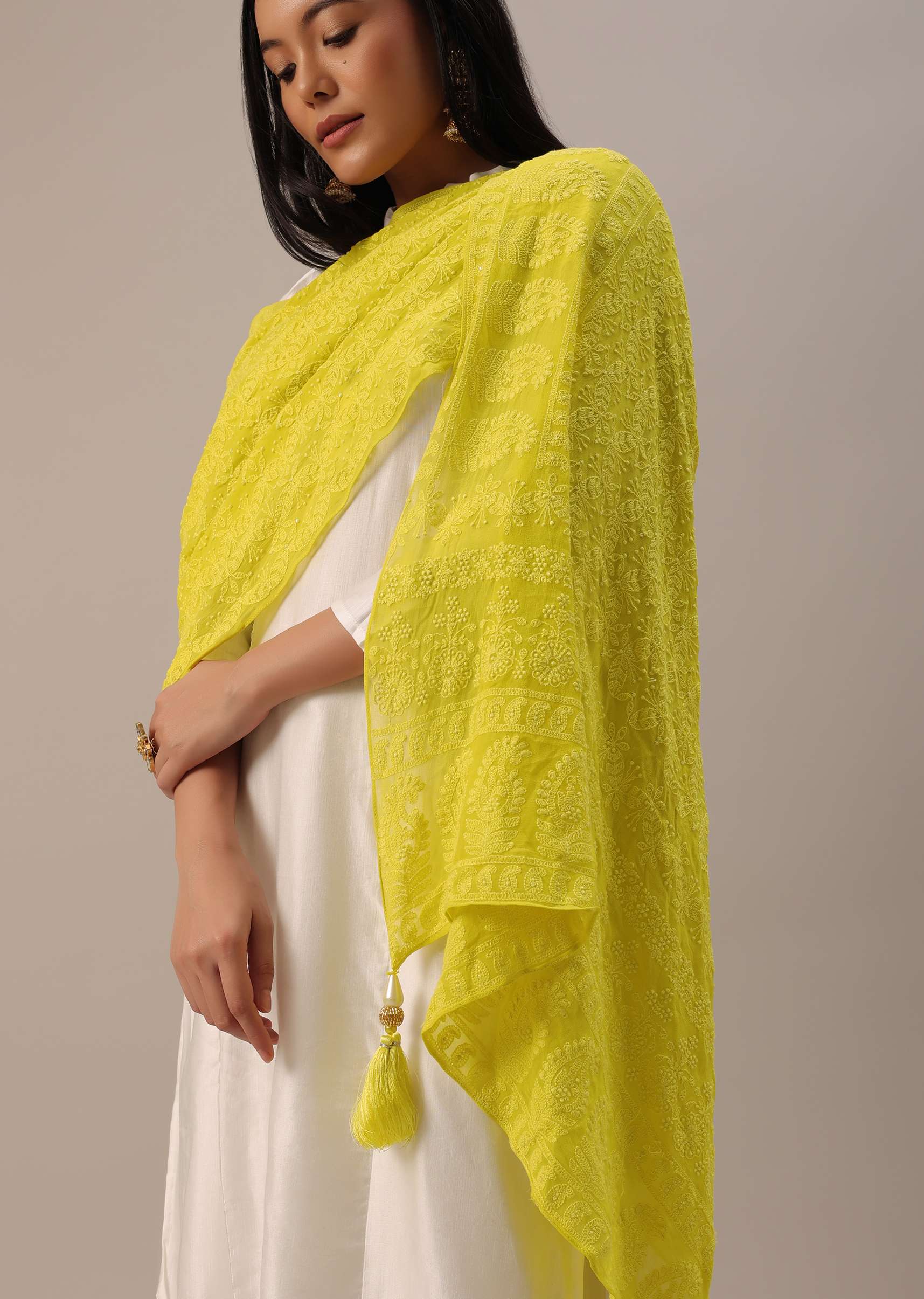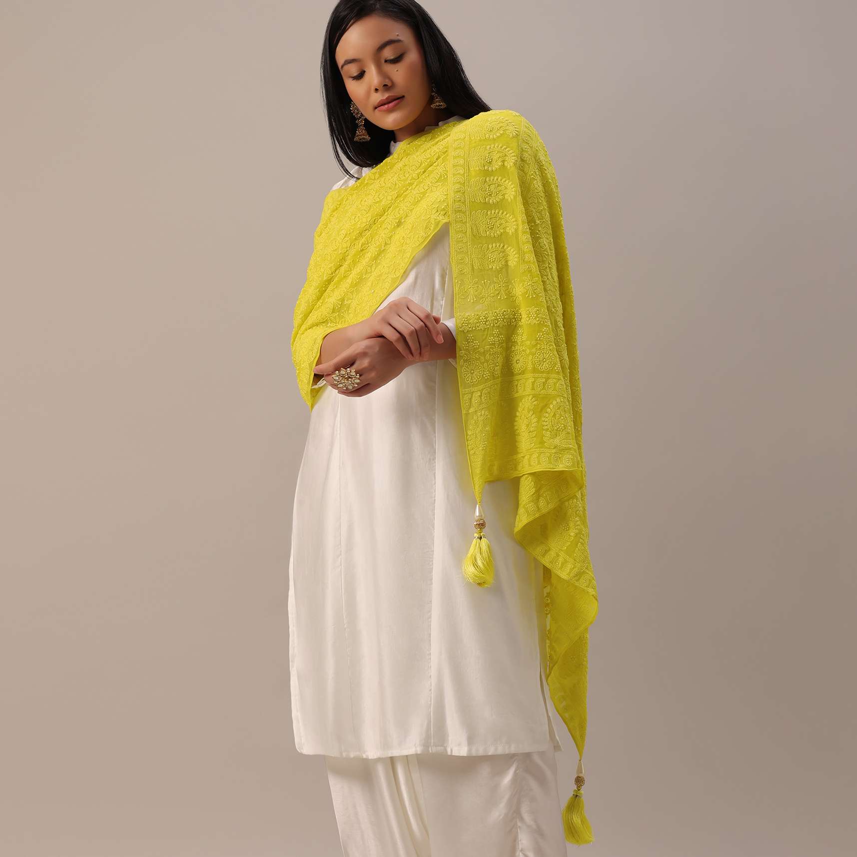 A captivating pick that is crafted from flowy chiffon in a vibrant lemon hue. Super lightweight and stylish, this stunner comes with tassel detailing on the border and Lucknowi work. A must-have in your day-to-day wardrobe, this dupatta goes well with all your-day-to-day ethnic office edits. Awarded As The Most Trusted Brand We'Re Delivering Styles You Love Just As Promised.