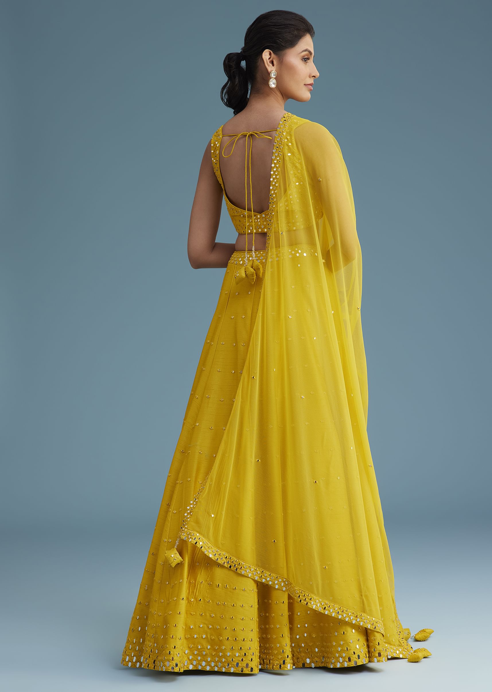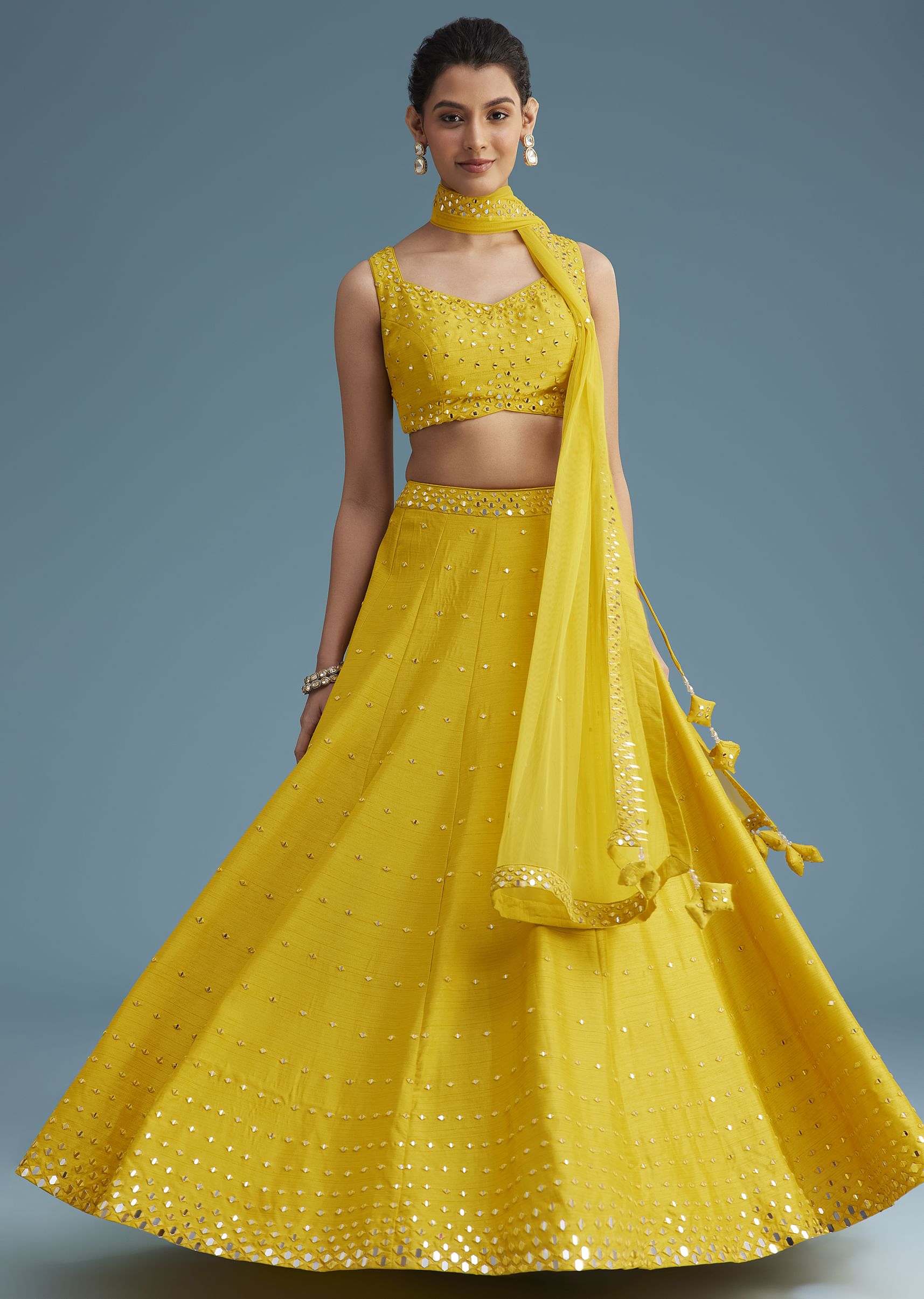 - This radiant yellow Nysa silk lehenga set is beautifully embellished with delicate mirror work, adding a touch of sparkle to the soft, luxurious fabric.