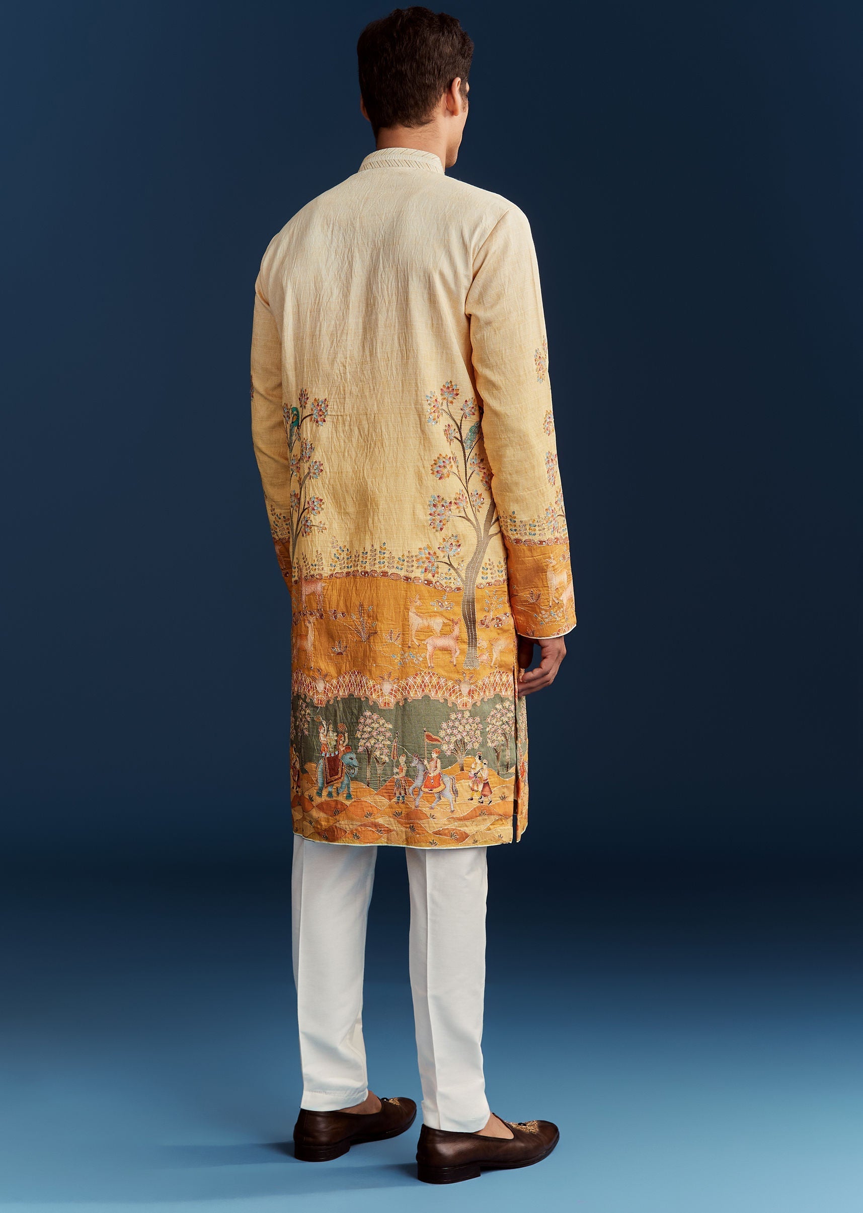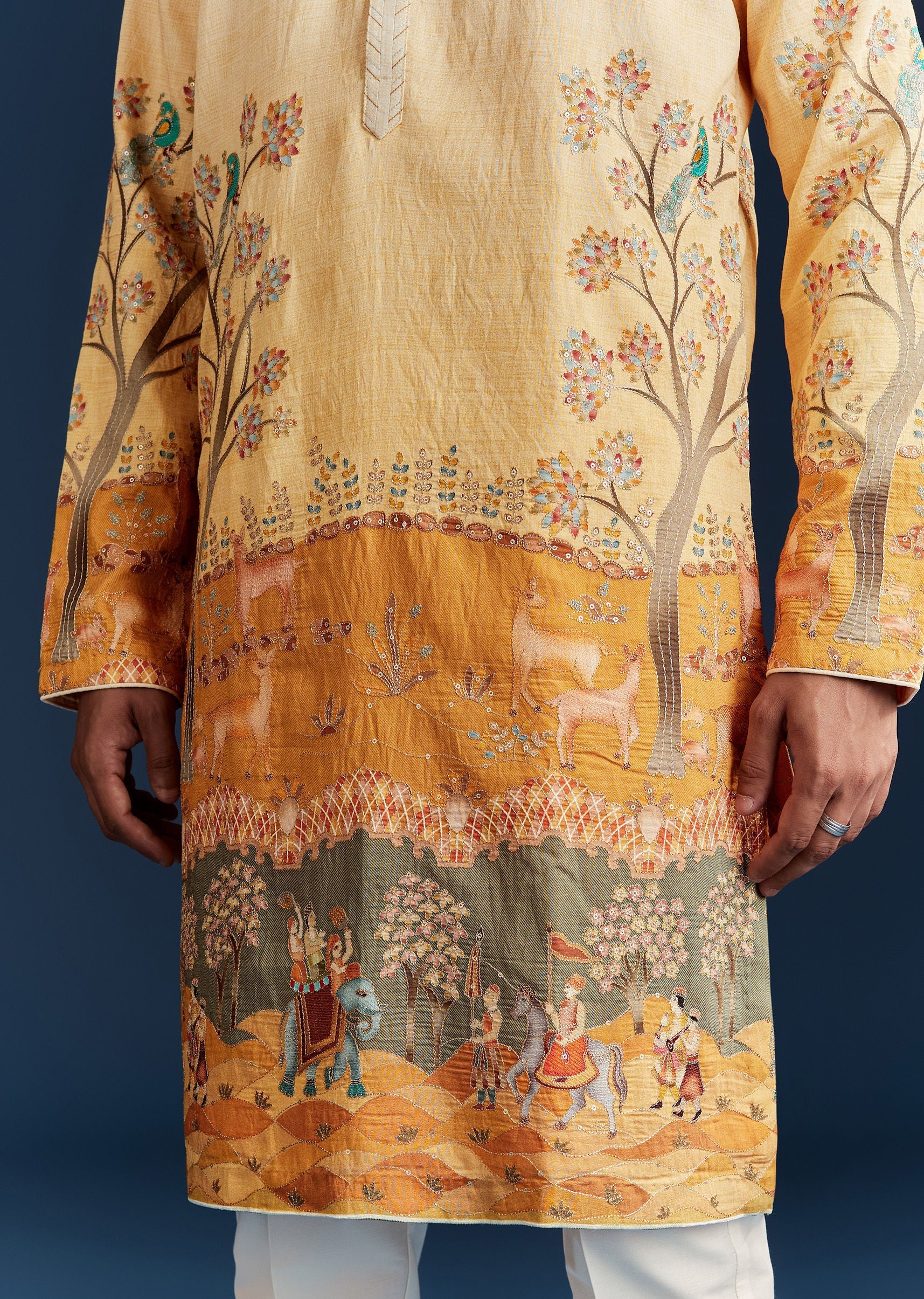 Yellow Ombre Silk Kurta Set With Floral And Animal Print Motifs