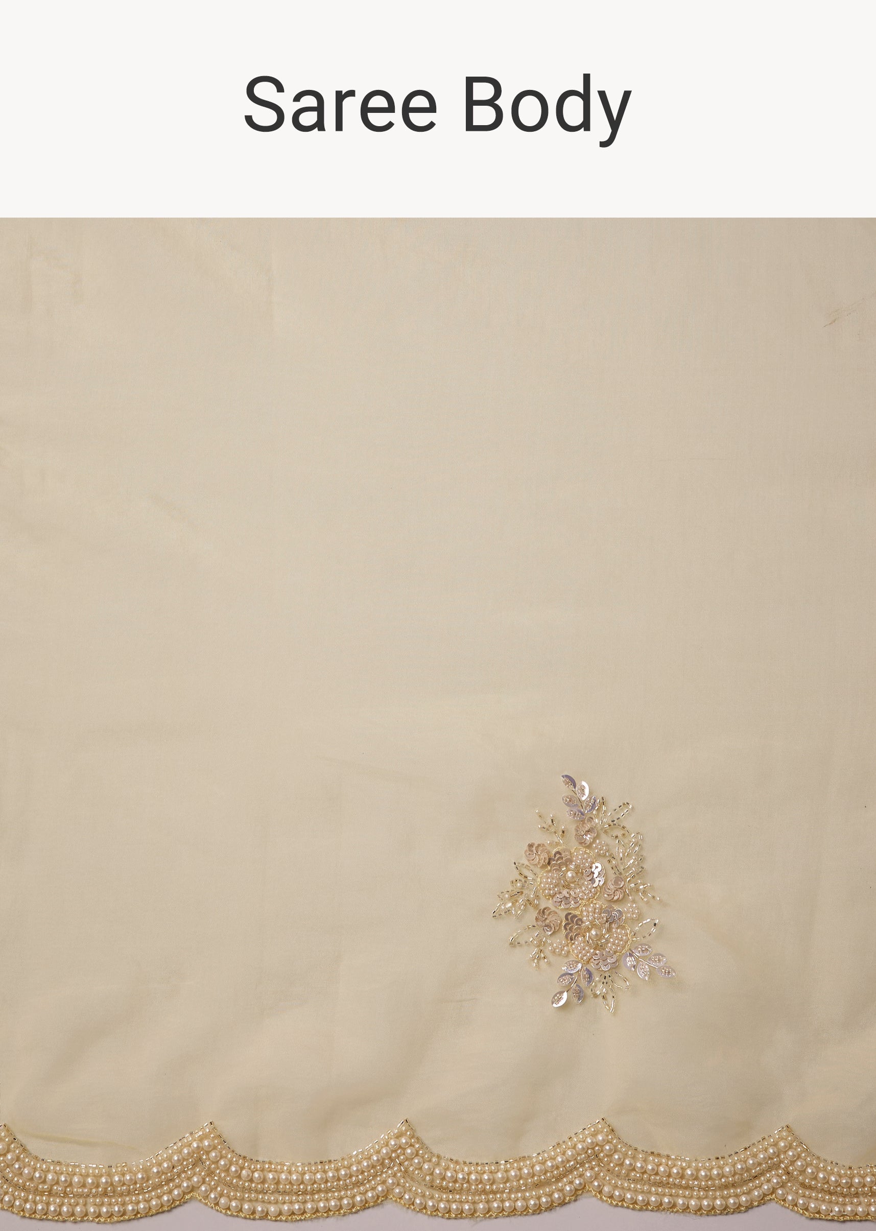 Crafted from soft organza, this saree exudes a graceful airy appeal, enhanced with a scallop border and delicate butti embroidery crafted with pearls, sequins, beads, and cut dana for a... More Product Details