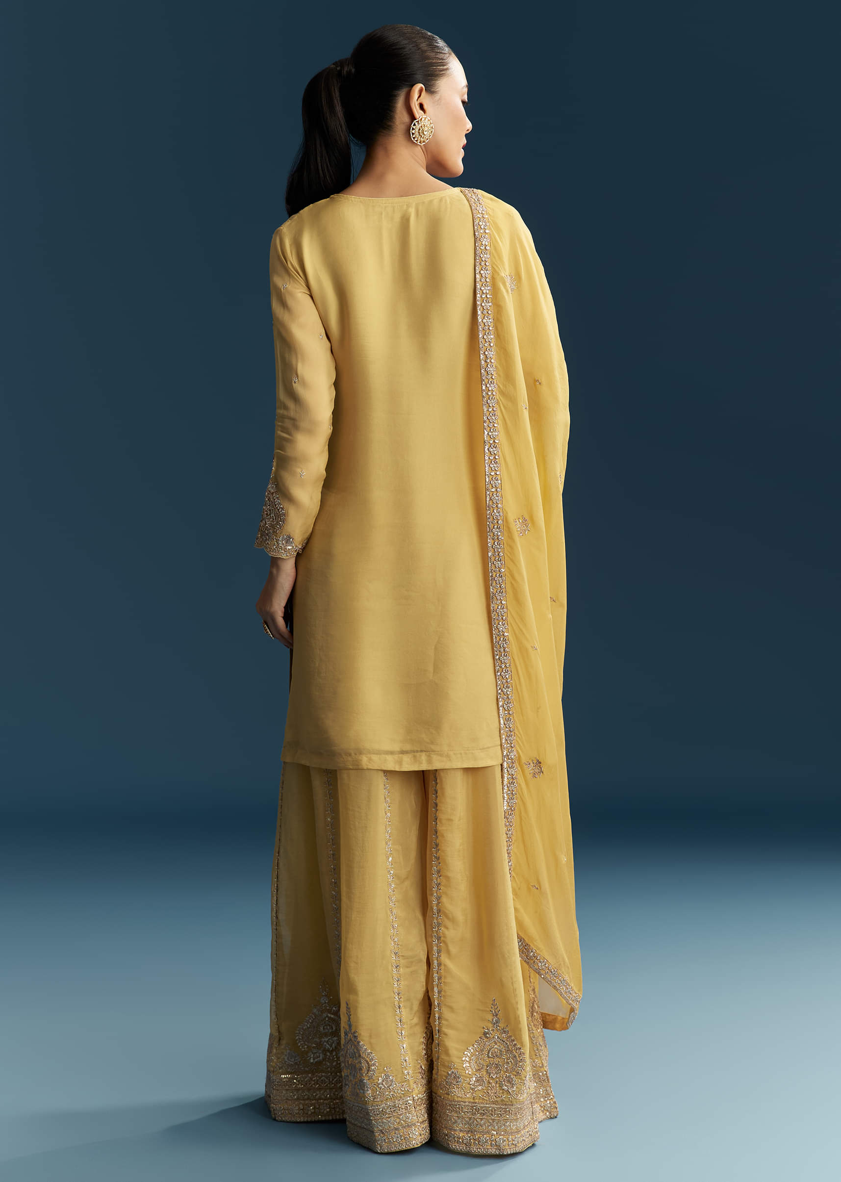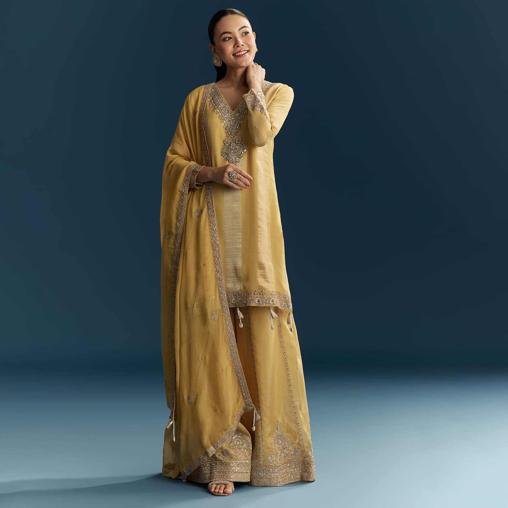 Yellow Organza Palazzo Suit With Zari And Mirror Embroidery