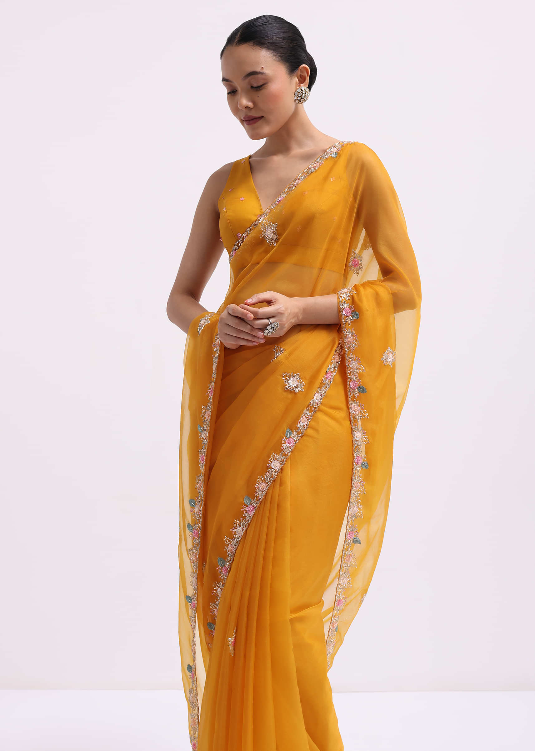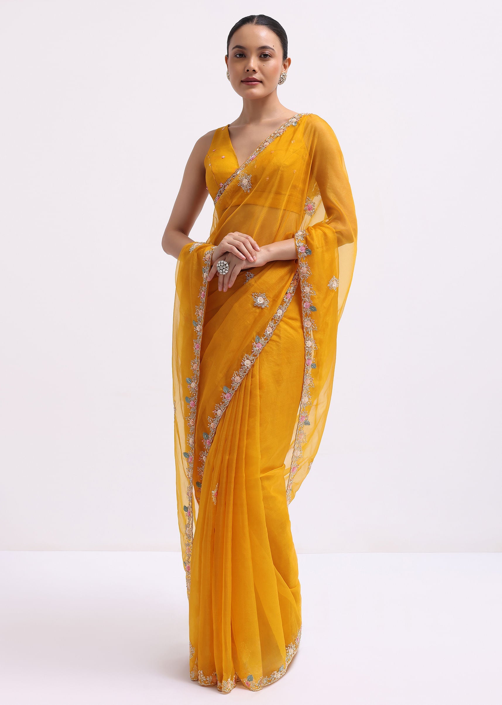 Dive into luxury with our stunning yellow saree, meticulously crafted to capture the essence of festive elegance. Fashioned from indulgent organza fabric and embellished with detailed 3D sequined floral embroidery and a cutdana scallop border, this ensemble radiates sophistication and opulence. Complemented by an unstitched blouse. Awarded as the Most Trusted Brand, we're delivering styles you love, just as promised.
