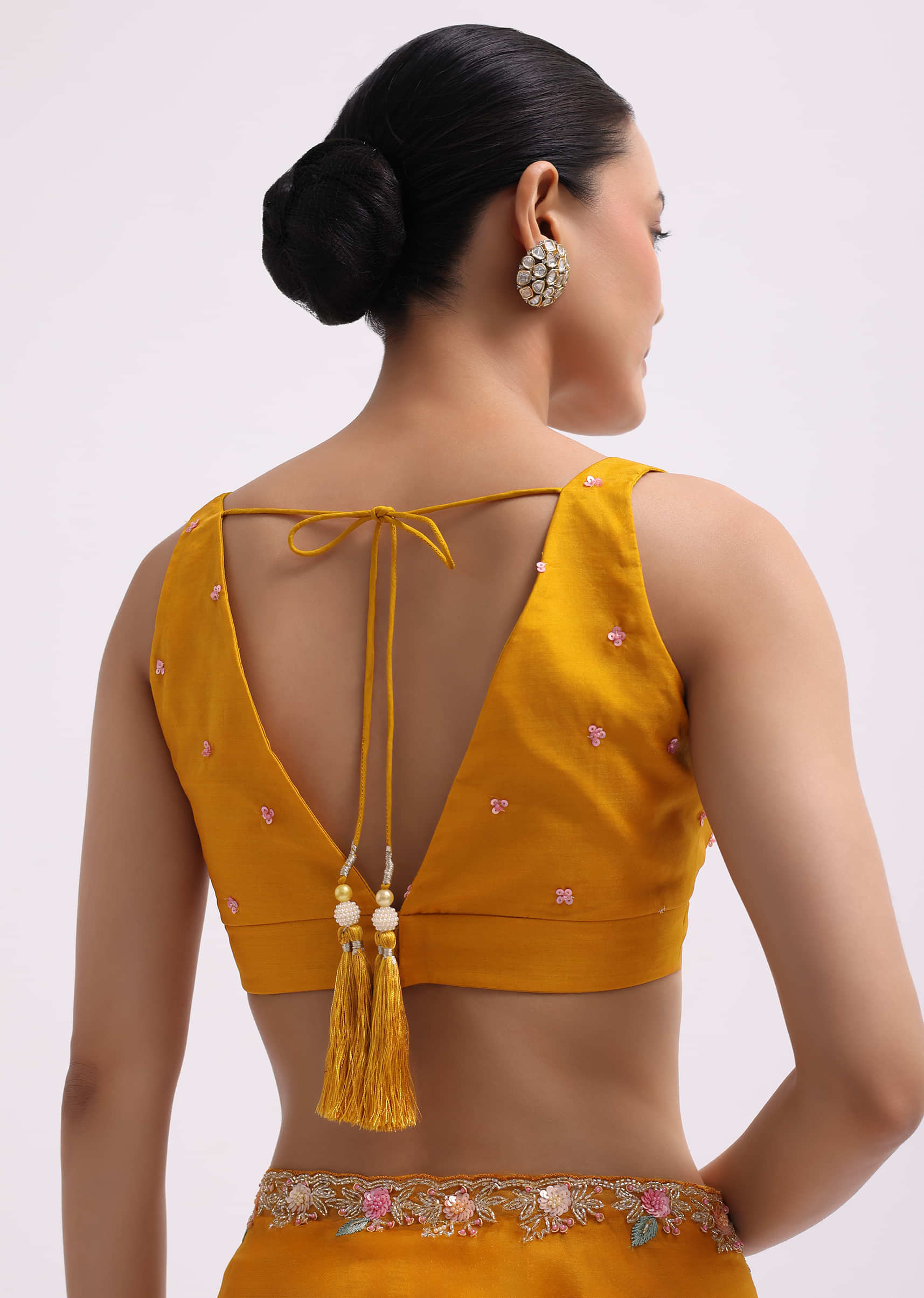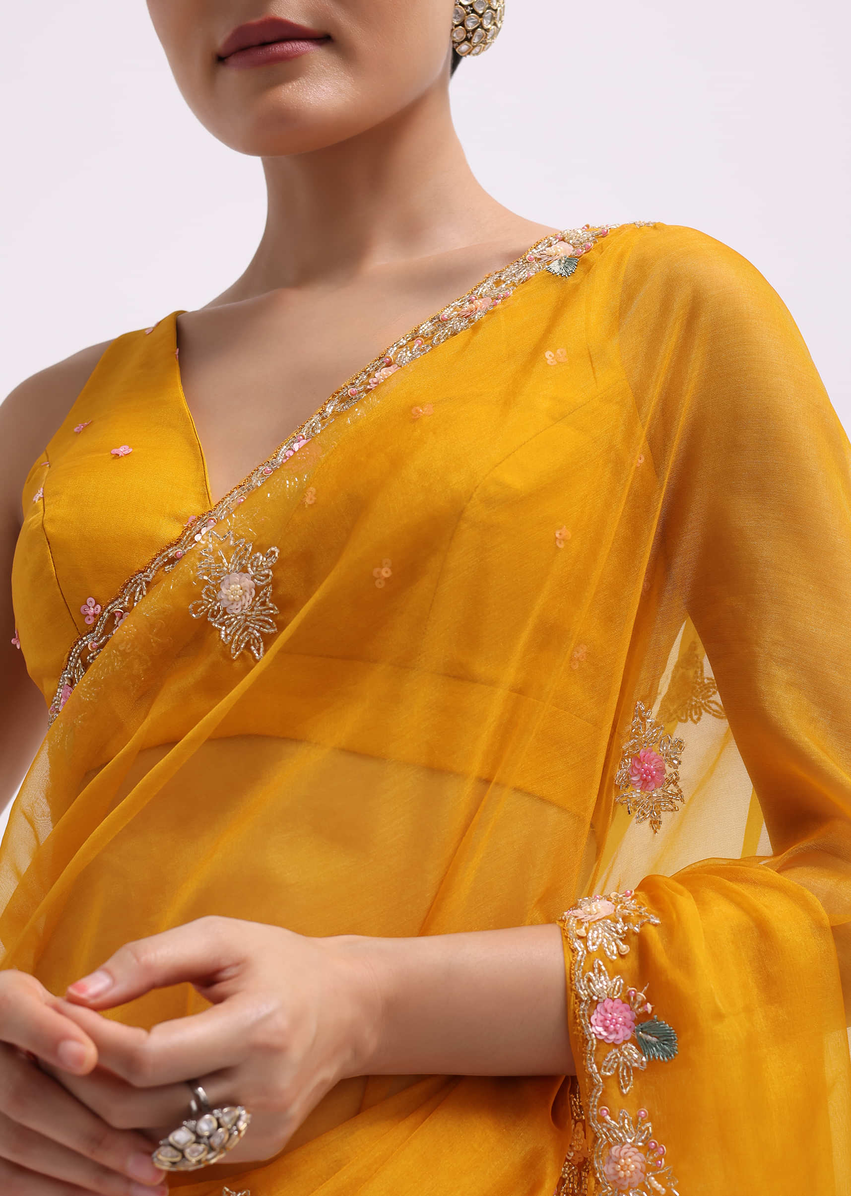 Yellow Organza Saree In 3D Sequins With Unstitched Blouse