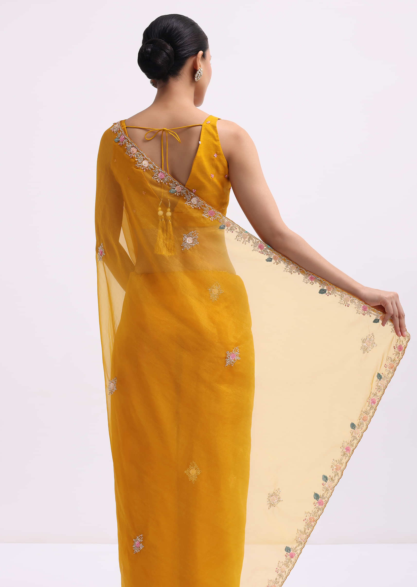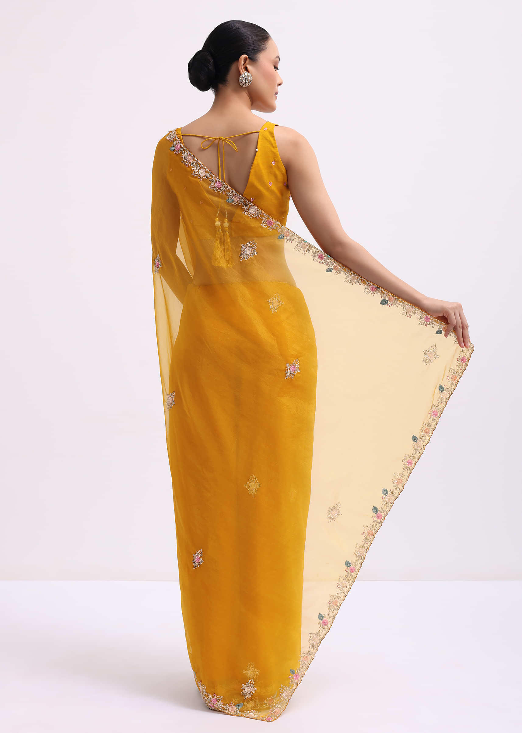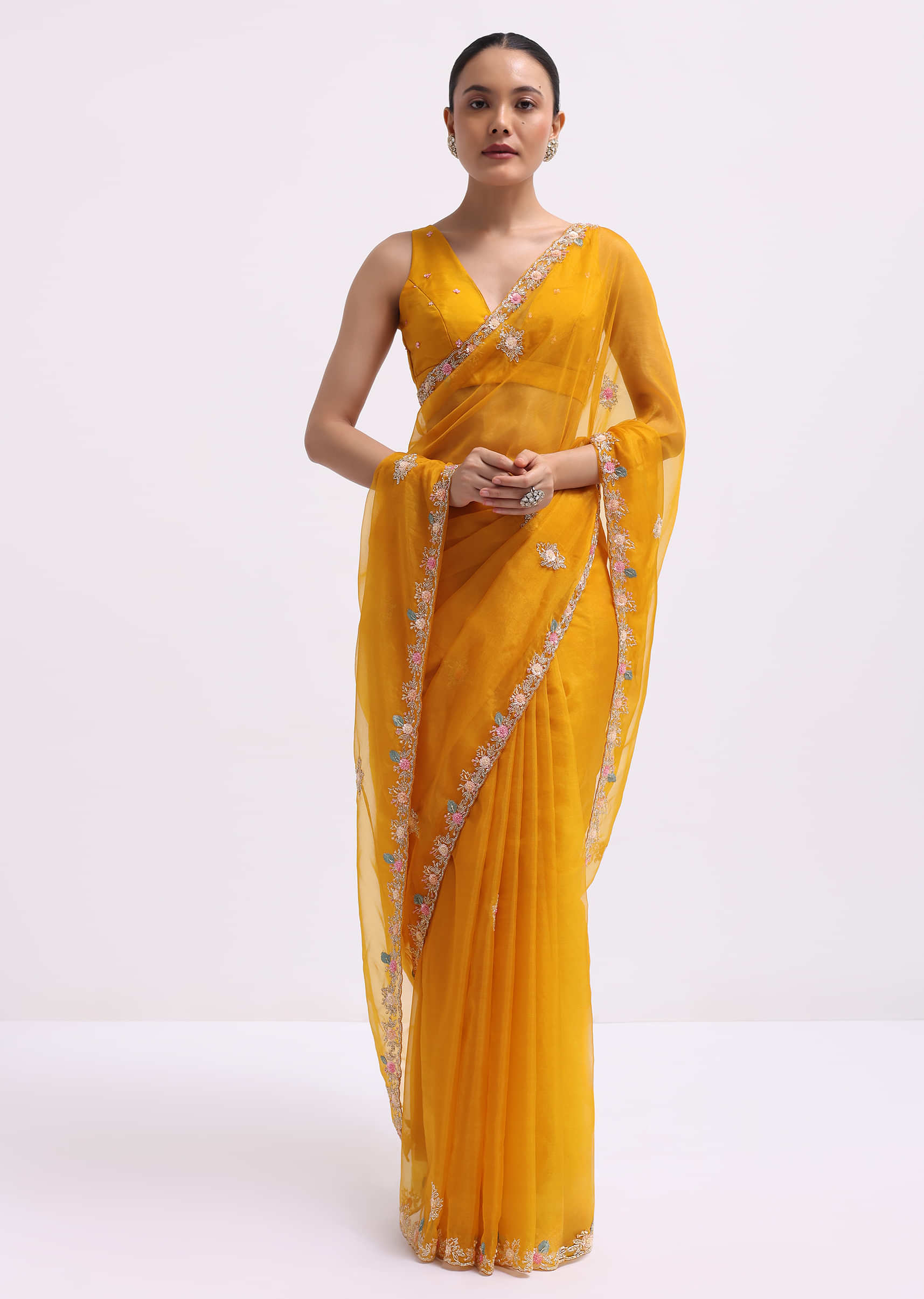 Dive into luxury with our stunning yellow saree, meticulously crafted to capture the essence of festive elegance. Fashioned from indulgent organza fabric and embellished with detailed 3D sequined floral embroidery... More Product Details