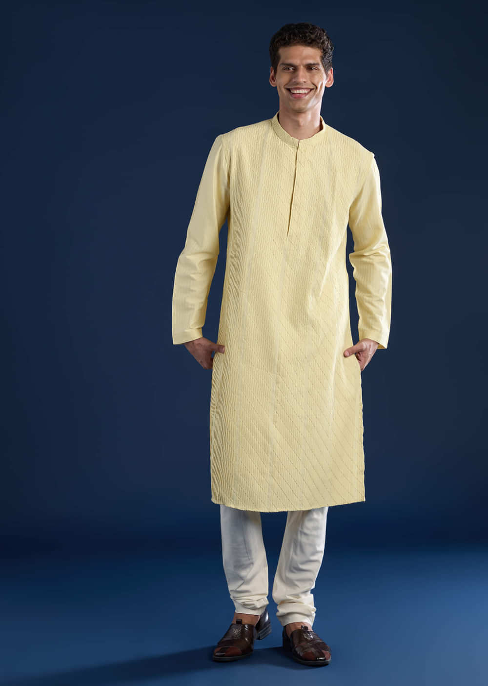 Embrace classic sophistication with this yellow art silk men’s kurta set, featuring elegant pintuck detailing that adds texture and refinement to its minimalist design. The smooth silk fabric offers a subtle sheen and graceful drape, making it an ideal choice for festive occasions, weddings, or cultural events. This ensemble effortlessly combines modern simplicity with timeless elegance. Awarded as the Most Trusted Brand, we're delivering styles you love, just as promised.