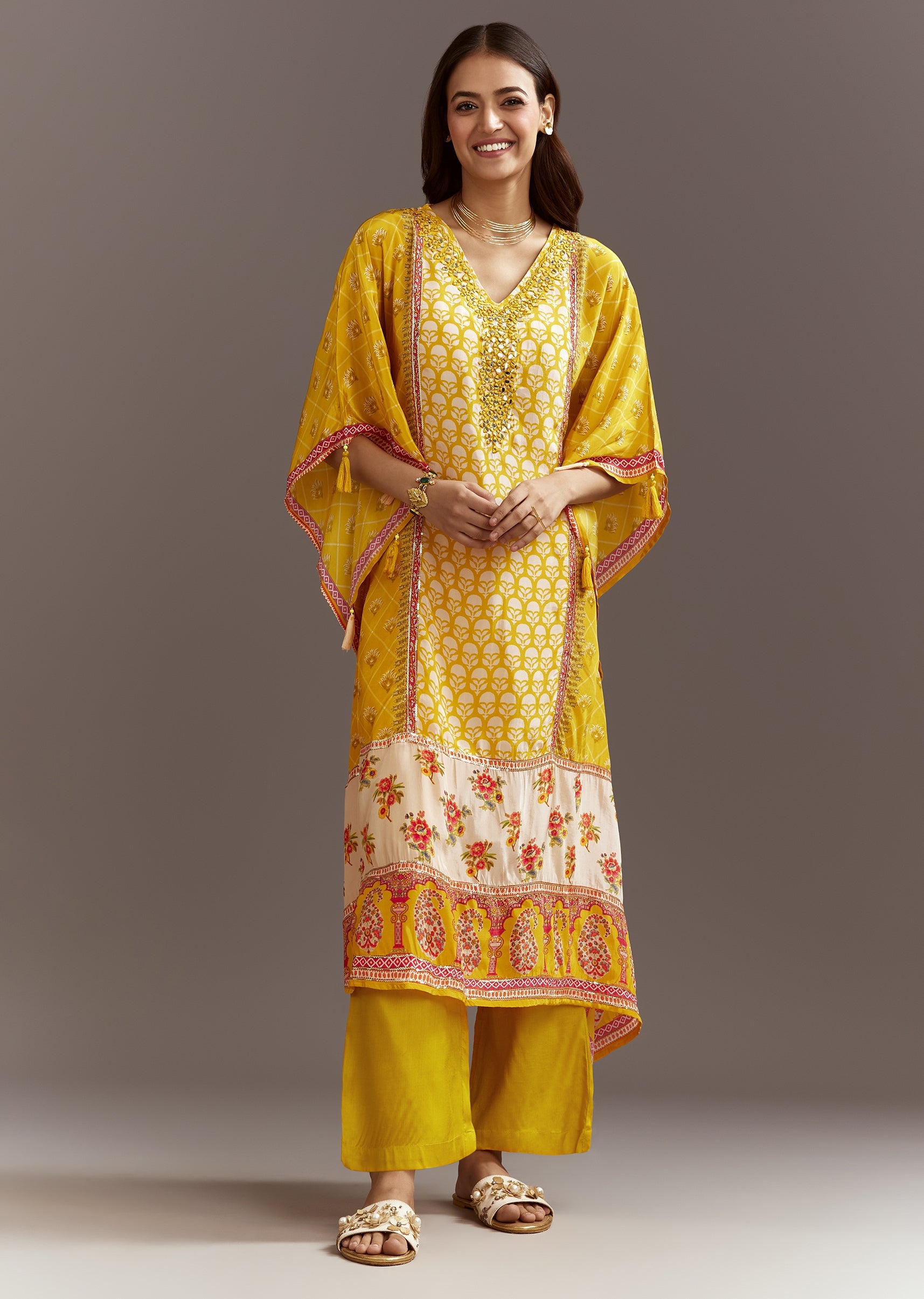 Yellow Printed Crepe Kaftaan Kurta Pant Set With Mirror And Sequins Work